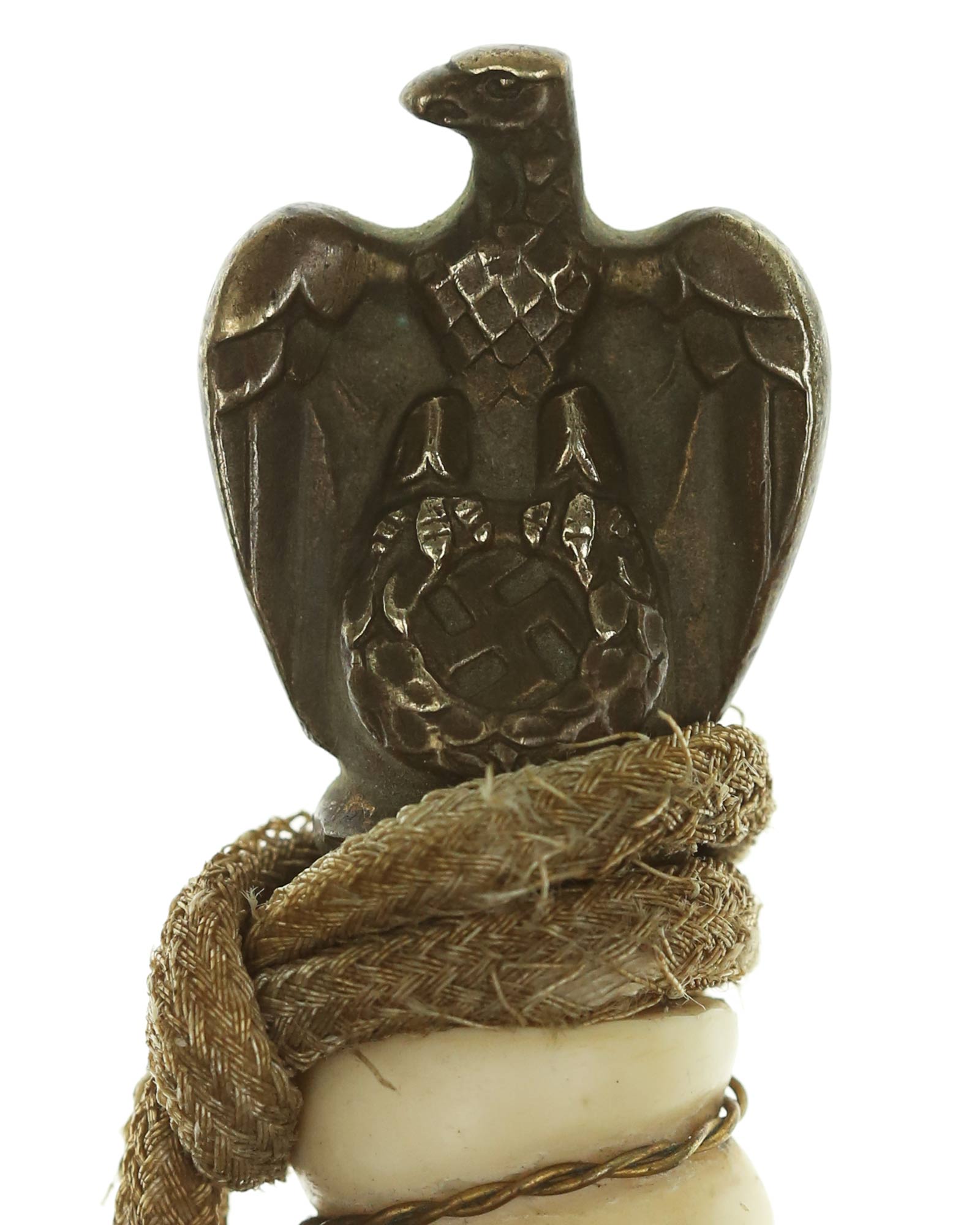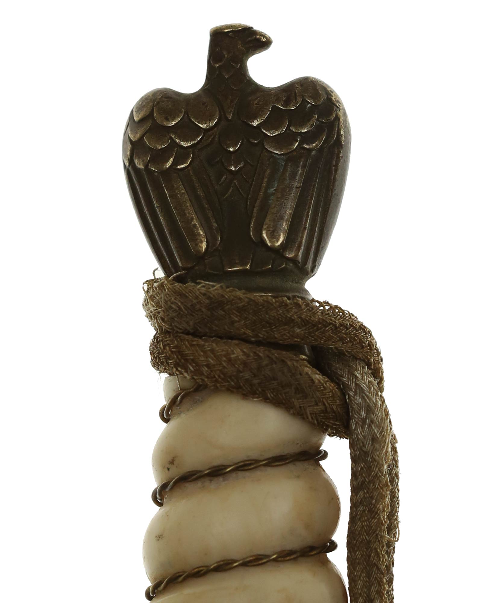Рукоять: Рукоять овального сечения, бочкообразная, из пластика. По спиральному желобку рукоять обвита стальной проволокой. Головка рукояти выполнена в виде орла, держащего в лапах венок с изображением свастики. В центре крестовины имеется кнопка пружинной защёлки фиксатора кортика в ножнах.