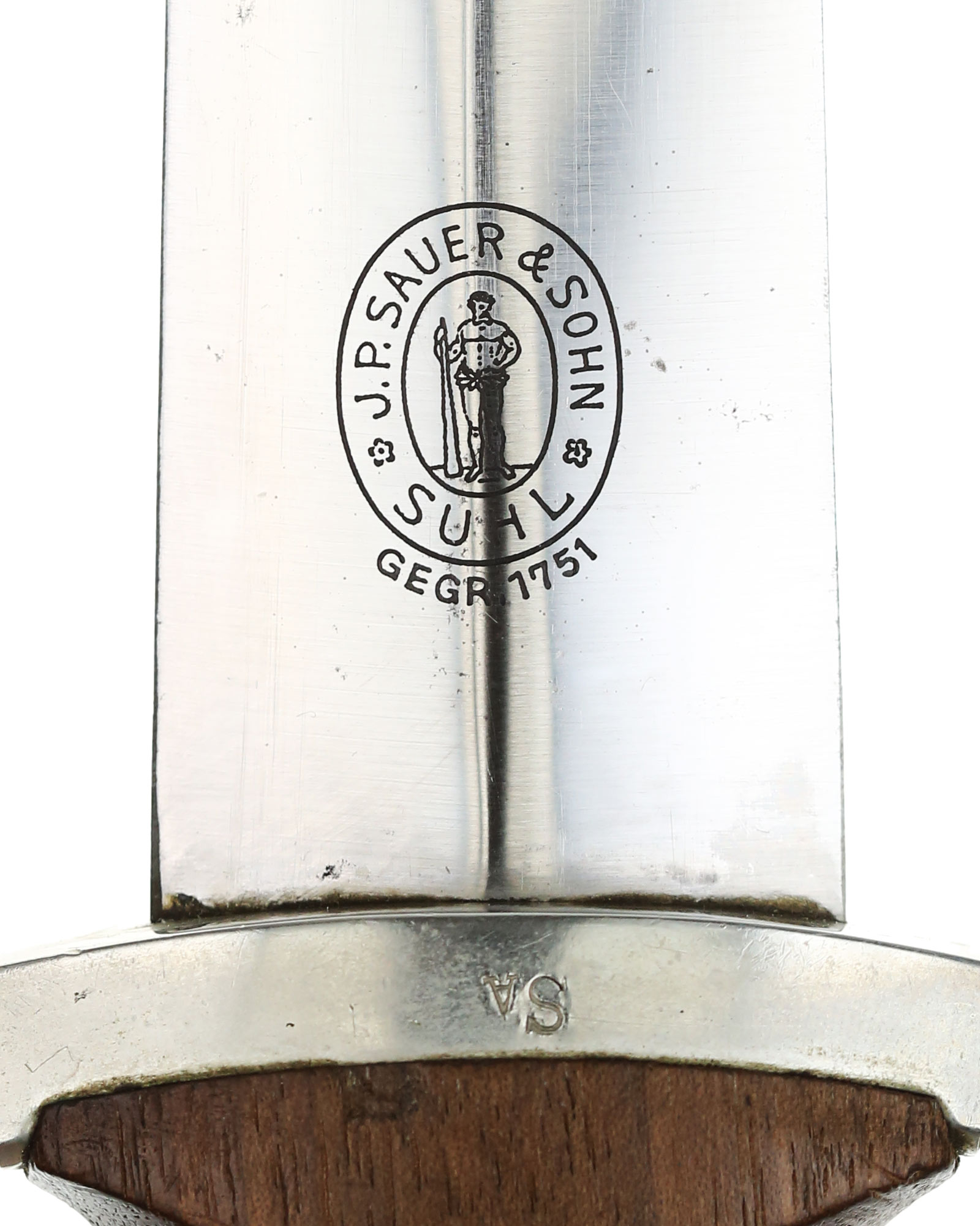 Клинок: Клинок кинжала прямой, стальной, двулезвийный, кинжального типа, с выраженным центральным ребром. На одной стороне клинка методом травления нанесен девиз СА «Всё для Германии» (Alles für Deutchland). Клинок на оборотной стороне у основания стоит клеймо производителя Зауэр & сын 1751 г., Зуль (J.P. Sauer & Sohn, Suhl).