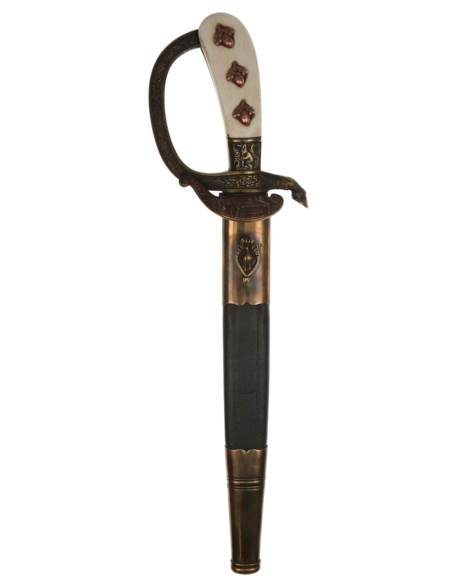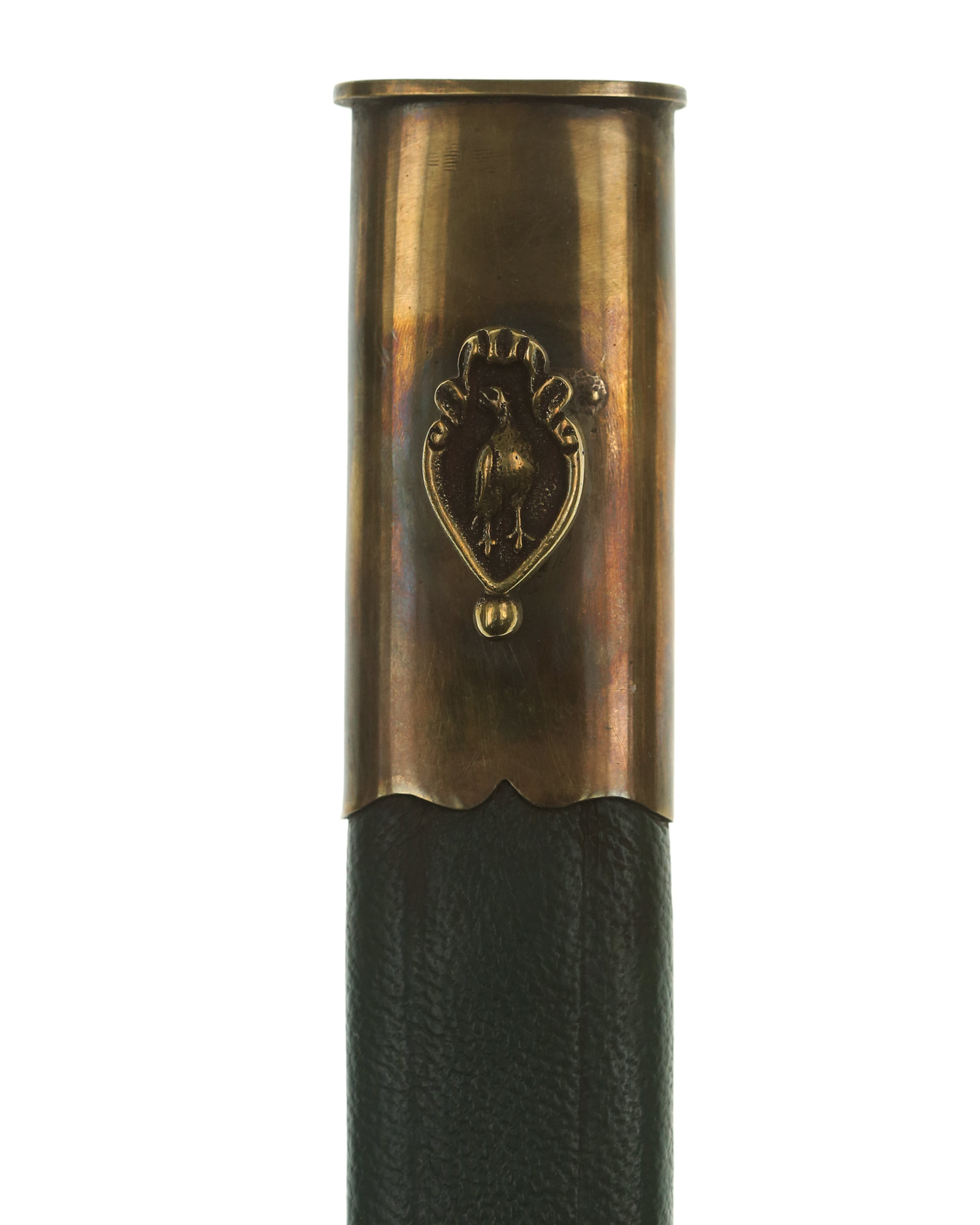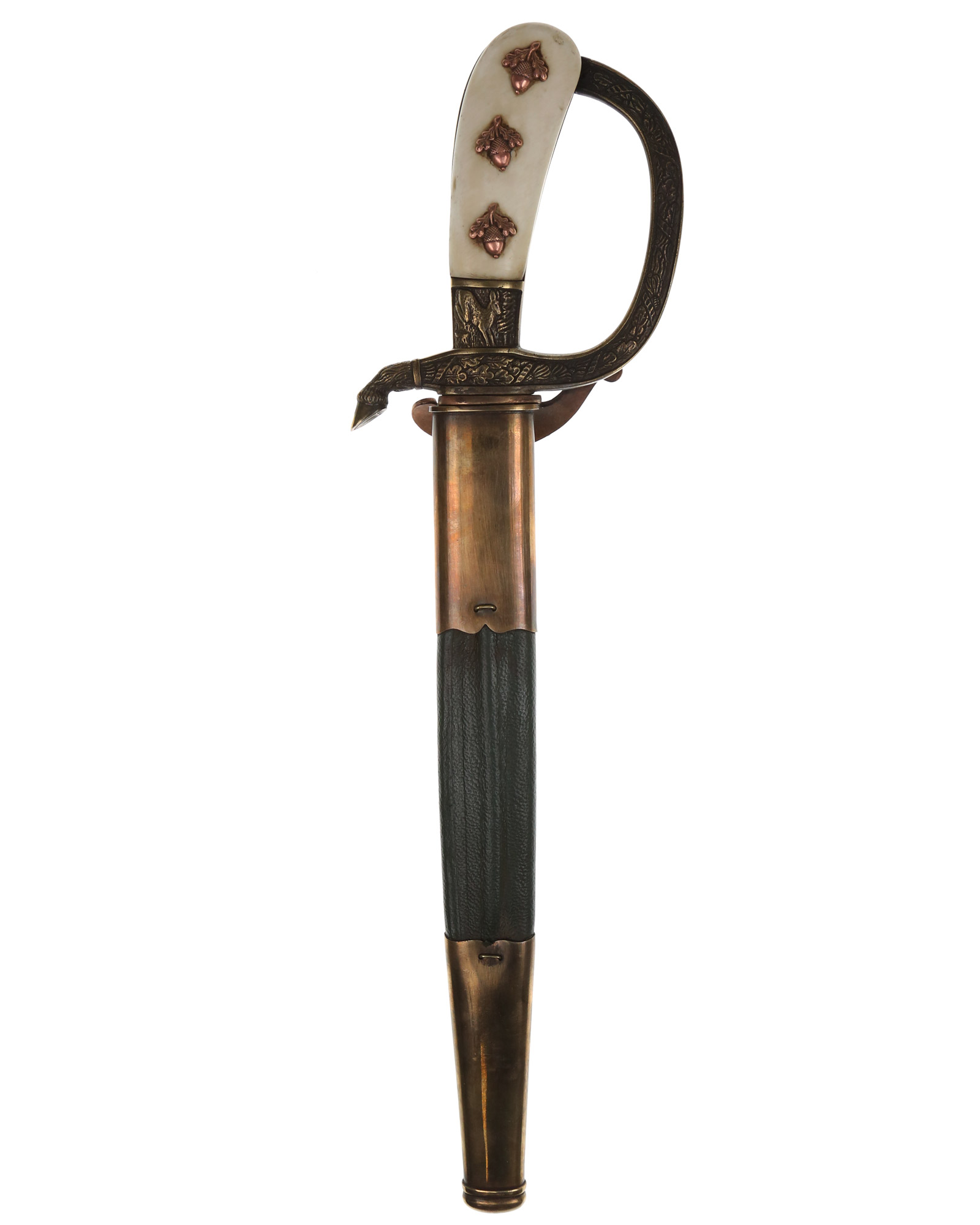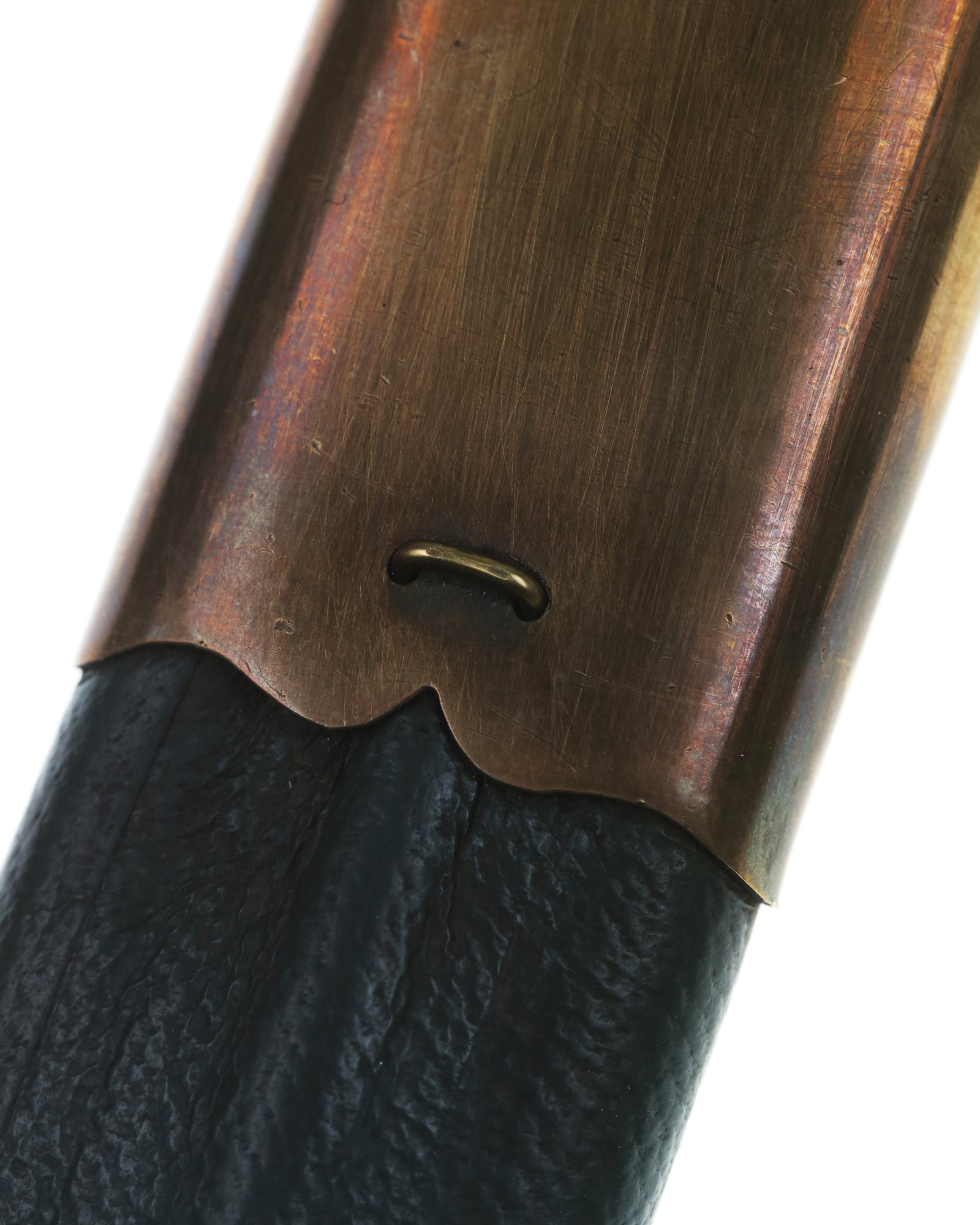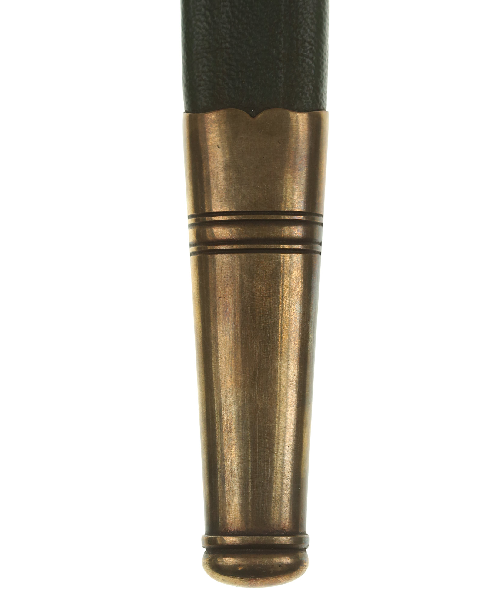 Ножны: Ножны деревянные, обтянутые черной кожей. Прибор ножен латунный, состоит из длинного устья со шпеньком в виде желудя и длинного наконечника.