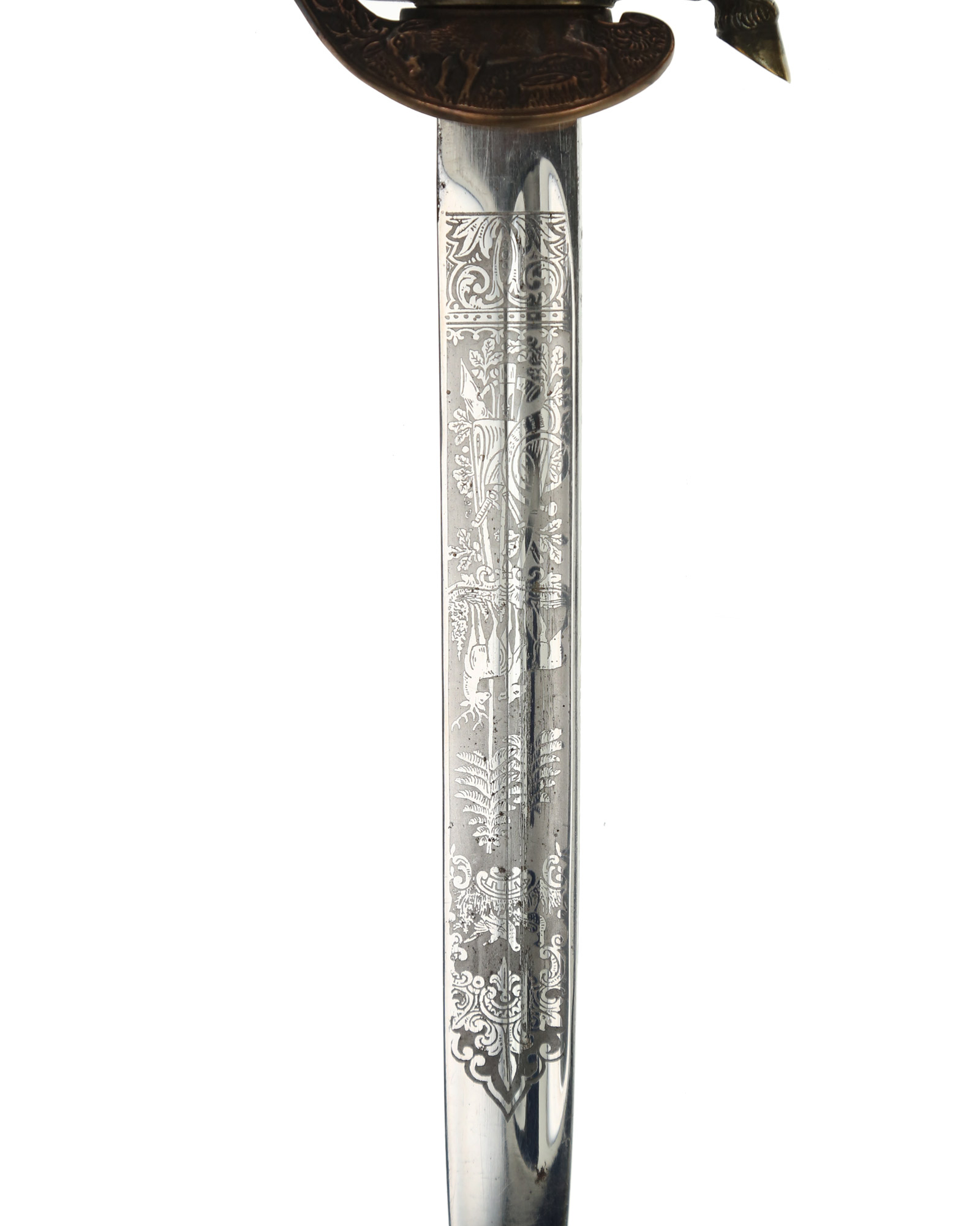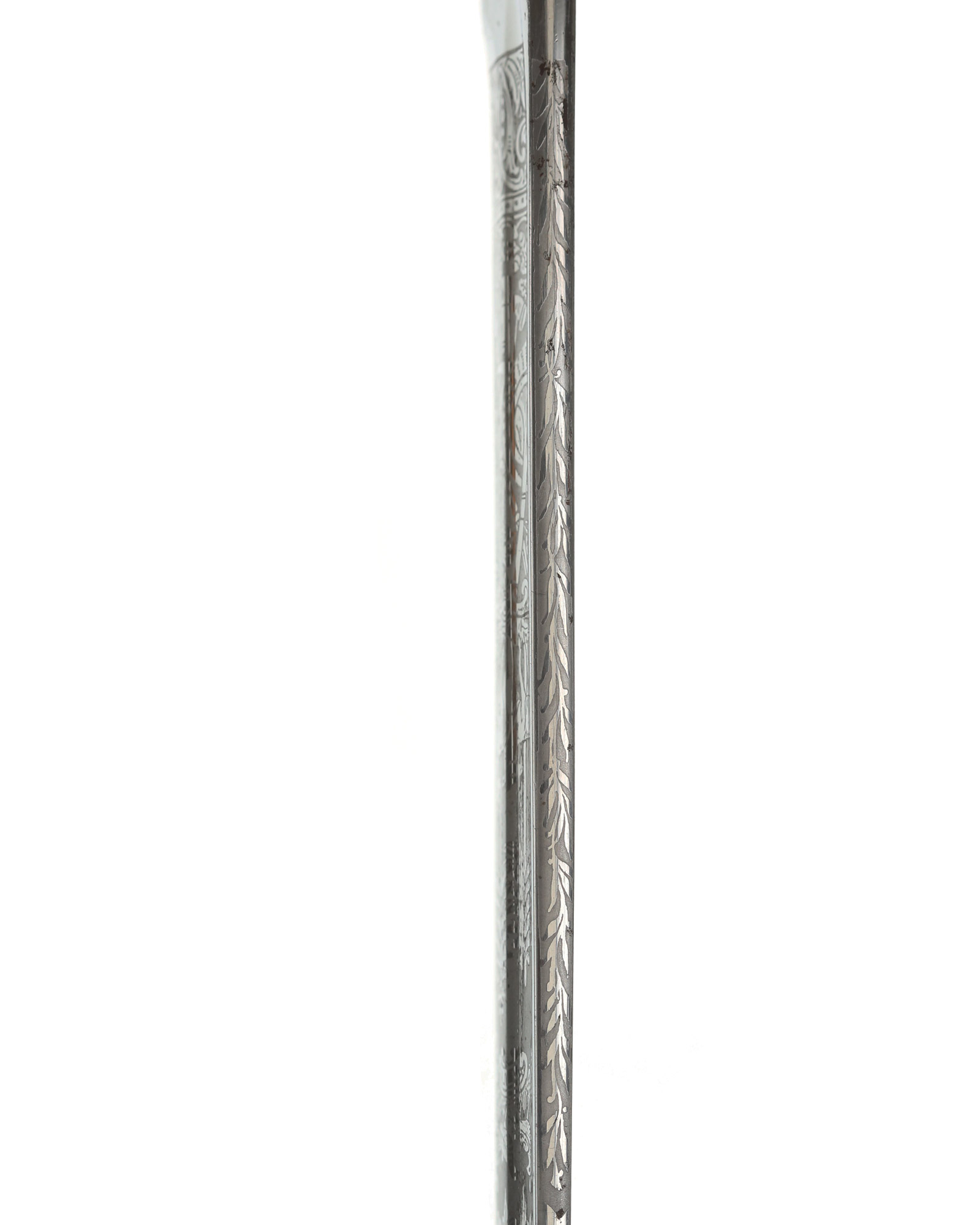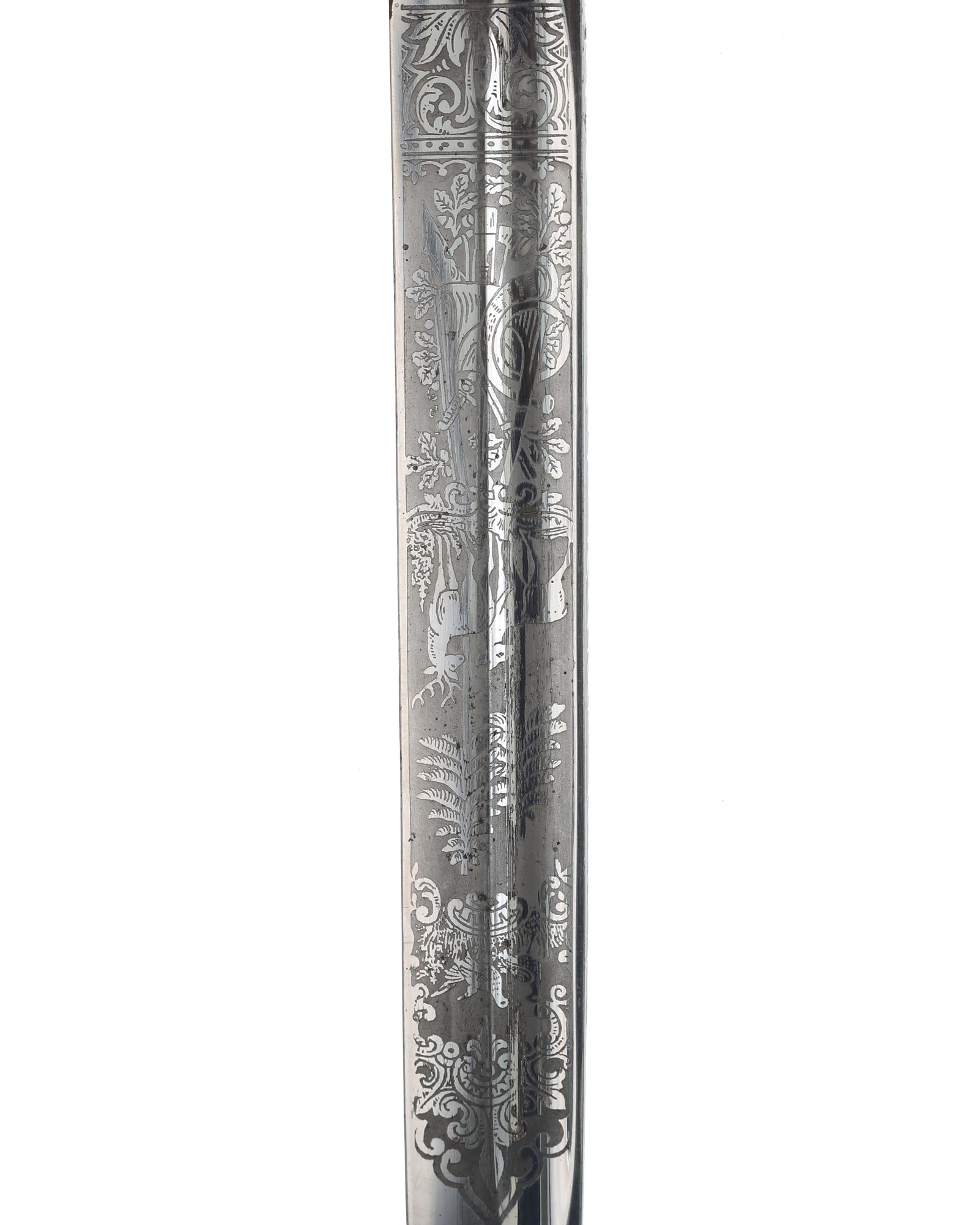 Клинок: Клинок стальной, прямой, плоский, однолезвийный, никелированный, без долов, украшен травлеными орнаментами на растительную и охотничью тематику.