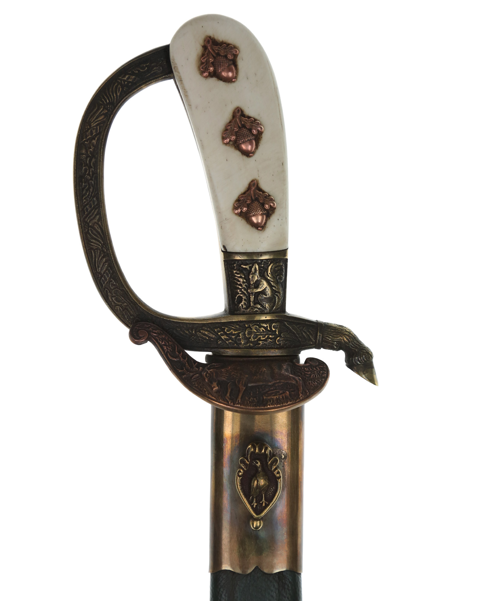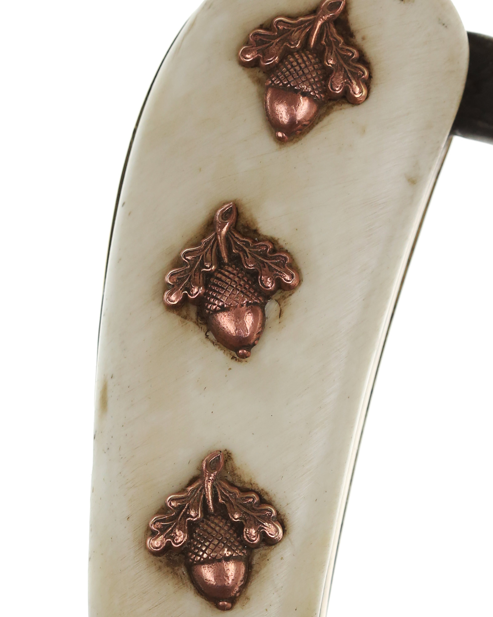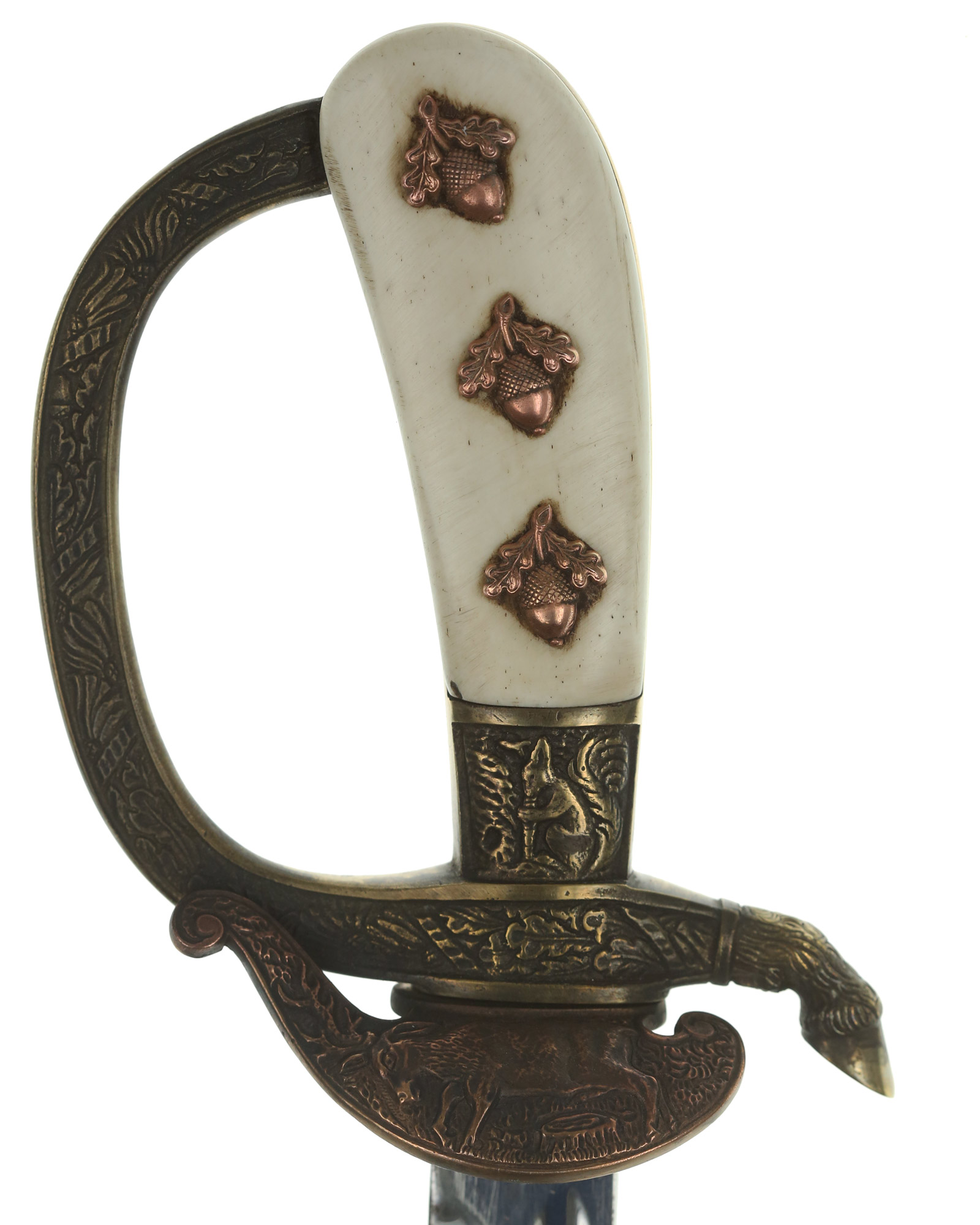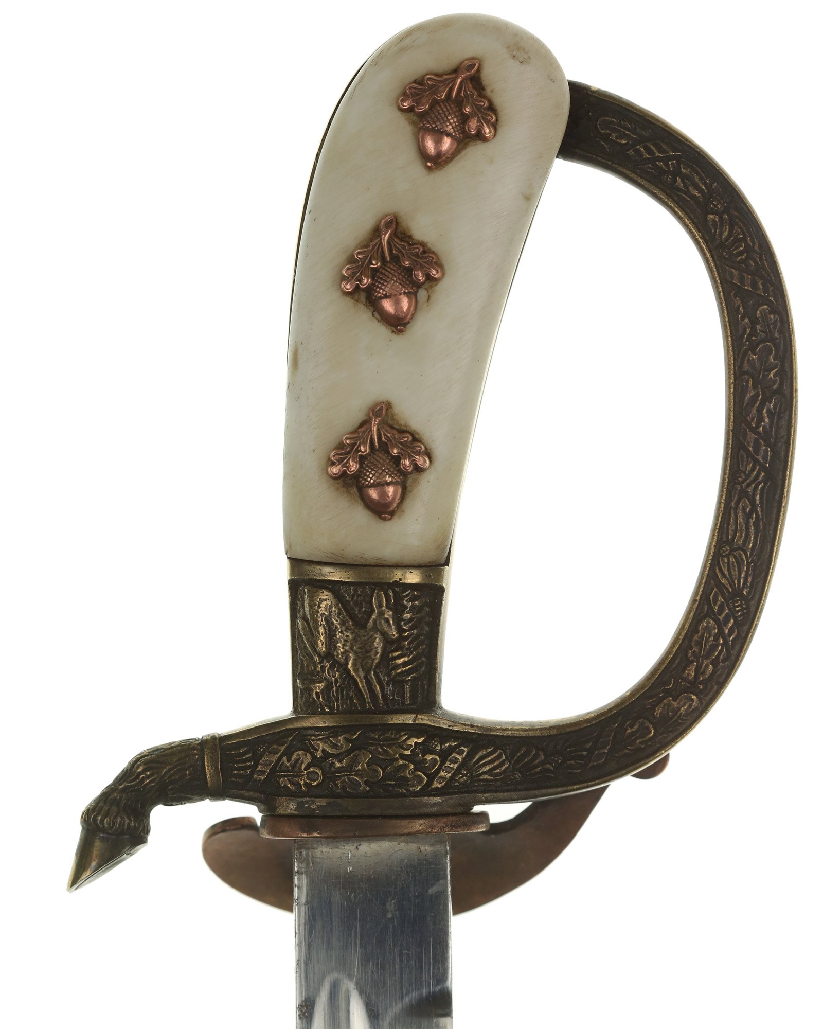 Рукоять: Рукоять металлическая, слегка изогнутая, с закругленной вершиной и с двумя роговыми накладками белого цвета. Накладки крепятся к рукояти на трех заклепках, отверстия которых с обеих сторон закрыты латунными желудями. Нижняя гайка коническая, украшенная продольными бороздками или рельефным растительным рисунком. Крестовина переходит со стороны лезвия в защитную дужку и заканчивается на верху рукояти. Другой конец крестовины выполнен в виде копыта кабана или оленя. Под крестовиной имеется овальный щиток, ассиметричный, в виде раковины, который украшен рельефным сюжетом на охотничьи темы. Все металлические детали эфеса латунные, позолоченные.