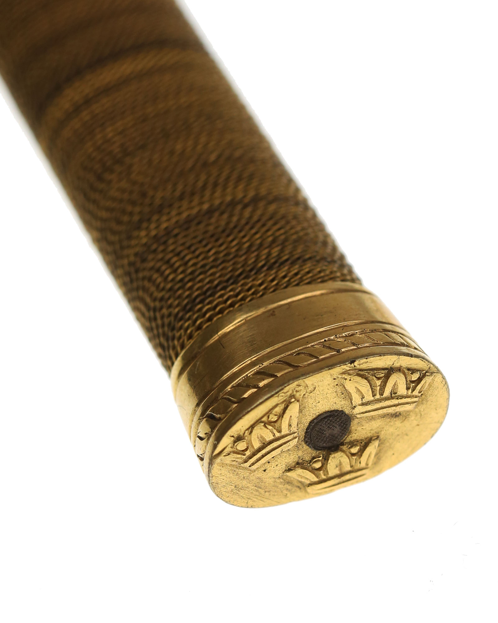 Рукоять: Рукоять кортика овального сечения плотно обвита крученой латунной проволокой. Внизу рукояти имеется украшенная простым гравированным орнаментом овальная гайка, которая служит для закрепления конца проволочной оплетки. Головка рукояти овальная, коническая, закрепляет конец оплетки сверху. На верхней плоскости шатки расположено рельефное изображение герба Швеции — три короны. Крестовина плоская, прямоугольная, чуть-чуть изогнута концами кверху. Крестовина и нижняя гайка спаяны в одно целое. Но периметру крестовина украшена простым гравированным орнаментом. Все латунные детали эфеса позолоченные.