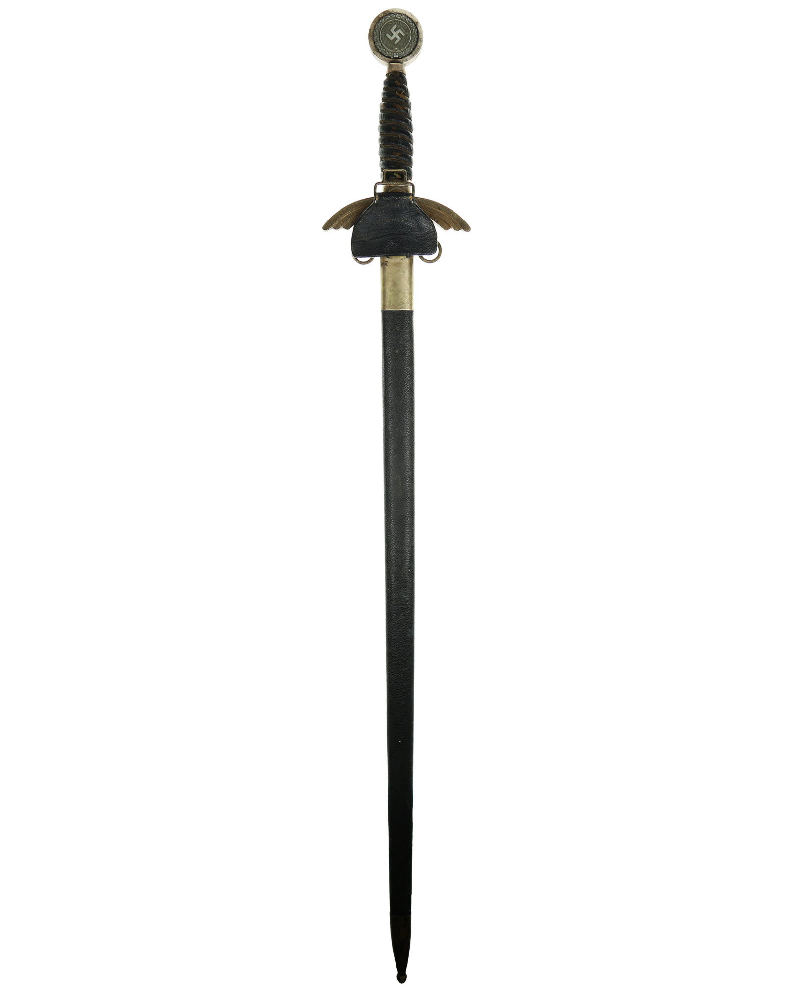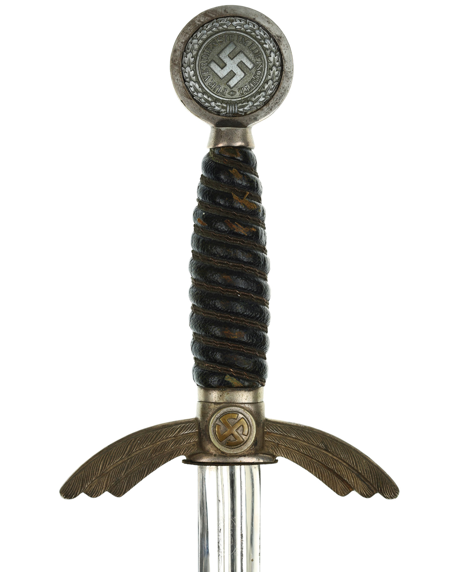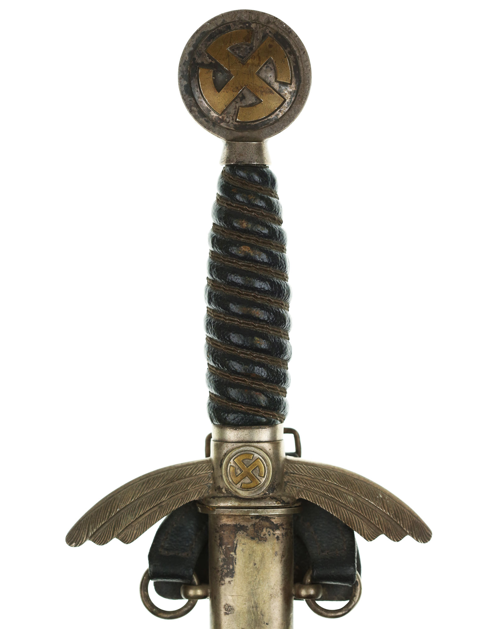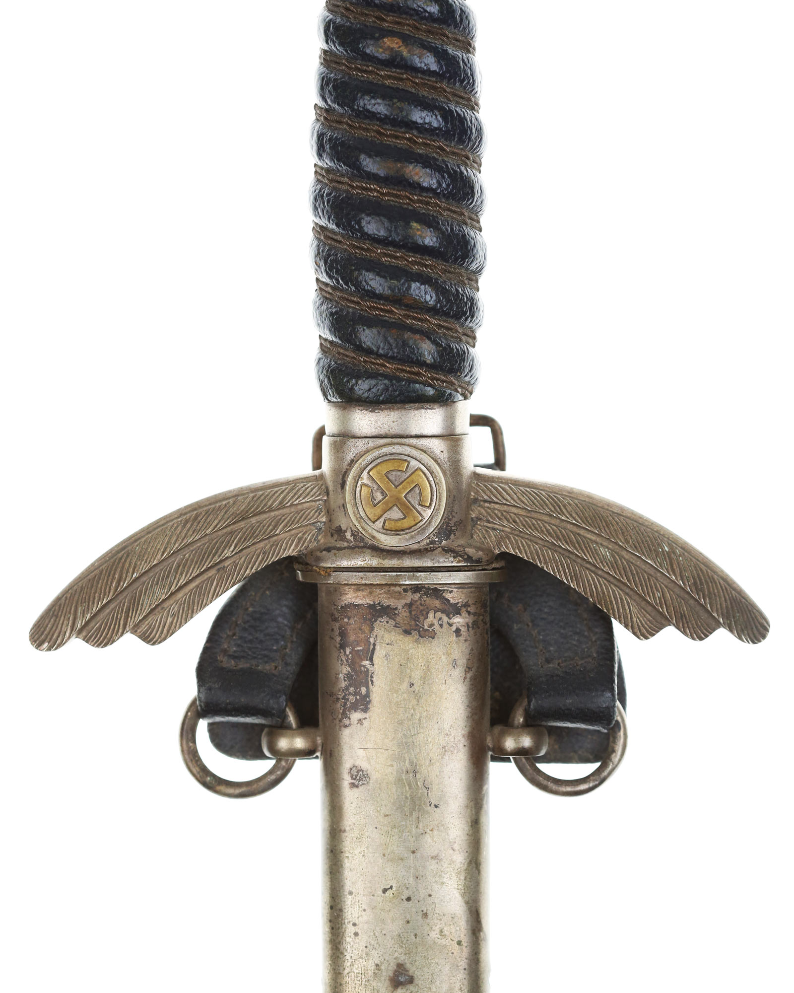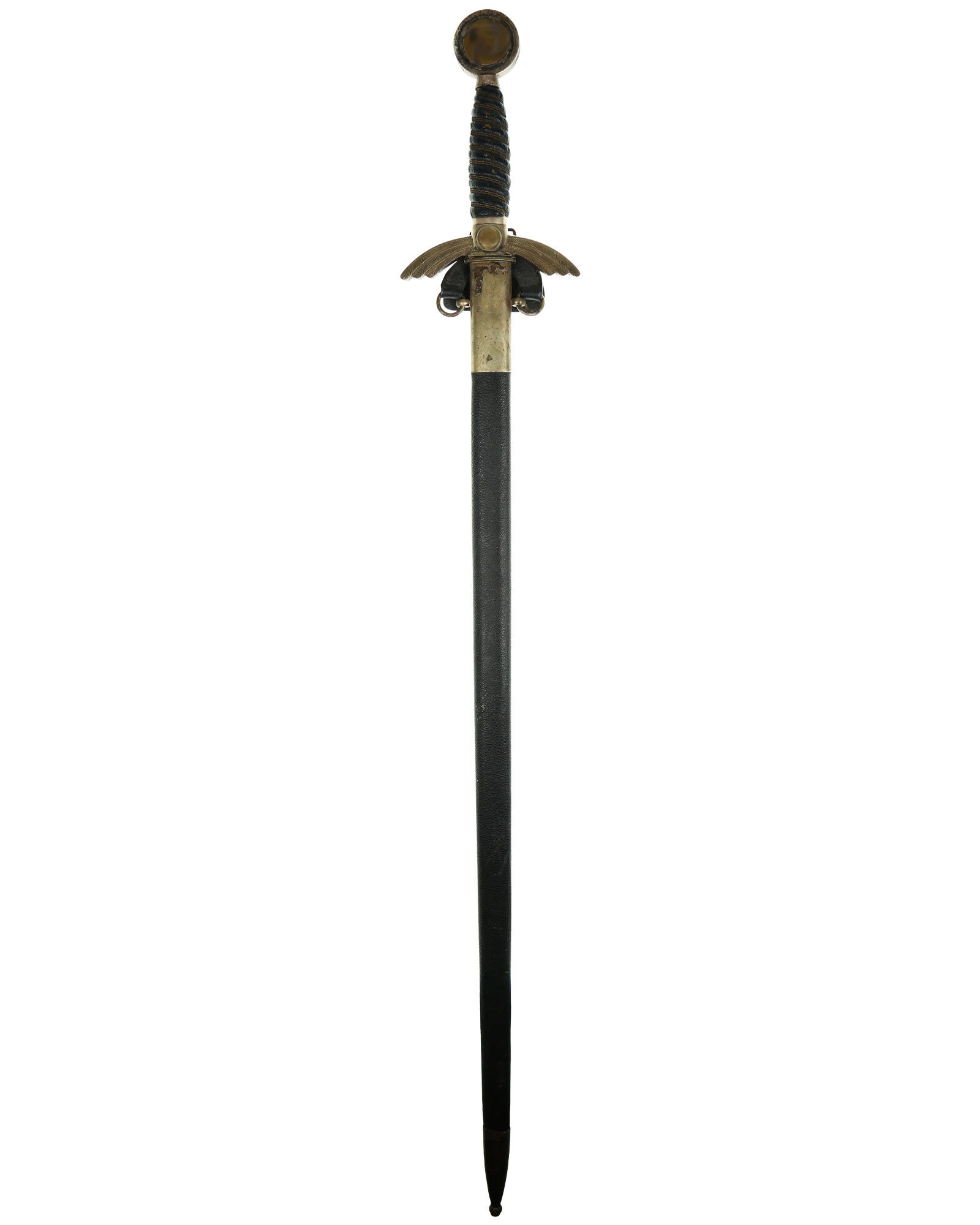 Историческая справка: Парадный офицерский меч германских Люфтваффе образца 1934 г. — официальное именование –Offizierschwert, «офицерский меч»; разговорное – Fliegerschwert, «меч лётчика». Образец будущего офицерского меча Люфтваффе был разработан и утверждён в качестве т.н. «Почётного меча» (Ehrenschwert) для персонала Немецкого авиаспортивного общества (Deutscher Luftsport Verband), где с 1933 г. в обход версальских ограничений готовились кадры будущих ВВС. После официального учреждения Люфтваффе в марте 1935 г. недавно введённый Почётный меч стал полагаться к ношению с парадной формой всем офицерам ВВС. Ношение мечей было прекращено в декабре 1944 г. В отделке прибора ранних мечах использовался посеребренный мельхиор, а после начала войны (с 1940 г.) алюминиевый сплав (т.н. лёгкий вариант).