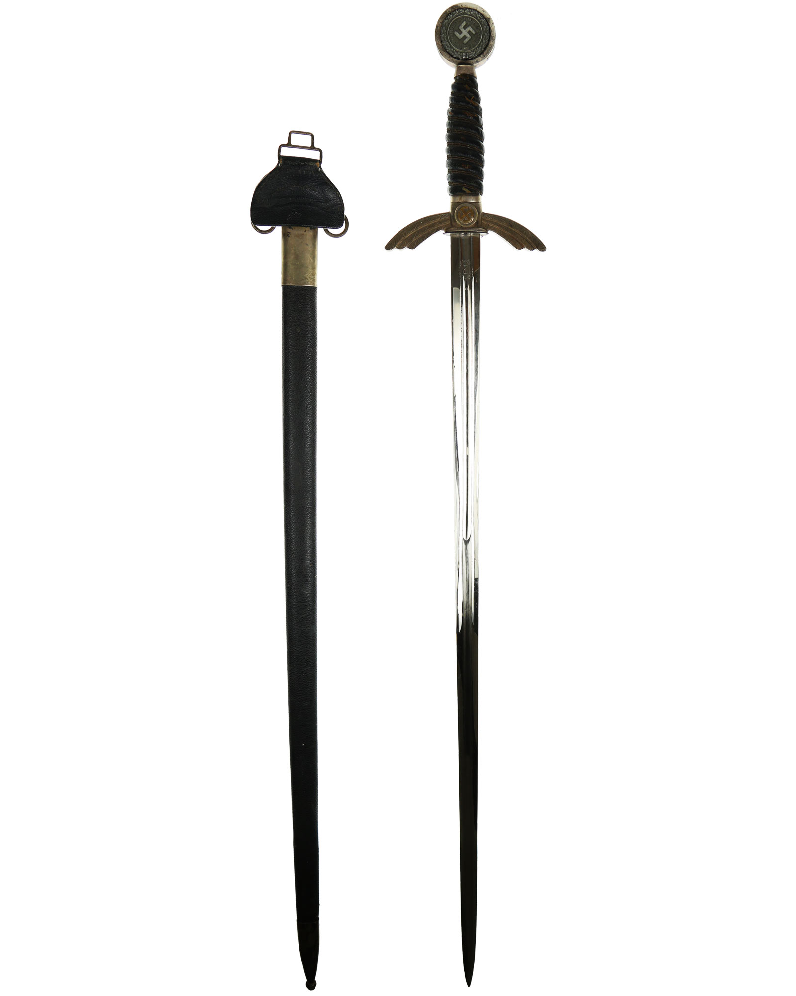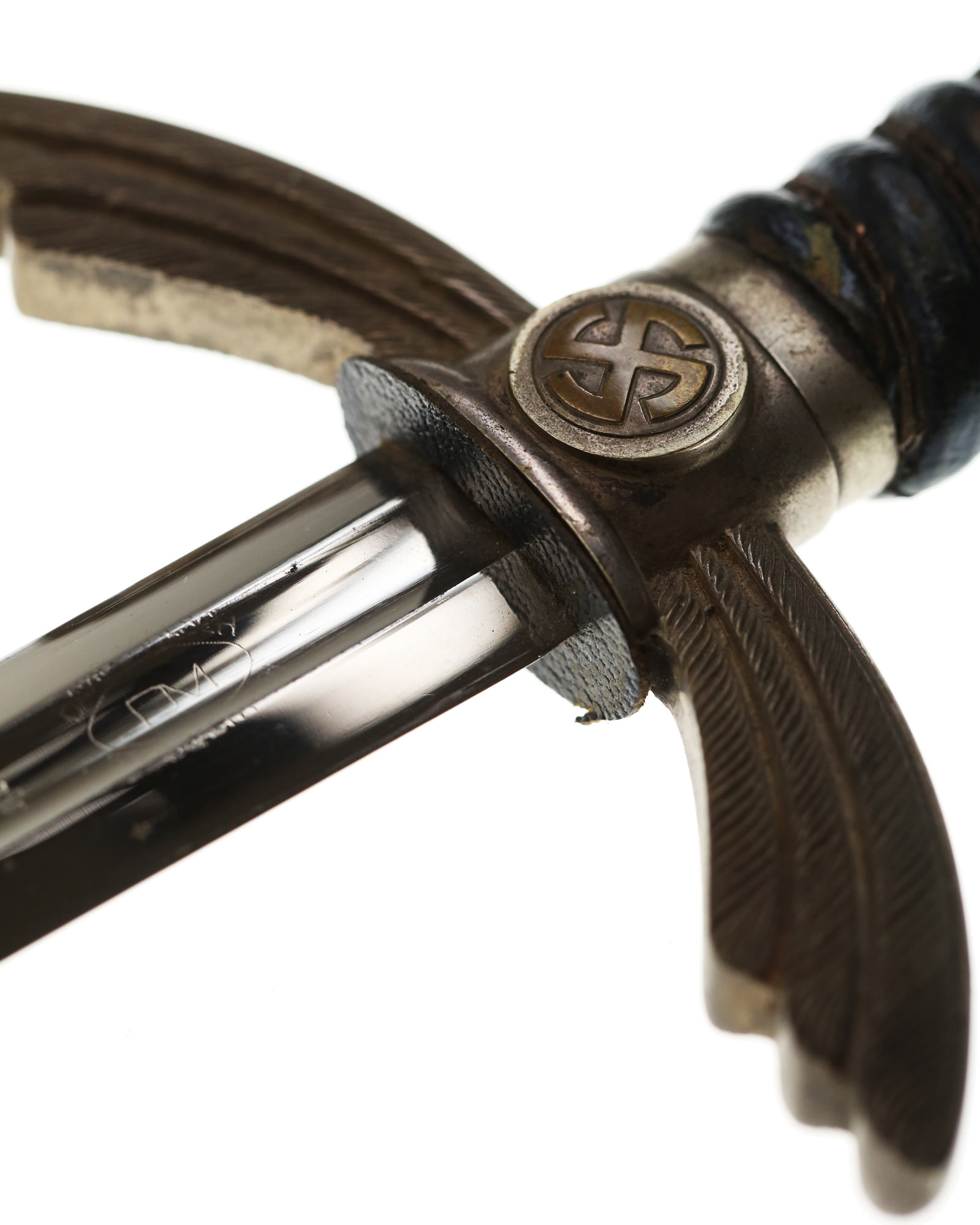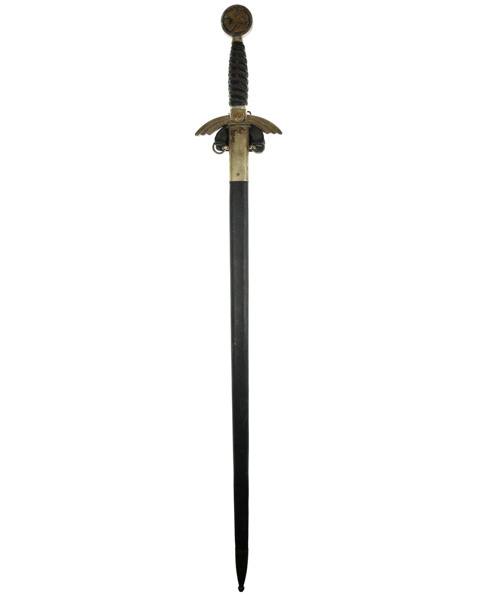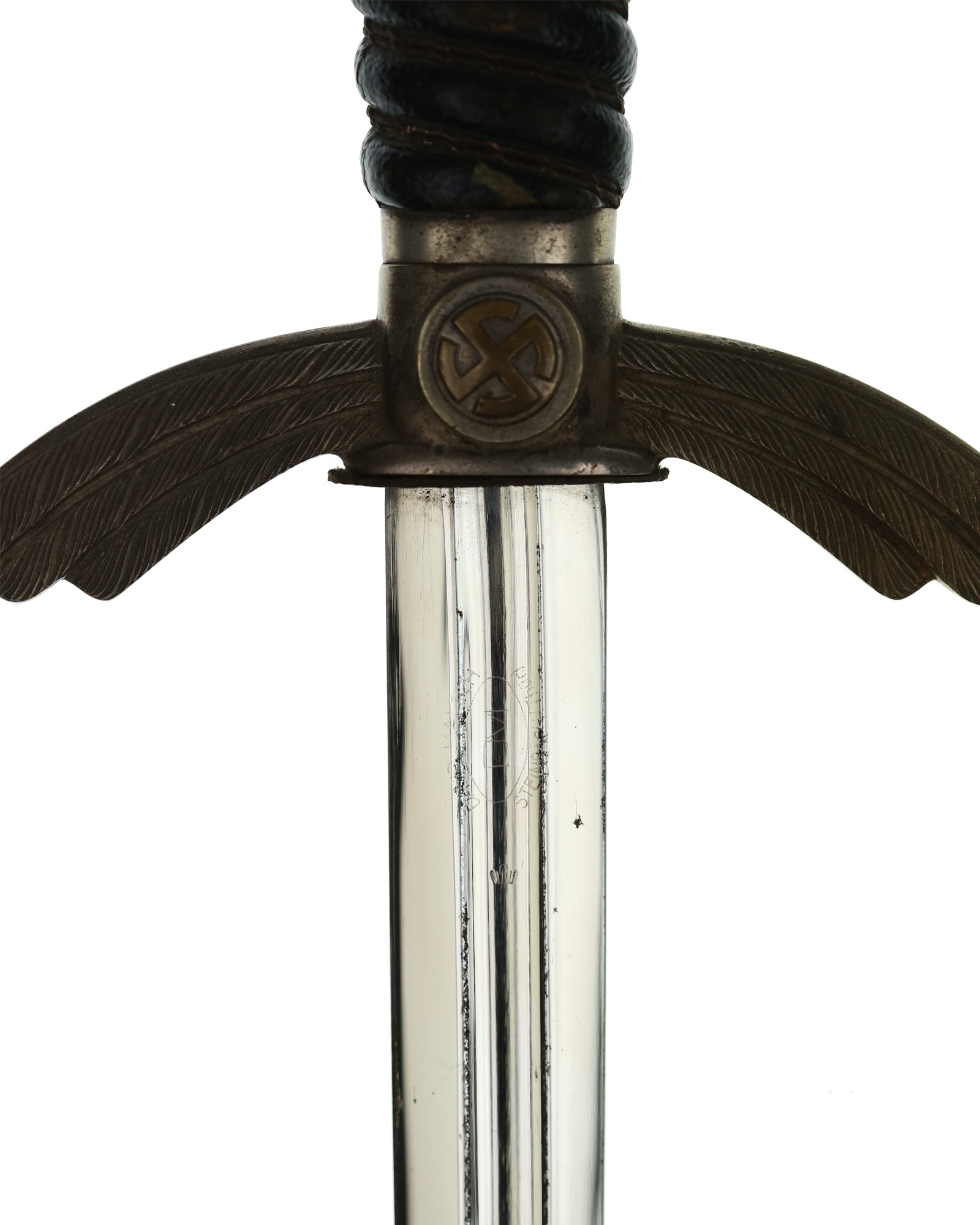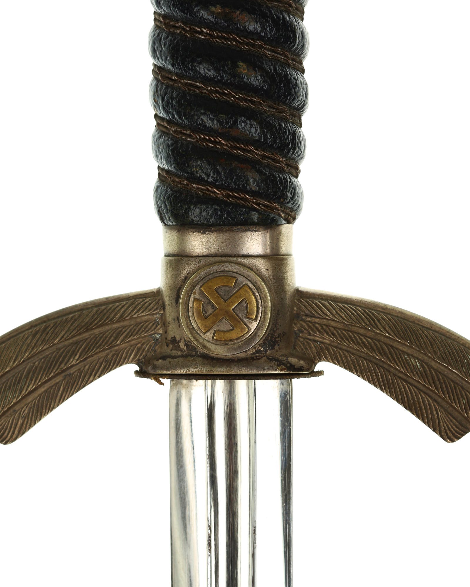 Историческая справка: Парадный офицерский меч германских Люфтваффе образца 1934 г. — официальное именование –Offizierschwert, «офицерский меч»; разговорное – Fliegerschwert, «меч лётчика». Образец будущего офицерского меча Люфтваффе был разработан и утверждён в качестве т.н. «Почётного меча» (Ehrenschwert) для персонала Немецкого авиаспортивного общества (Deutscher Luftsport Verband), где с 1933 г. в обход версальских ограничений готовились кадры будущих ВВС. После официального учреждения Люфтваффе в марте 1935 г. недавно введённый Почётный меч стал полагаться к ношению с парадной формой всем офицерам ВВС. Ношение мечей было прекращено в декабре 1944 г. В отделке прибора ранних мечах использовался посеребренный мельхиор, а после начала войны (с 1940 г.) алюминиевый сплав (т.н. лёгкий вариант).