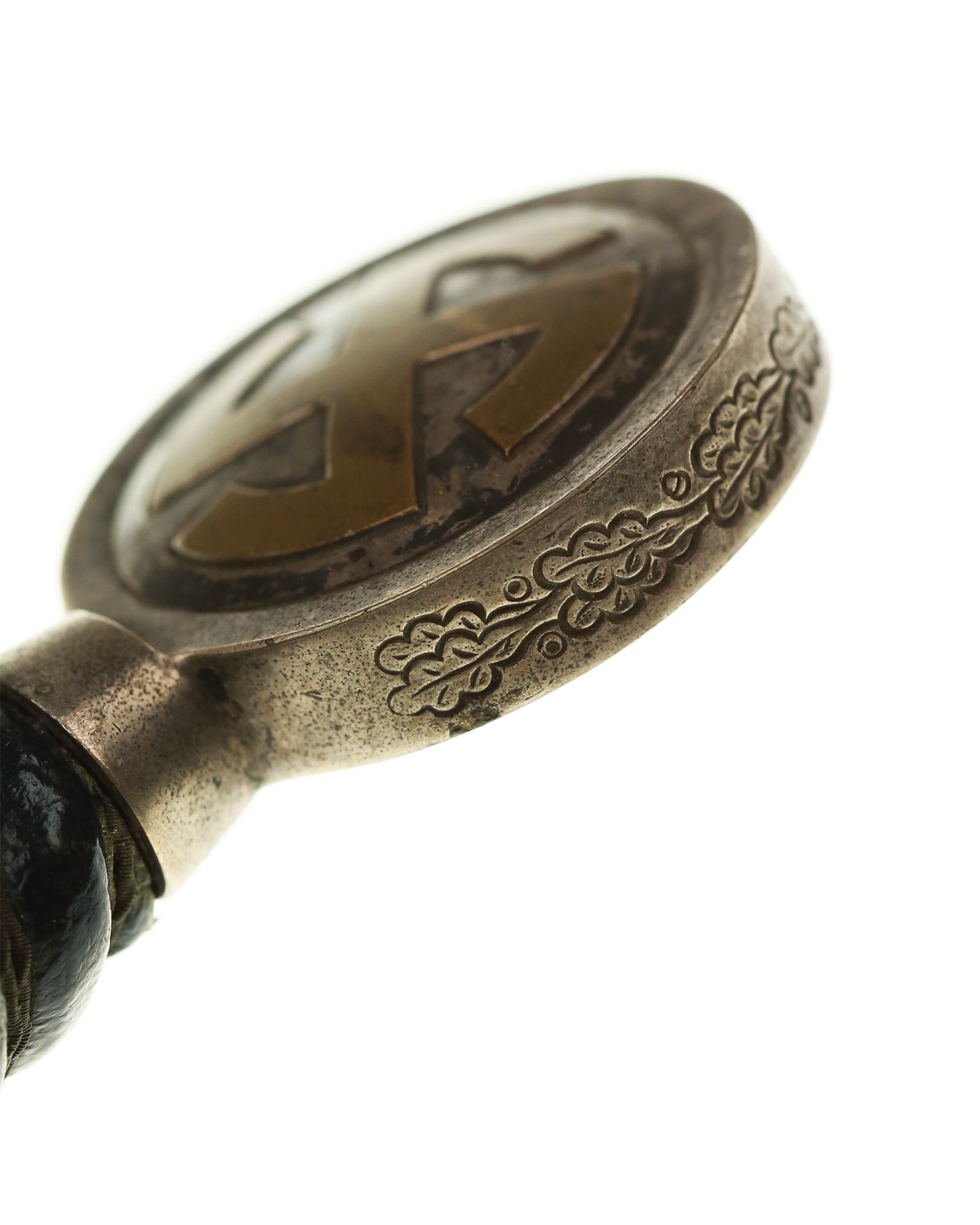 Рукоять: Эфес состоит из рукояти и крестовины из нойзильбера. Рукоять покрыта темно-синей кожей, по желобкам перевита двойной проволокой. В центре крестовины и на навершии рукояти находится позолоченное изображение свастики. Навершие в торце украшено резным растительным орнаментом.