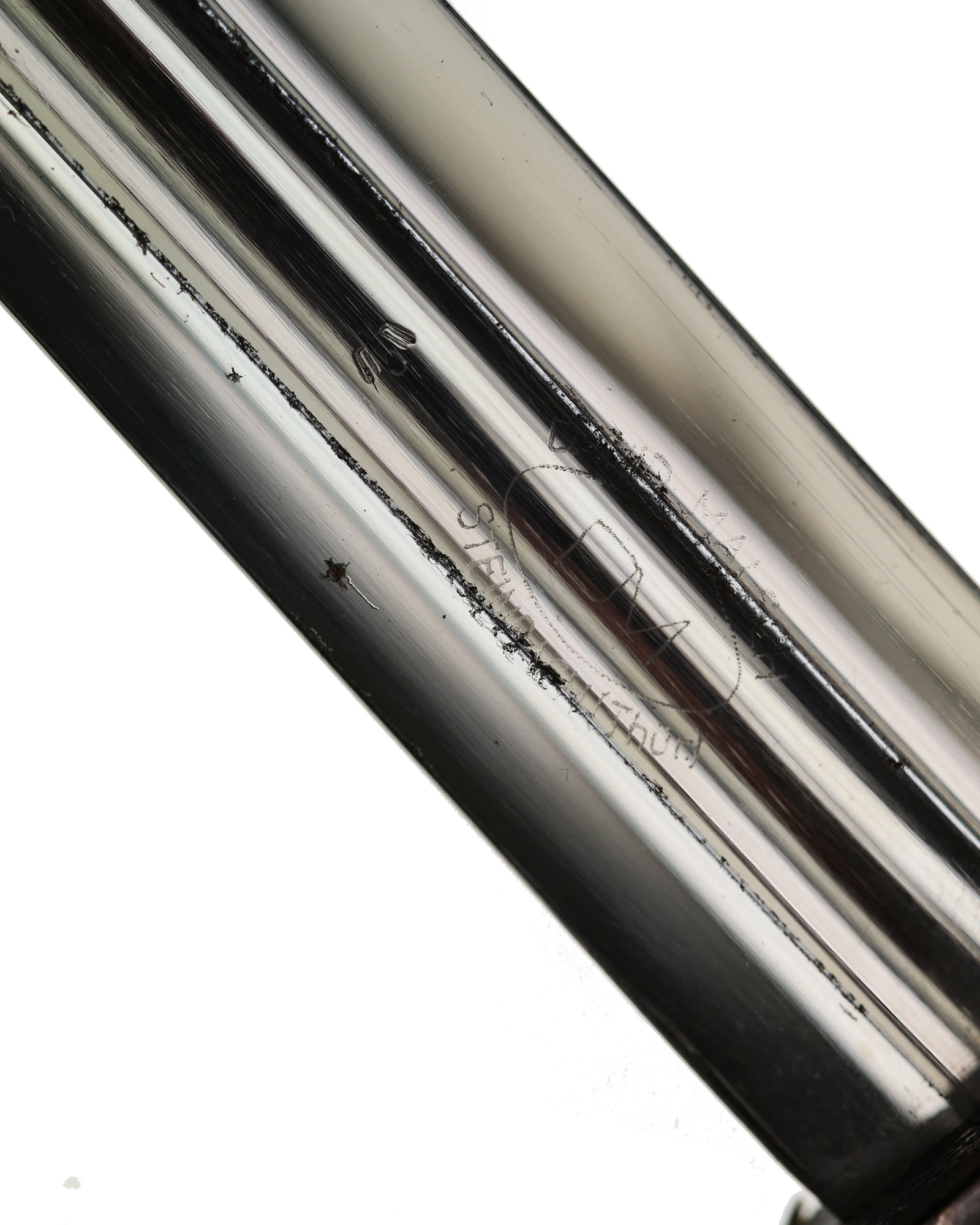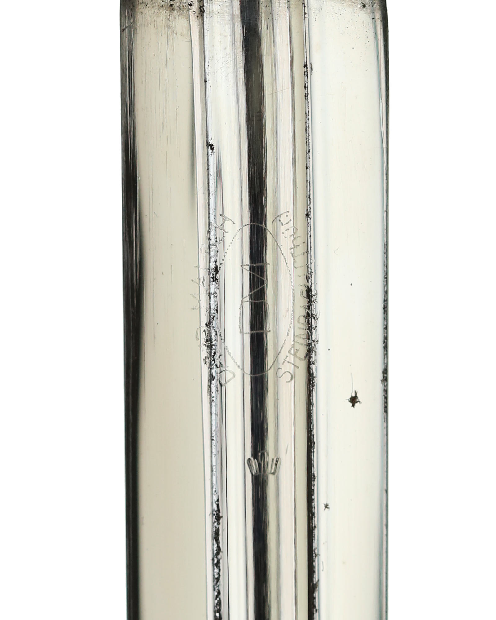 Ножны: Ножны стальные, покрытые темно-синей кожей. Приборы ножен выполнены в мельхиоре, что указывает на довоенное изготовление данного парадного меча.