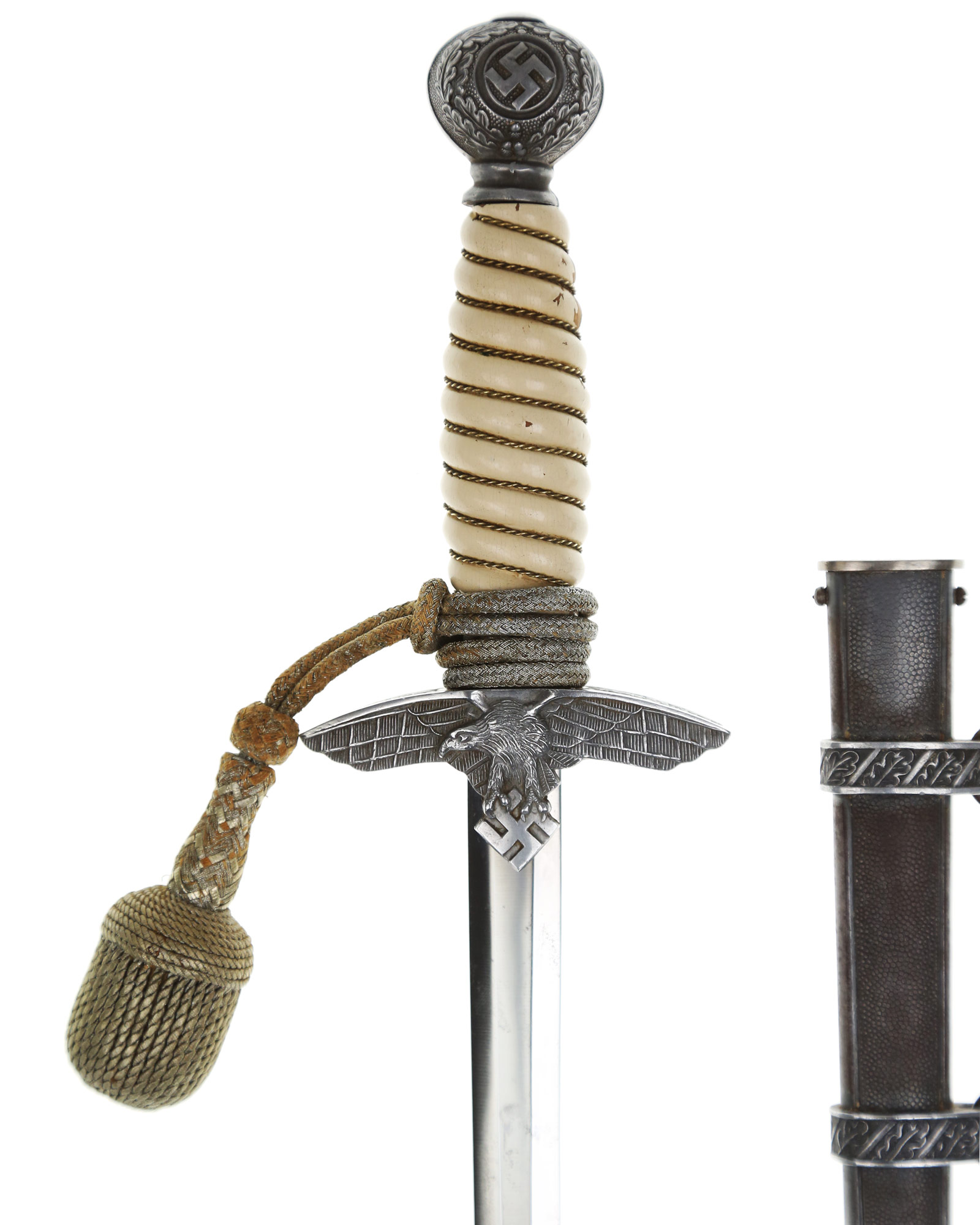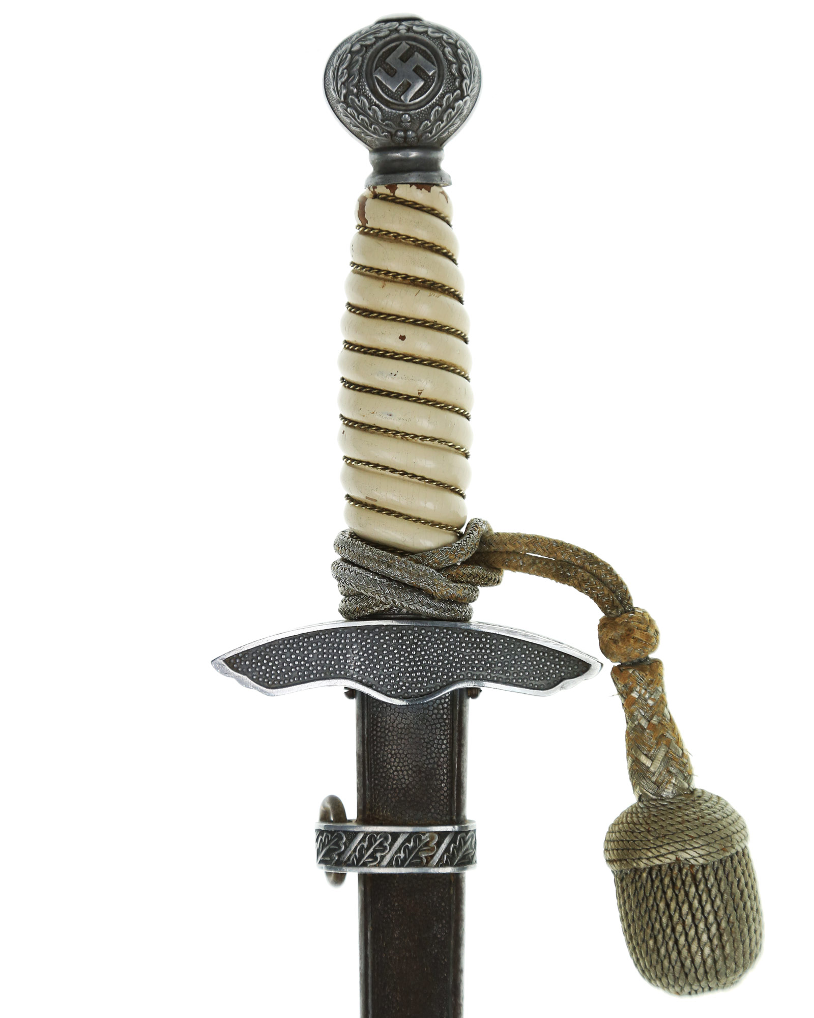 Рукоять: Рукоять бочкообразная, по спиральным желобкам рукоять обмотана витой серебристой проволокой. Внизу имеется цилиндрическая втулка, украшенная орнаментом из дубовых листьев. Головка рукояти шарообразная, отлита вместе с верхней гайкой. Украшена с двух сторон рельефным изображением свастики и орнаментом из дубовых листьев. Головка навинчивается на хвостовик и имеет сверху плоскую круглую пуговку. Крестовина литая, с лицевой стороны в виде летящего орла, несущего в когтях свастику.