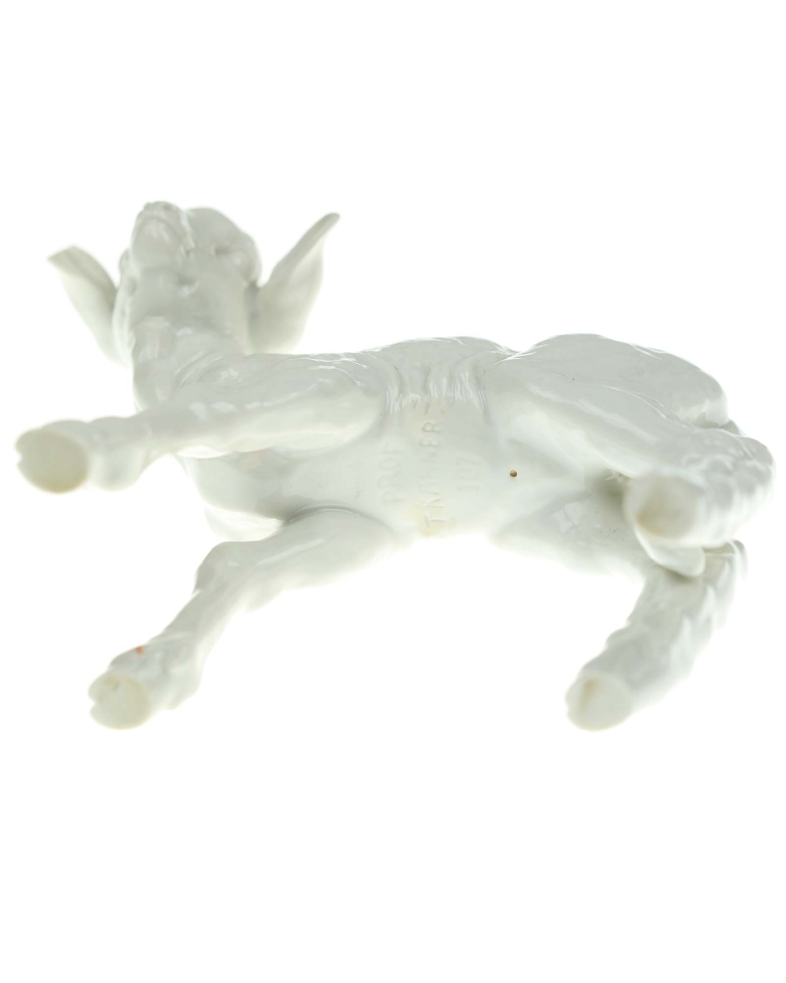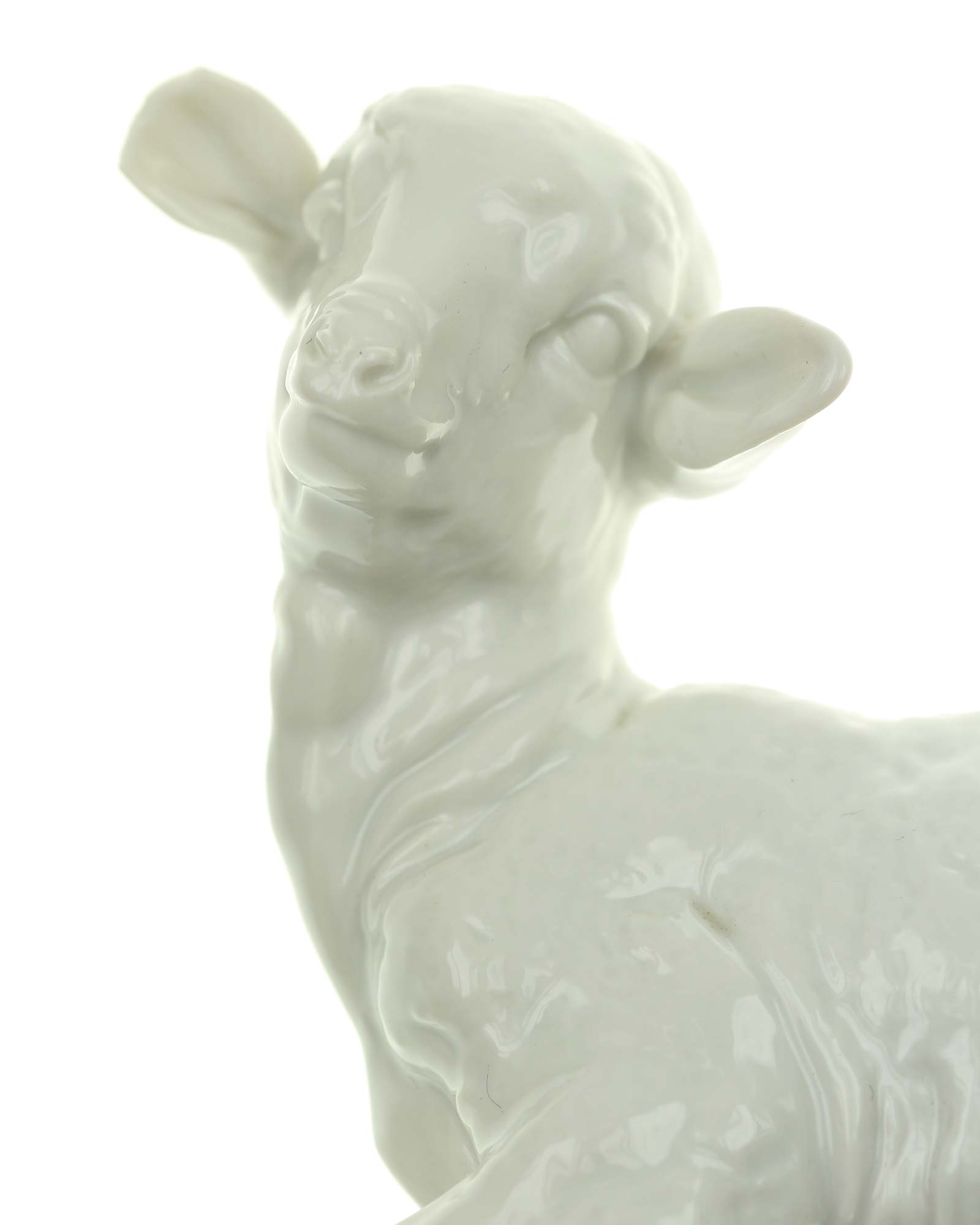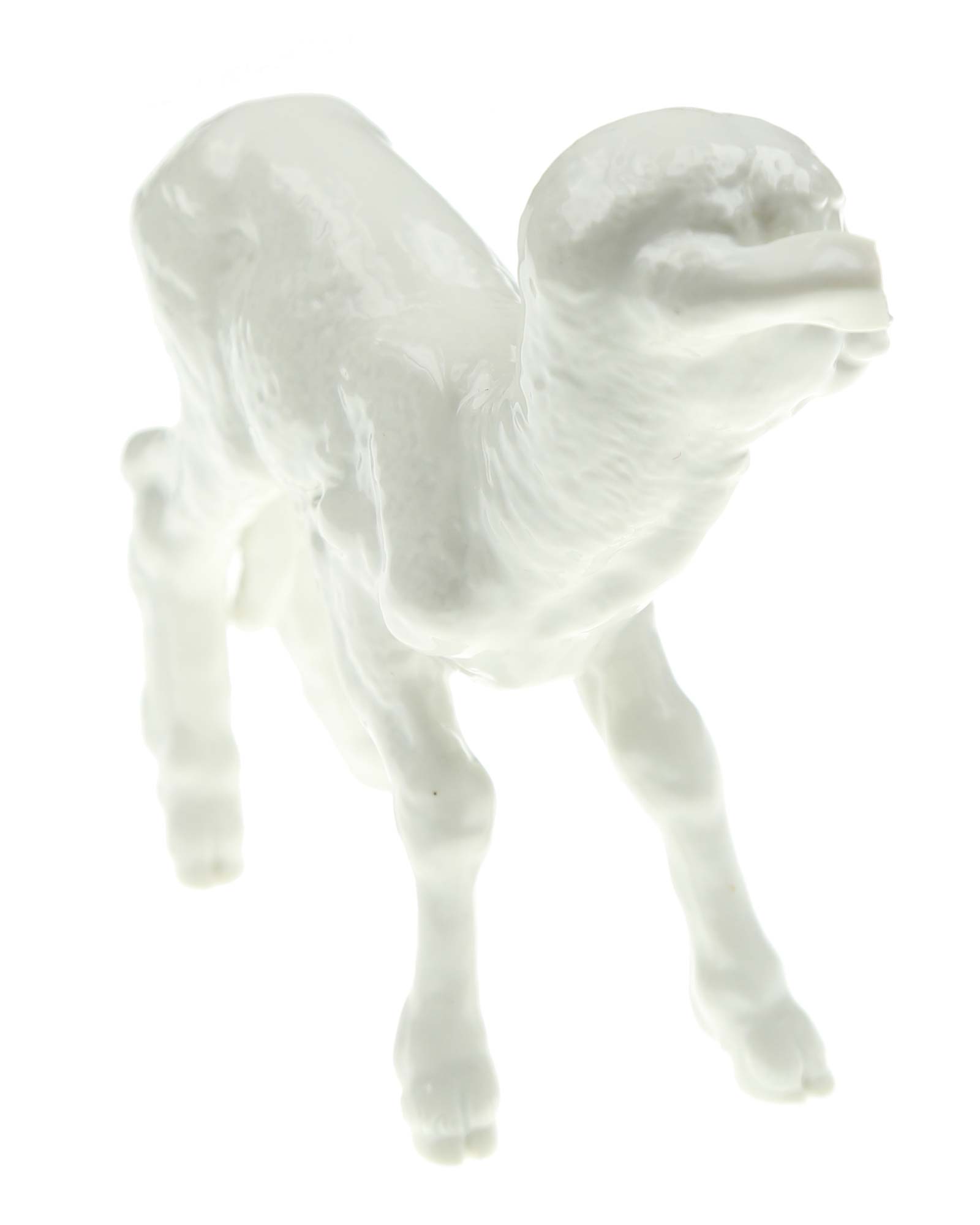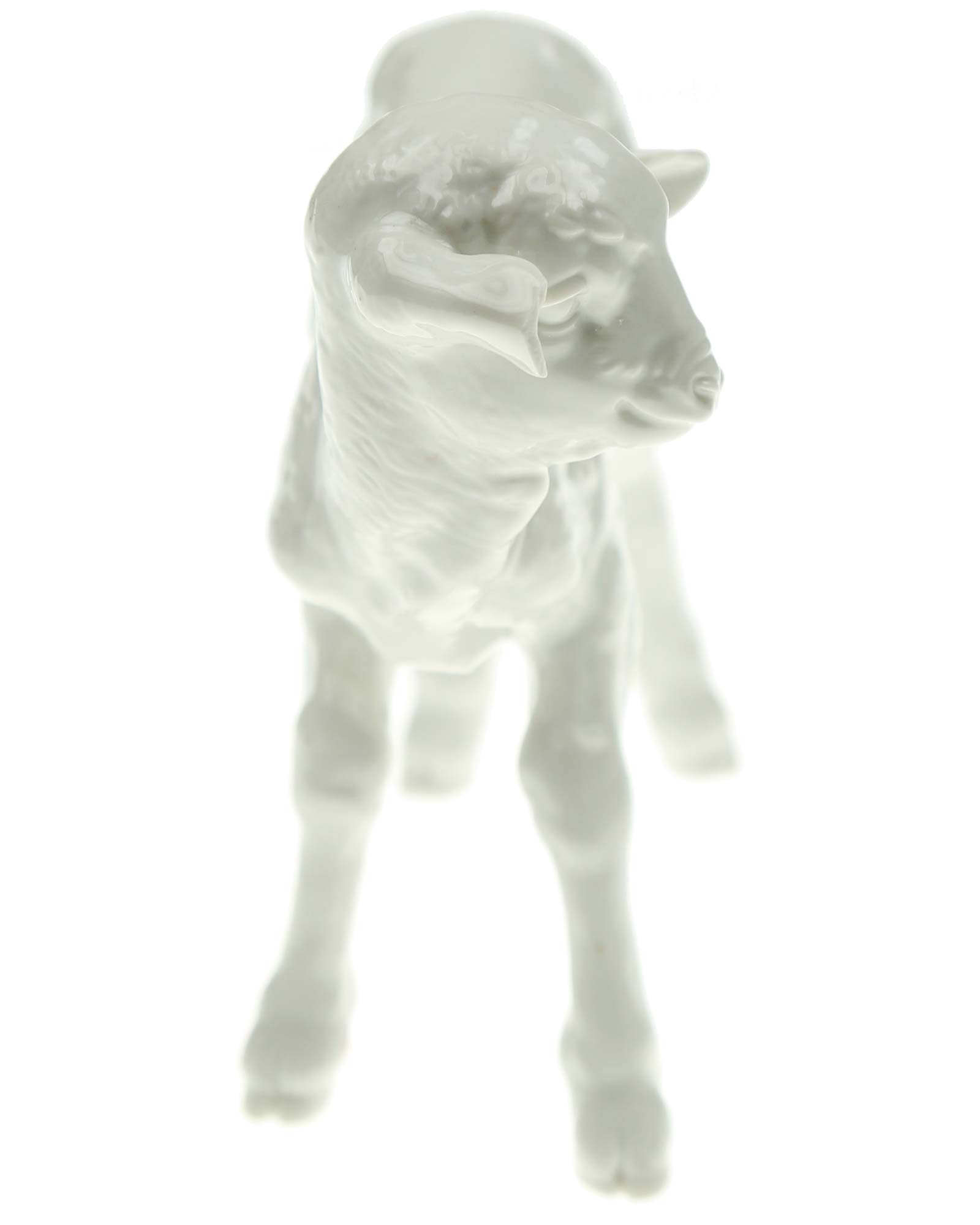 Декоративная статуэтка "Ягненок" (Lamm, stehend), модель № 107. Теодор Кернер (Prof. T. Kärner), выполненная из высококачественного белого глазурированного фарфора. Произведена на известной фабрике Аллах (Allach). Художник: Т. Кернер (Prof. Theodor Kärner). Размер: высота 150 мм. На статуэтки имеется клеймо фирмы, номер модели - № 107. Часть уха сломана.