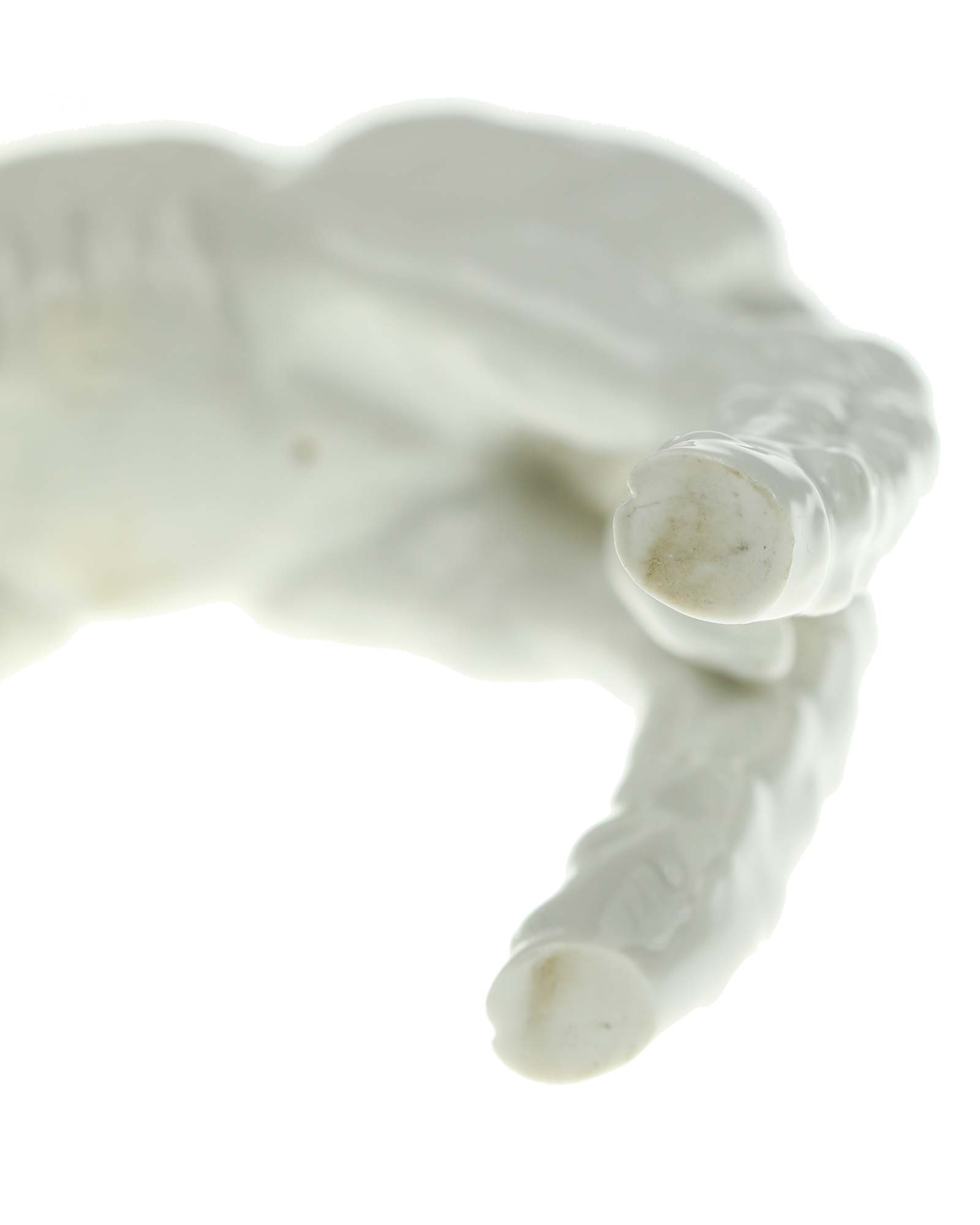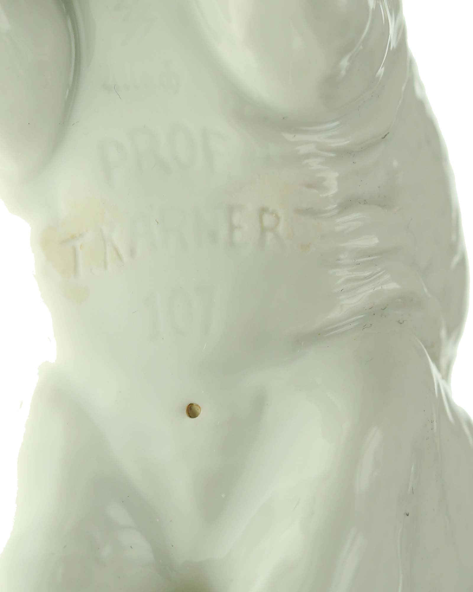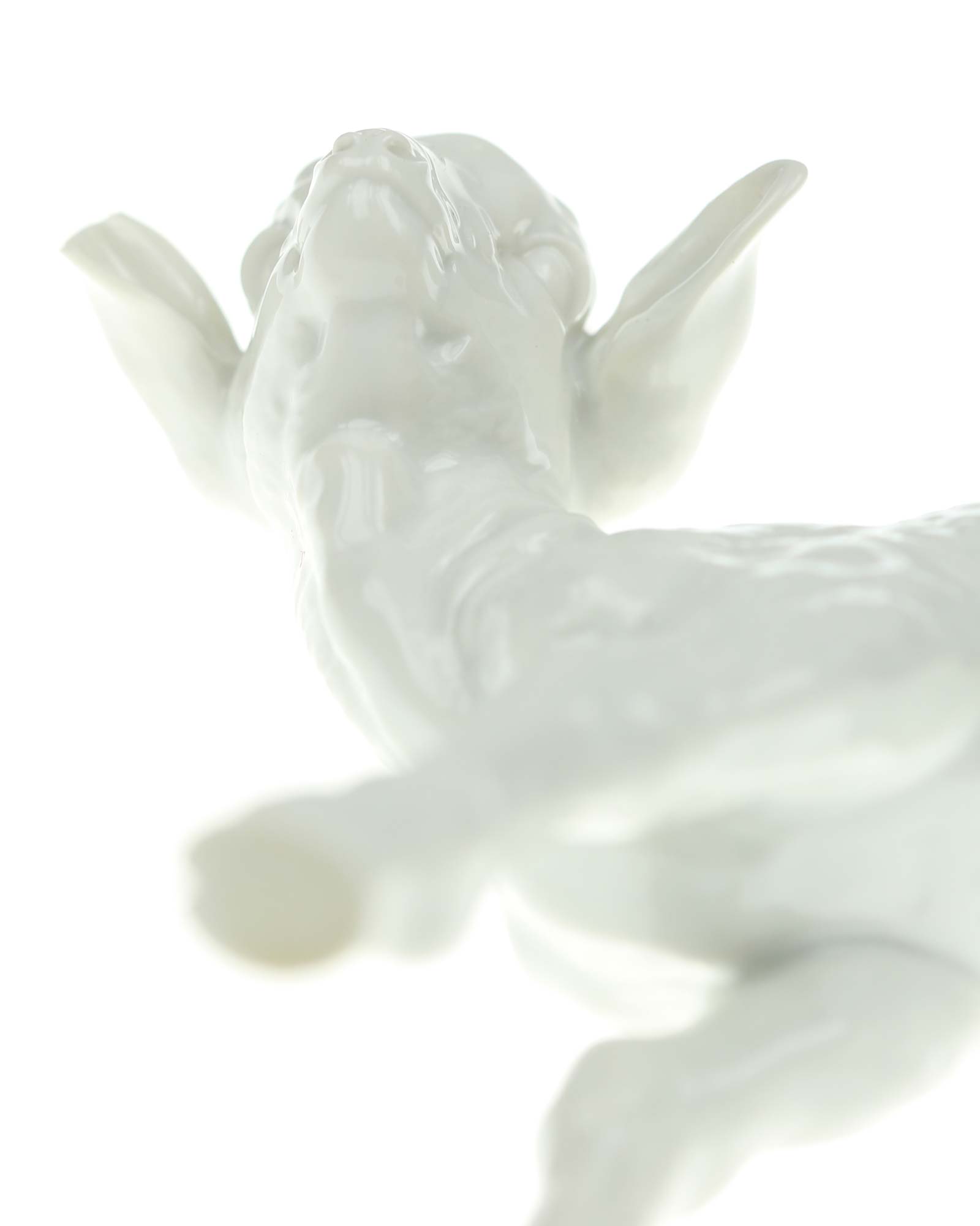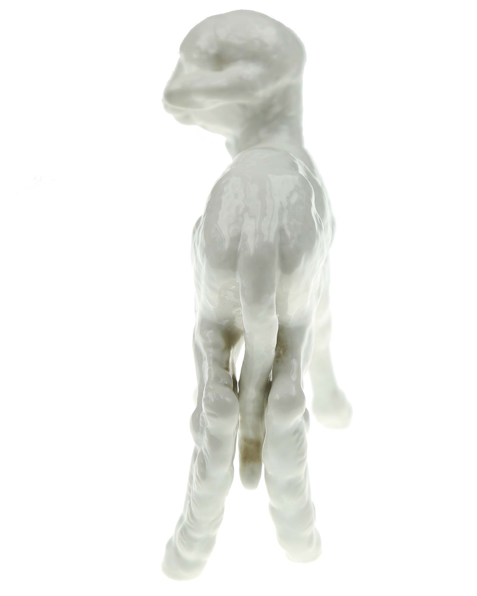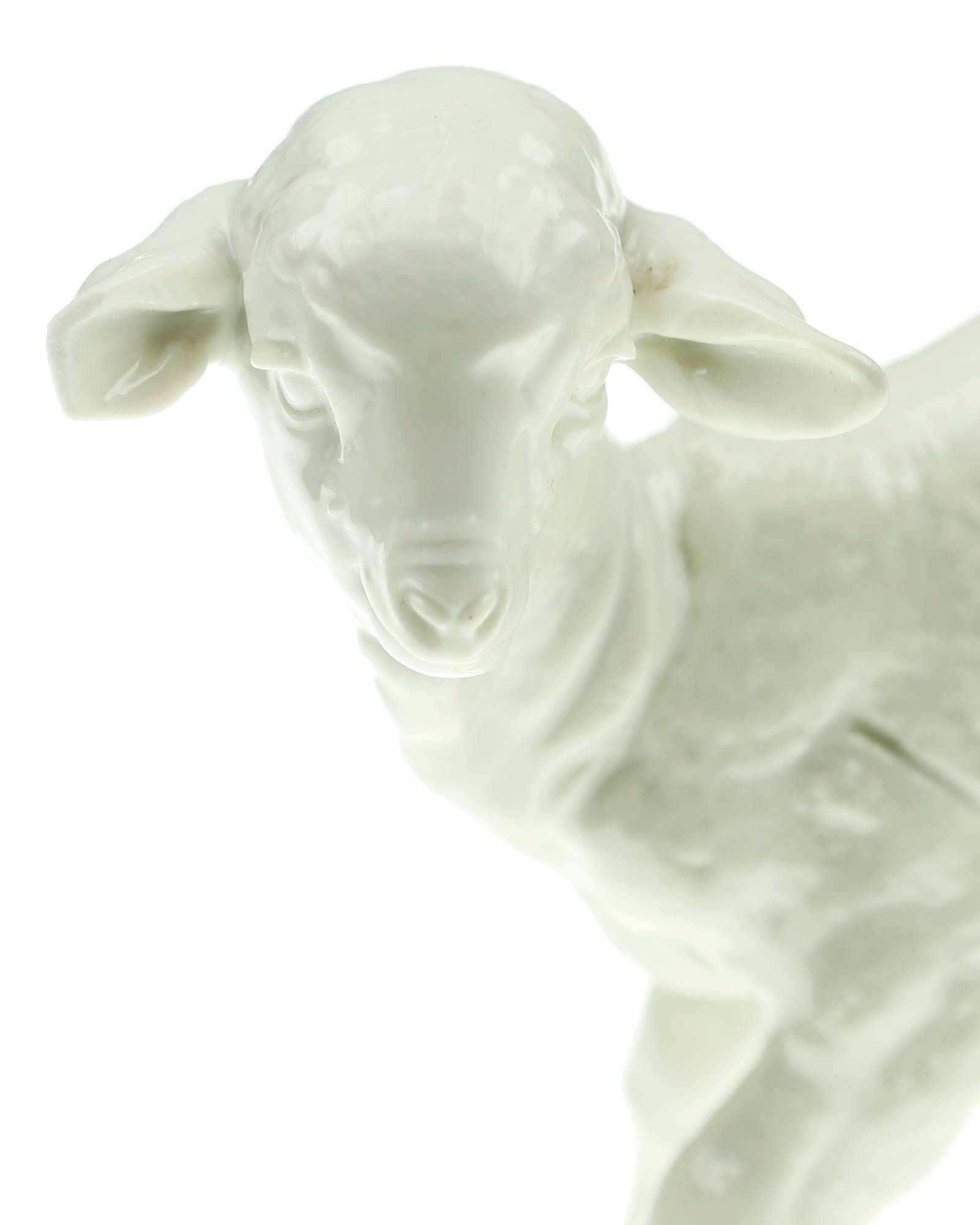 Декоративная статуэтка "Ягненок" (Lamm, stehend), модель № 107. Теодор Кернер (Prof. T. Kärner), выполненная из высококачественного белого глазурированного фарфора. Произведена на известной фабрике Аллах (Allach). Художник: Т. Кернер (Prof. Theodor Kärner). Размер: высота 150 мм. На статуэтки имеется клеймо фирмы, номер модели - № 107. Часть уха сломана.