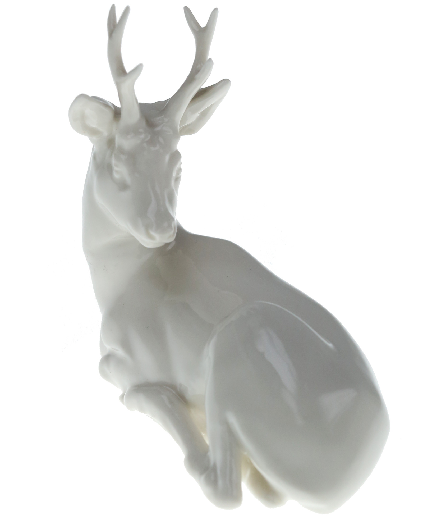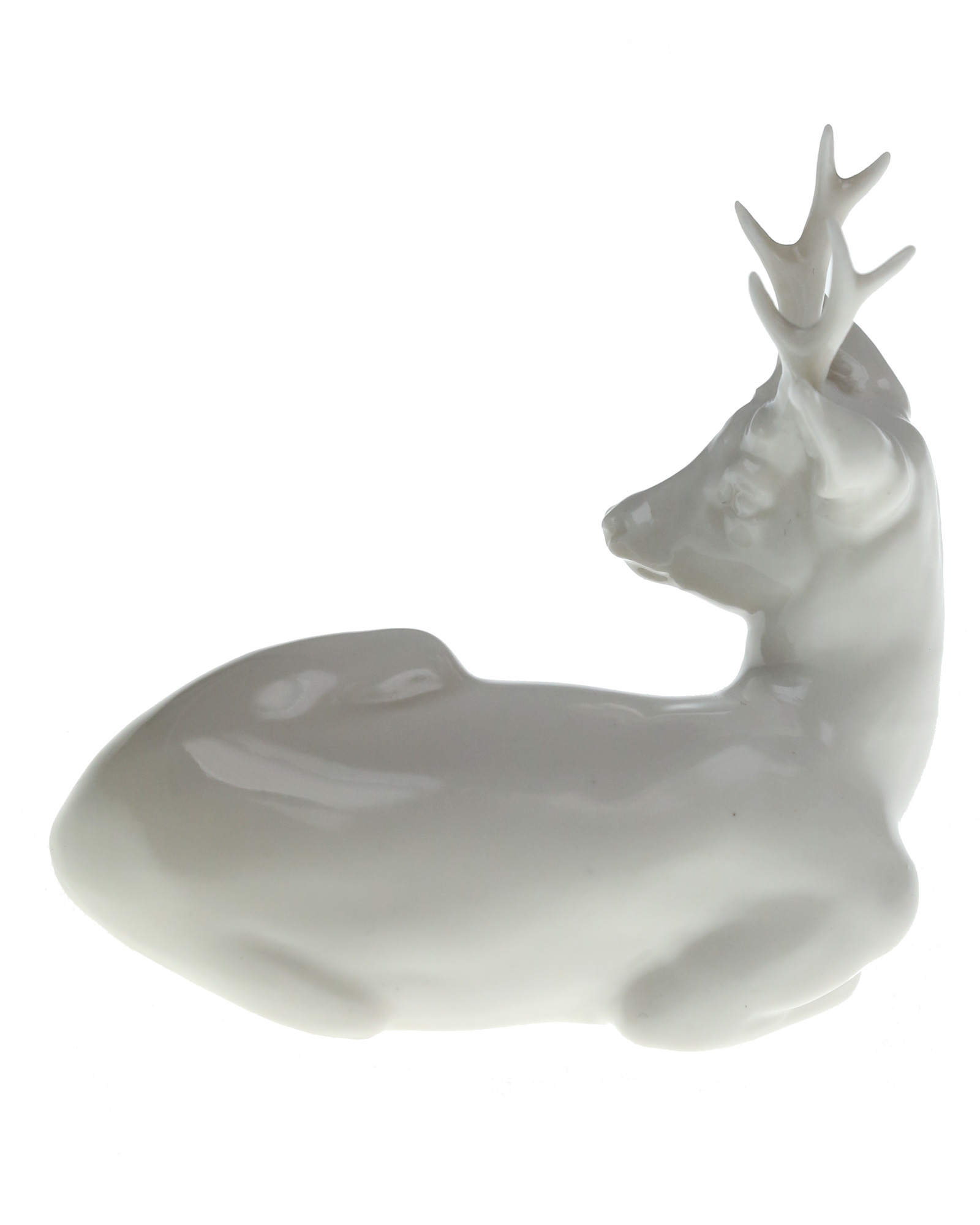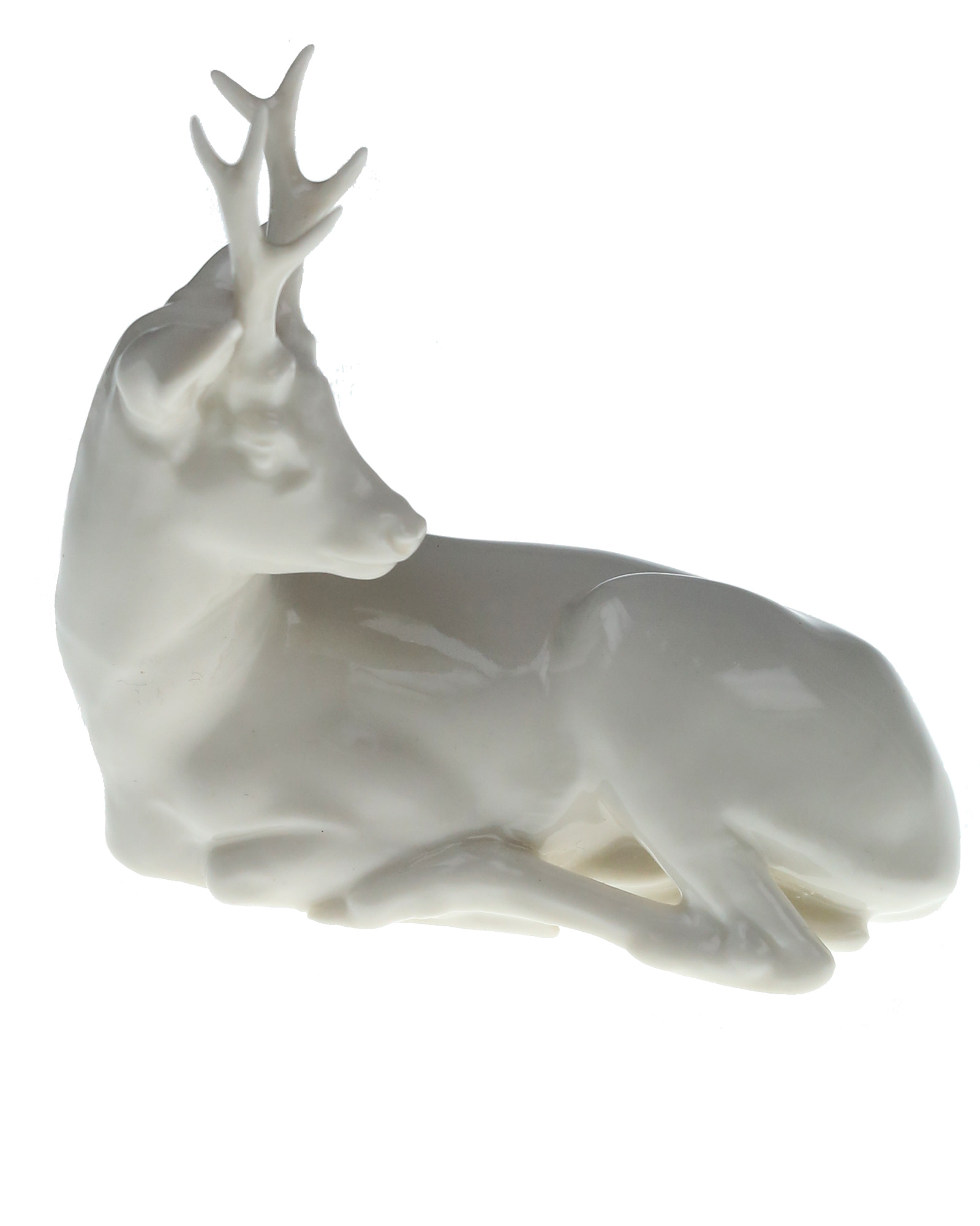 Декоративная статуэтка «Косуля» (Liegender Rehbock), выполненная из высококачественного белого глазурированного фарфора. Произведена на известной фабрике Аллах (Allach). Художник: Т. Кернер (Prof. Theodor Kärner). Размер: высота 73 мм. На нижней плоскости статуэтки имеется клеймо фирмы, номер модели - № 14, имя авто