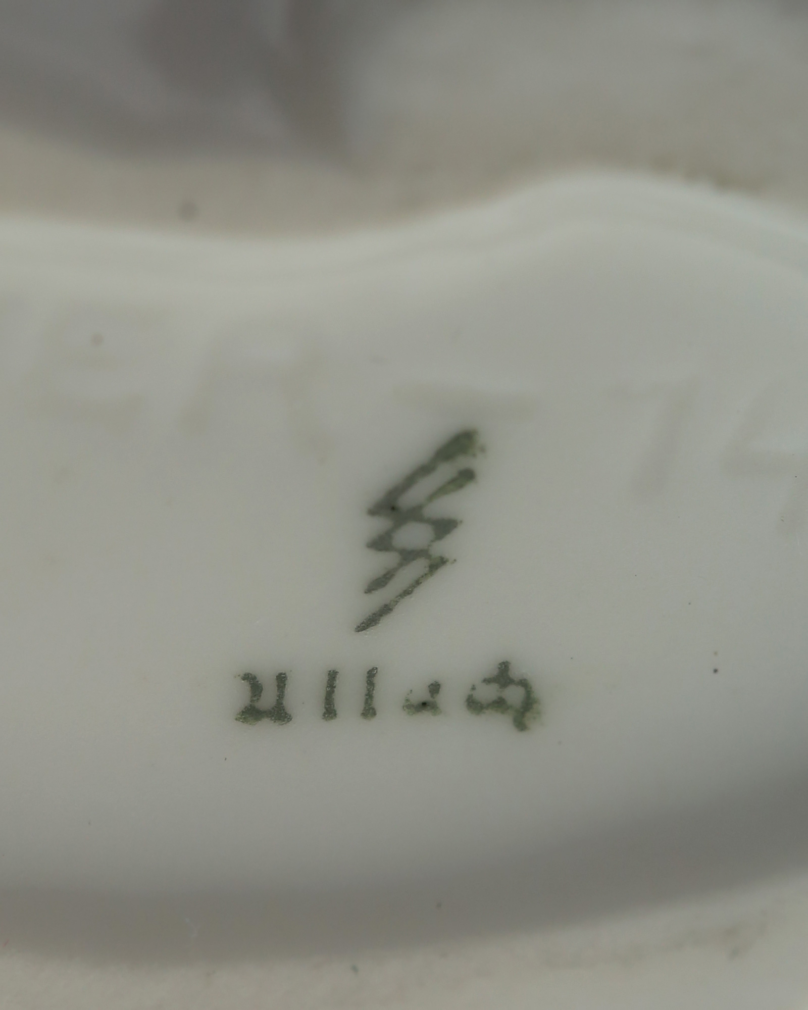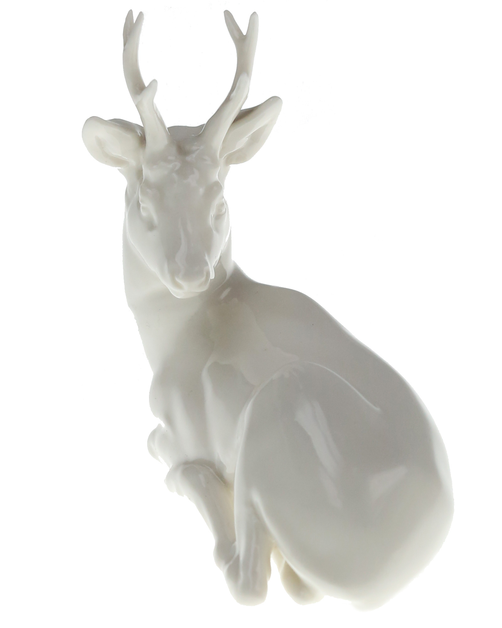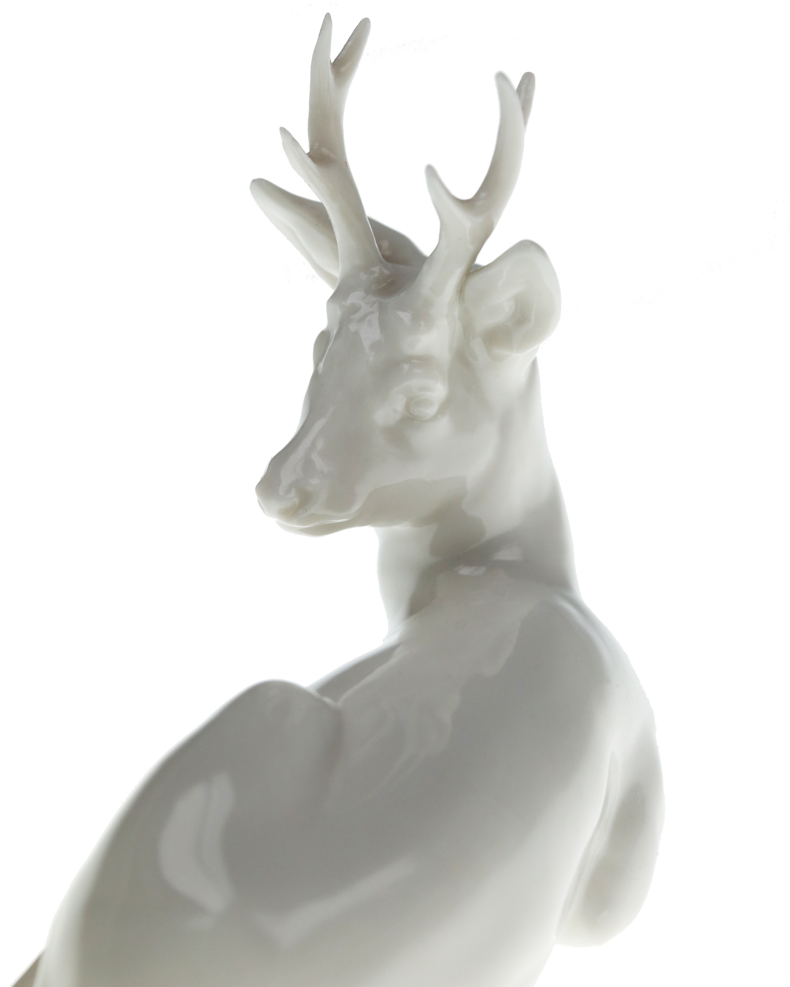 Декоративная статуэтка «Косуля» (Liegender Rehbock), выполненная из высококачественного белого глазурированного фарфора. Произведена на известной фабрике Аллах (Allach). Художник: Т. Кернер (Prof. Theodor Kärner). Размер: высота 73 мм. На нижней плоскости статуэтки имеется клеймо фирмы, номер модели - № 14, имя авто