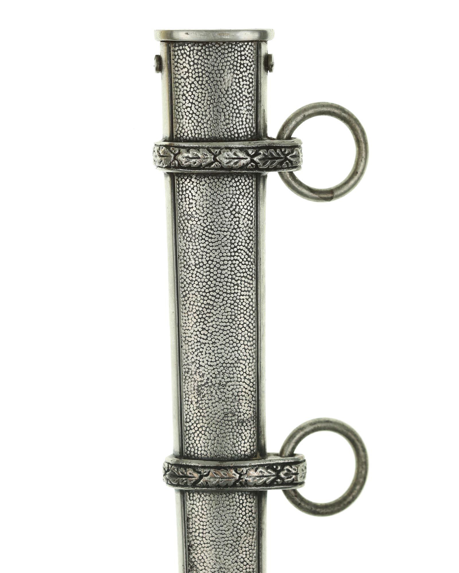 Ножны: Ножны металлические, имеющие с внешней и внутренней стороны мелкоточечную рифленую поверхность в линейной окантовке; прибор состоит из вставного устья; наконечник ножен выполнен в виде полуовала. Обоймицы (гайки) украшены рельефными изображениями дубовых листьев; на каждой обоймице (гайке) подвижно укреплено по одному кольцу. Металлические элементы эфеса и ножны посеребрены.