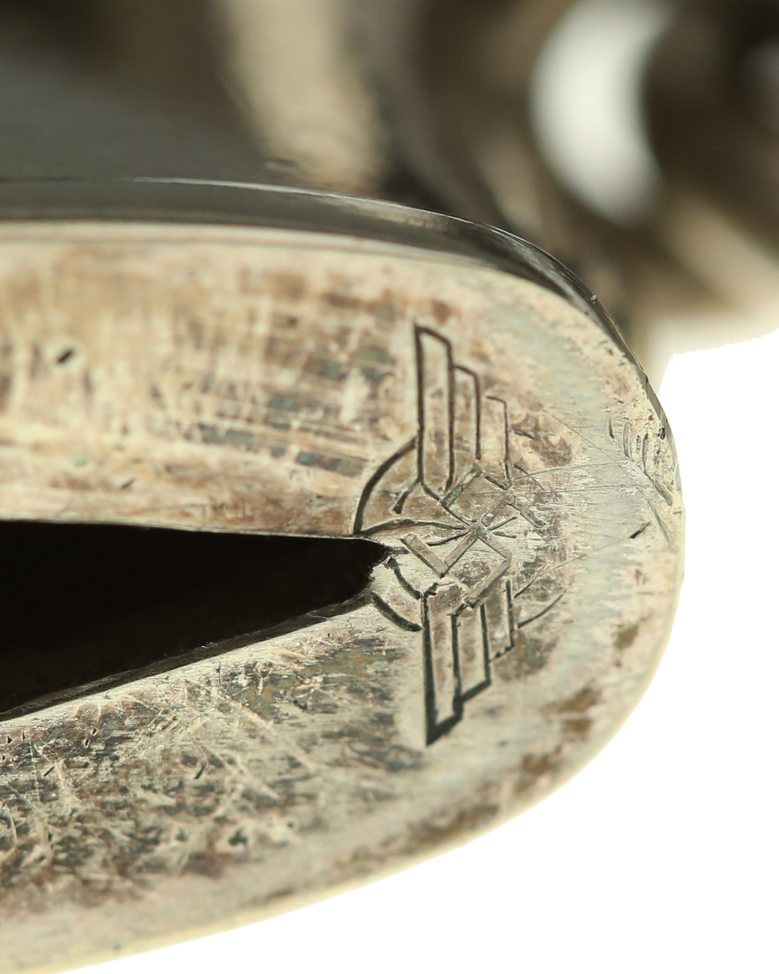 Клинок: Клинок стальной, прямой, ромбического сечения, двулезвийный, никелированный: Основание клинка: нанесена надпись в овале «F. & A. Helbig (GAEFLER), Steinbach». Клеймо немецкой фирмы производителя Ф. и А. Хельбиг (ГЕФЛЕР), Штайнбах.
