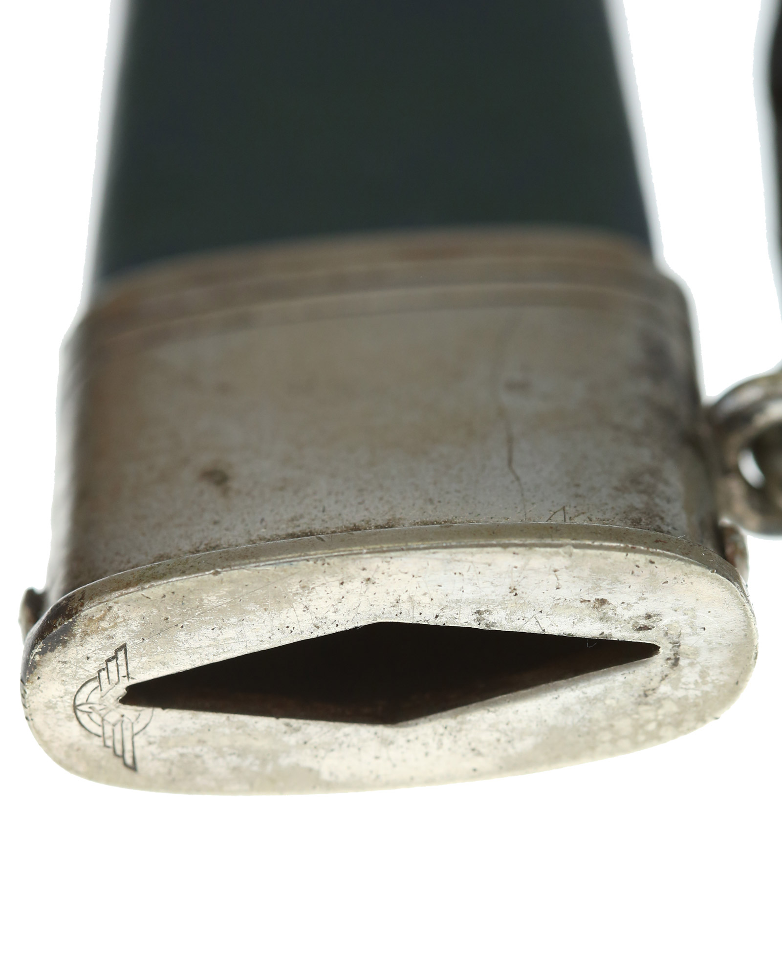 Клинок: Клинок стальной, прямой, ромбического сечения, двулезвийный, никелированный: Основание клинка: нанесено изображение короля, держащего меч и буквы «Stöcker & Co. SMF (Solinger Metallwaren-Fabrik GmbH, Fabrik feiner Stahl- und Metallwaren), Solingen» — клеймо немецкой фирмы производителя Штокер и К., Золинген.