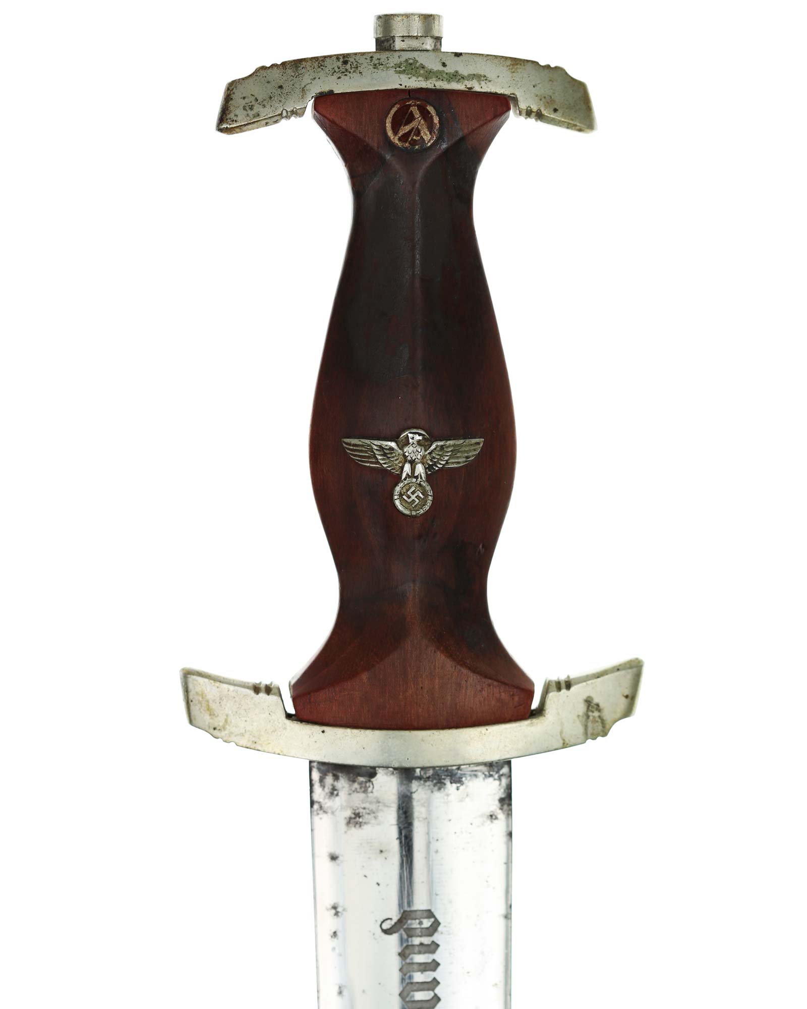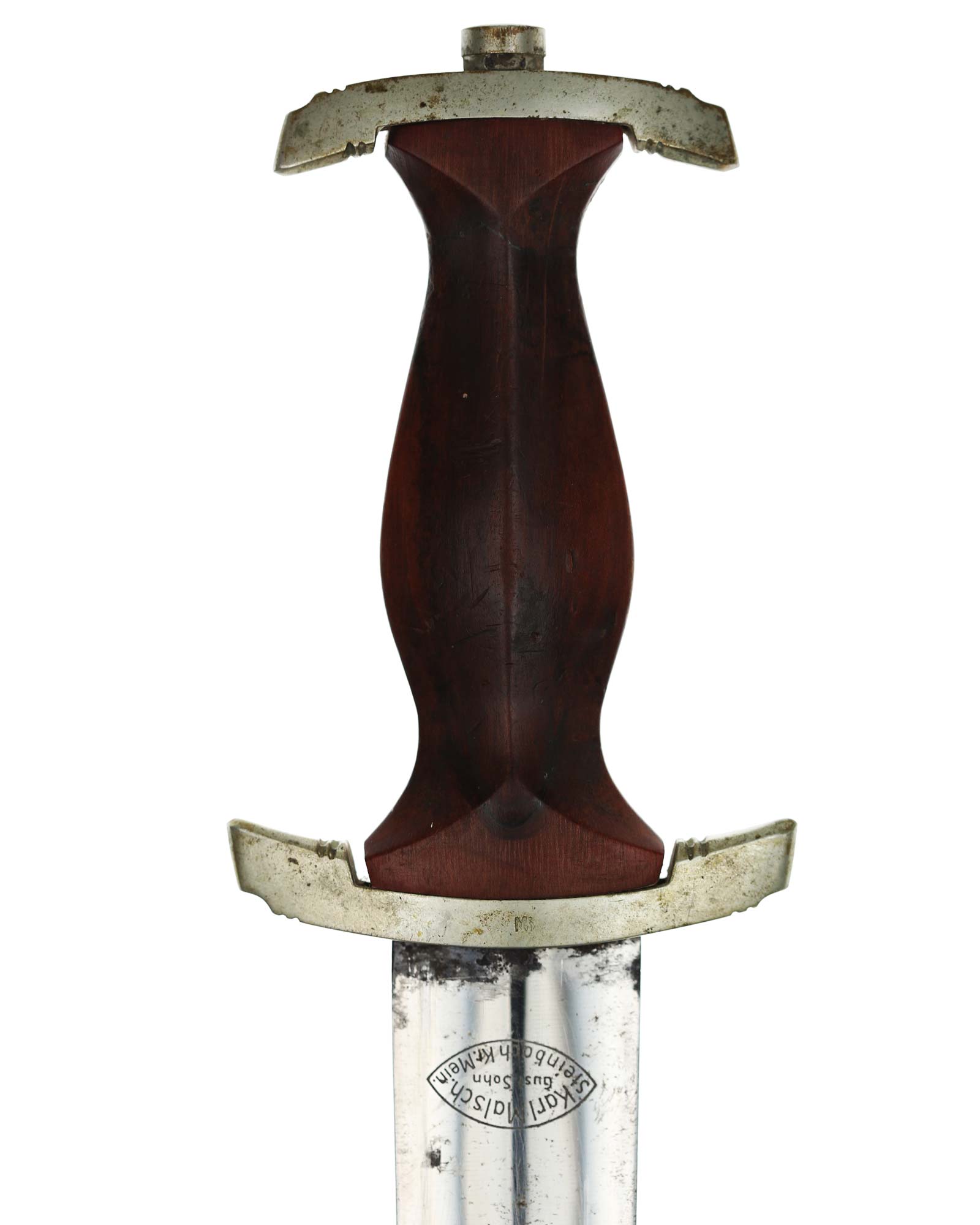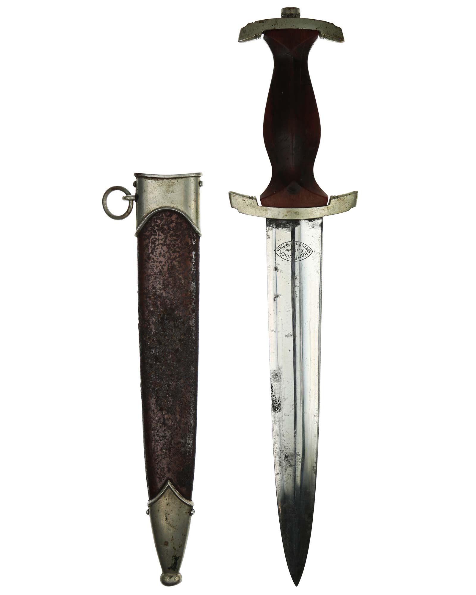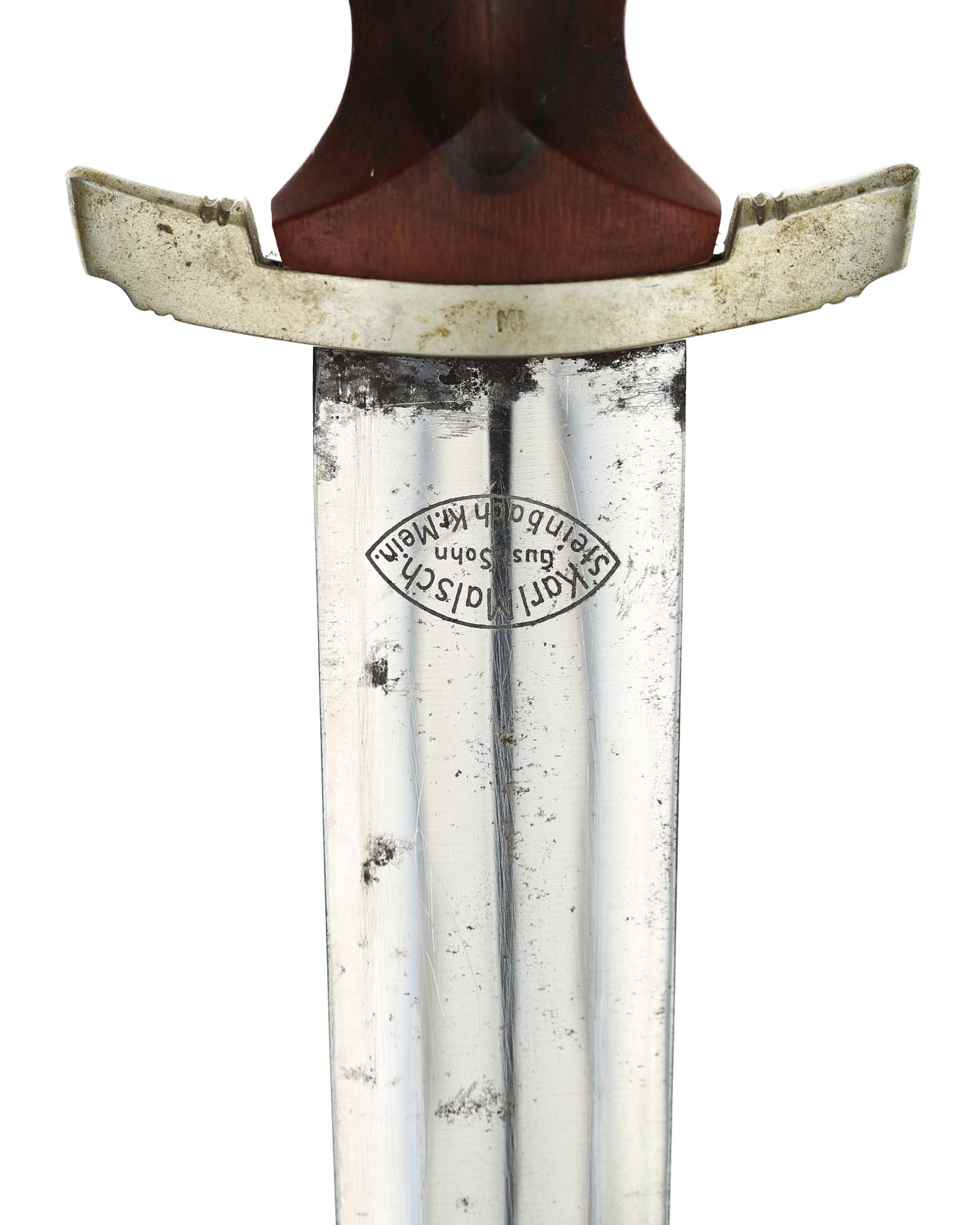 Клинок: Клинок кинжала прямой, стальной, двулезвийный, кинжального типа, с выраженным центральным ребром. На одной стороне клинка методом травления нанесен девиз СА «Всё для Германии» (Alles für Deutchland). Клинок на оборотной стороне у основания стоит клеймо производителя Karl Malsch Gustav & Sohn Steinbach Kr. Mein (Карл Мальш Штайнбах).