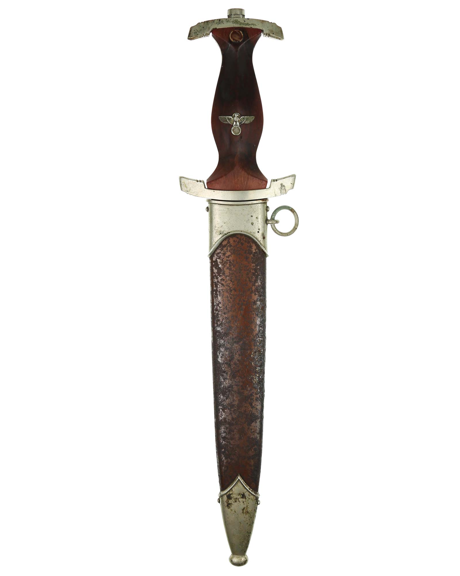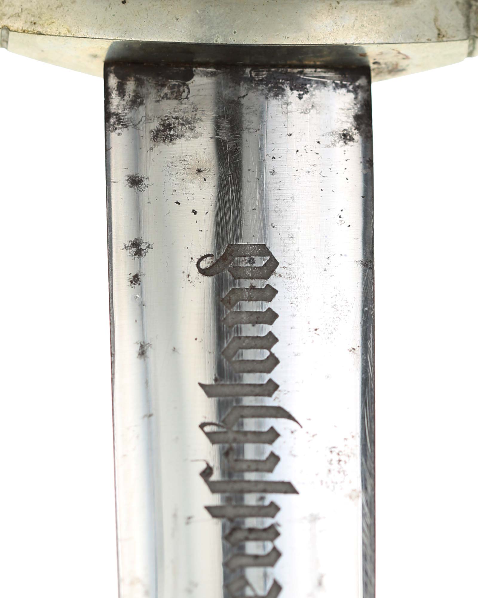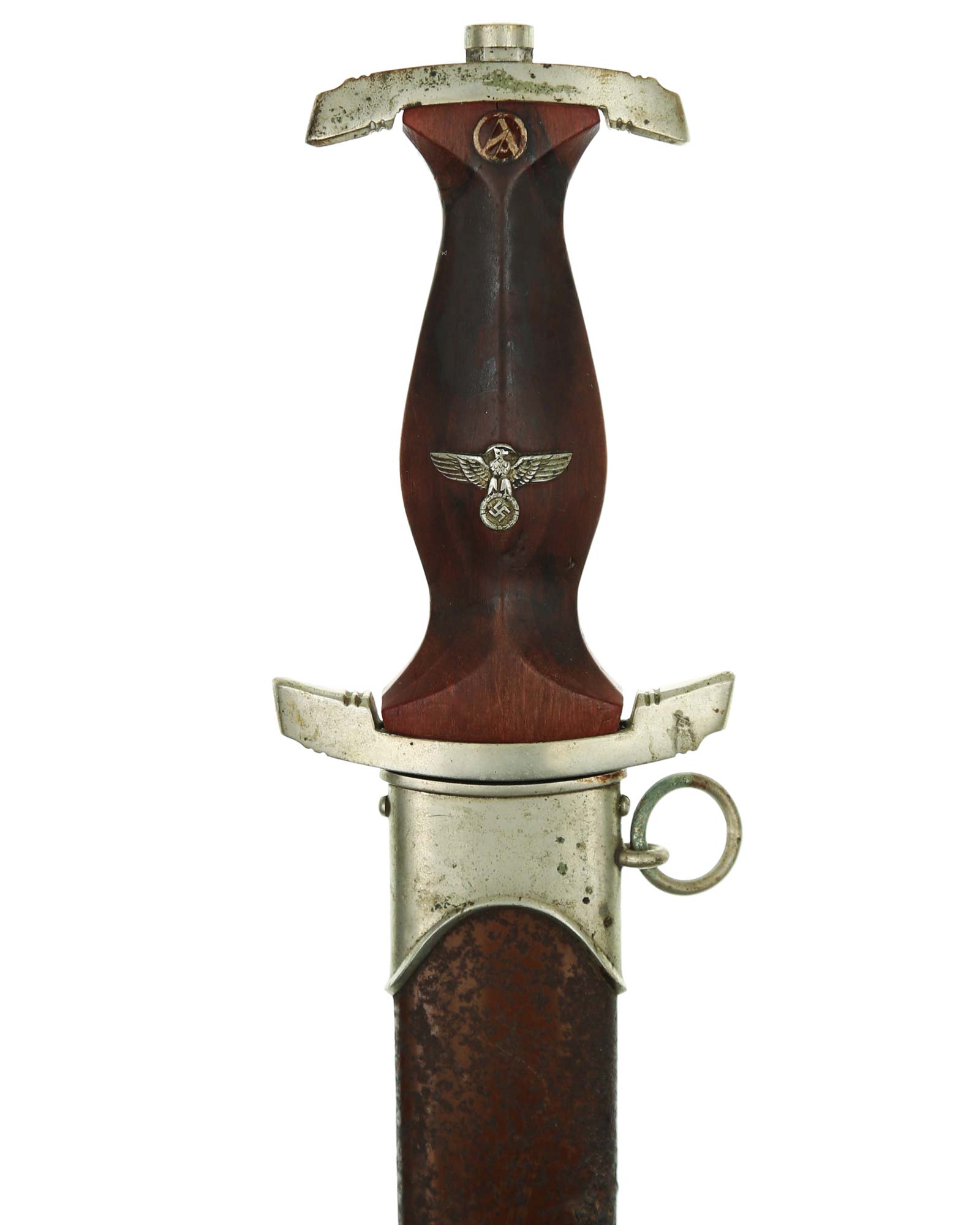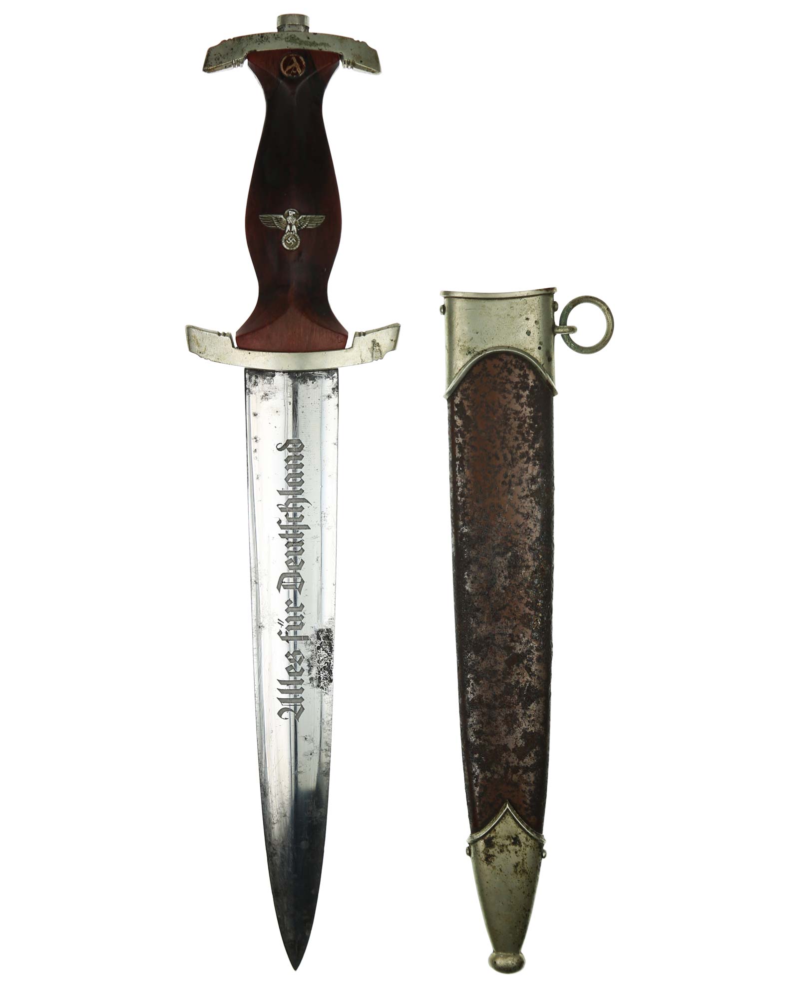 Клинок: Клинок кинжала прямой, стальной, двулезвийный, кинжального типа, с выраженным центральным ребром. На одной стороне клинка методом травления нанесен девиз СА «Всё для Германии» (Alles für Deutchland). Клинок на оборотной стороне у основания стоит клеймо производителя Karl Malsch Gustav & Sohn Steinbach Kr. Mein (Карл Мальш Штайнбах).