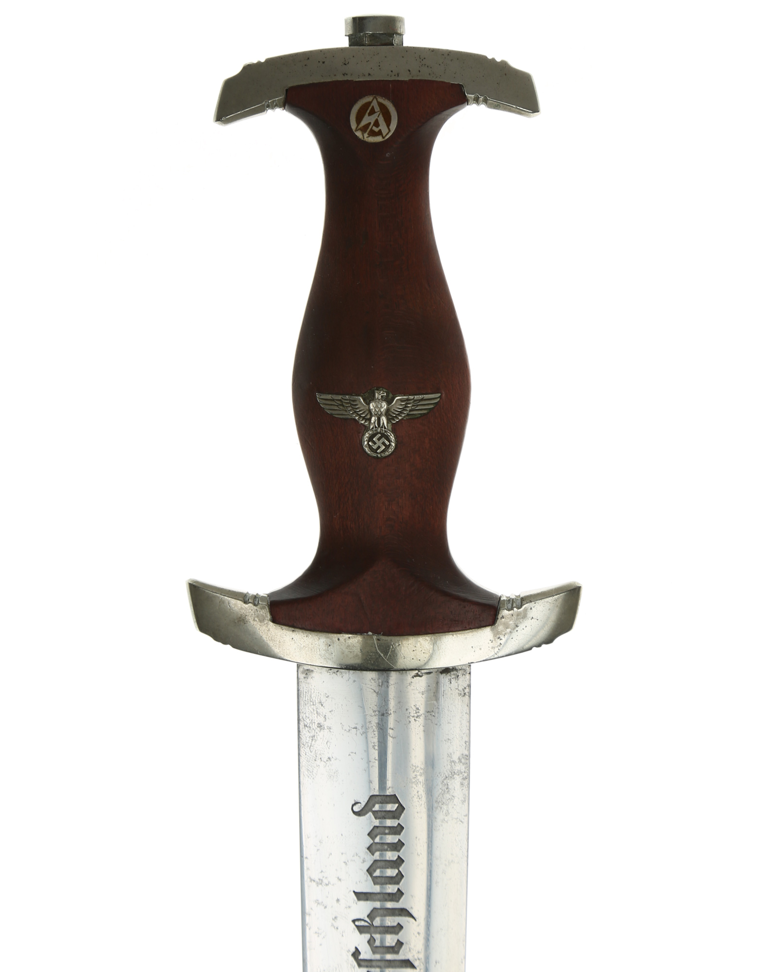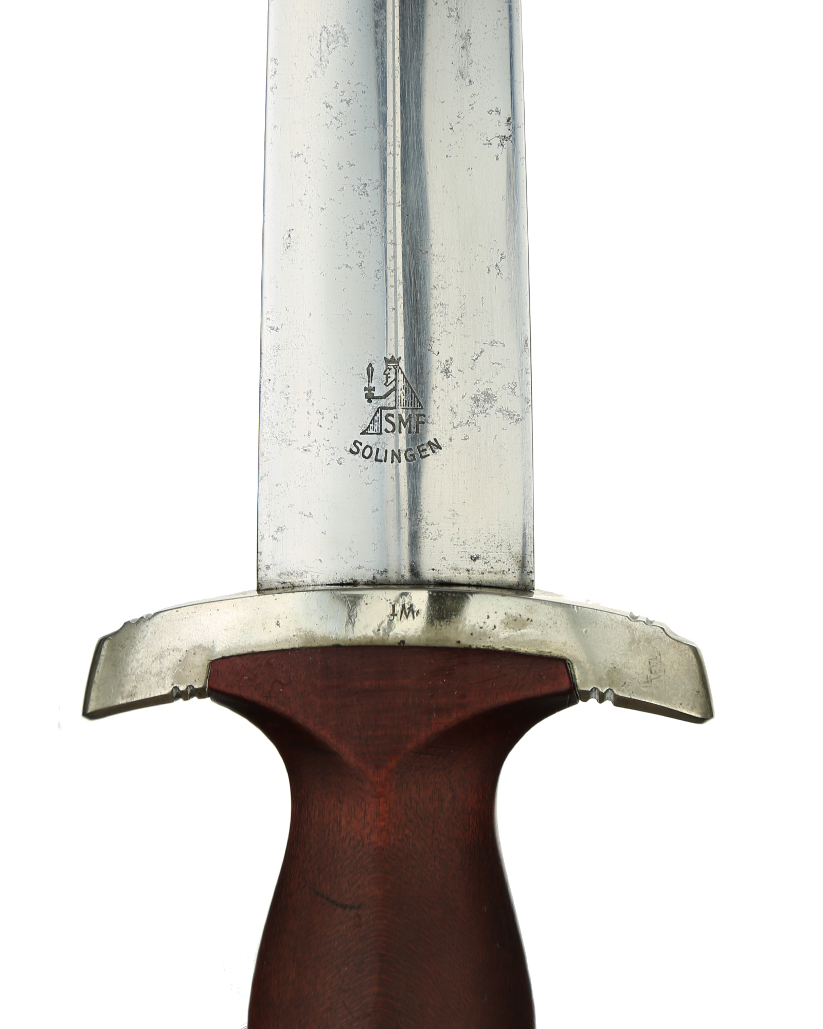 Эфес состоит из рукояти, верхней гарды и крестовины. Крестовина и гарда загнуты к рукояти: Крестовина: «Wf» — клеймо-код группы СА — «Westfalen». На рукояти, выполненной из дерева, располагается медальон в виде имперского орла и эмалевая вставка с эмблемой СА. Хвостовик клинка укреплен на верхней крестовине при помощи винта. Клинок стальной, прямой, двулезвийный, 4-гранный в сечении, без долов. На клинке готическим шрифтом нанесена надпись Alles fur Deutchland «Всё для Германии». Основание клинка: нанесено изображение короля, держащего меч и буквы «SMF Solingen» — клеймо немецкой фирмы производителя Штокер и К., Золинген. Фирма была основана в 1897 году, зарегистрирована в 1905 году. В период 1933-1945 гг. изготавливала кинжалы и их детали. Ножны стальные, окрашенные в коричневый цвет, с накладными наконечником и устьем с кольцом. Наконечник и устье ножен крепятся при помощи двух винтов. Ножны в оригинальном коричневом оксидировании. Кинжал комплектуется оригинальным кожаным подвесом.