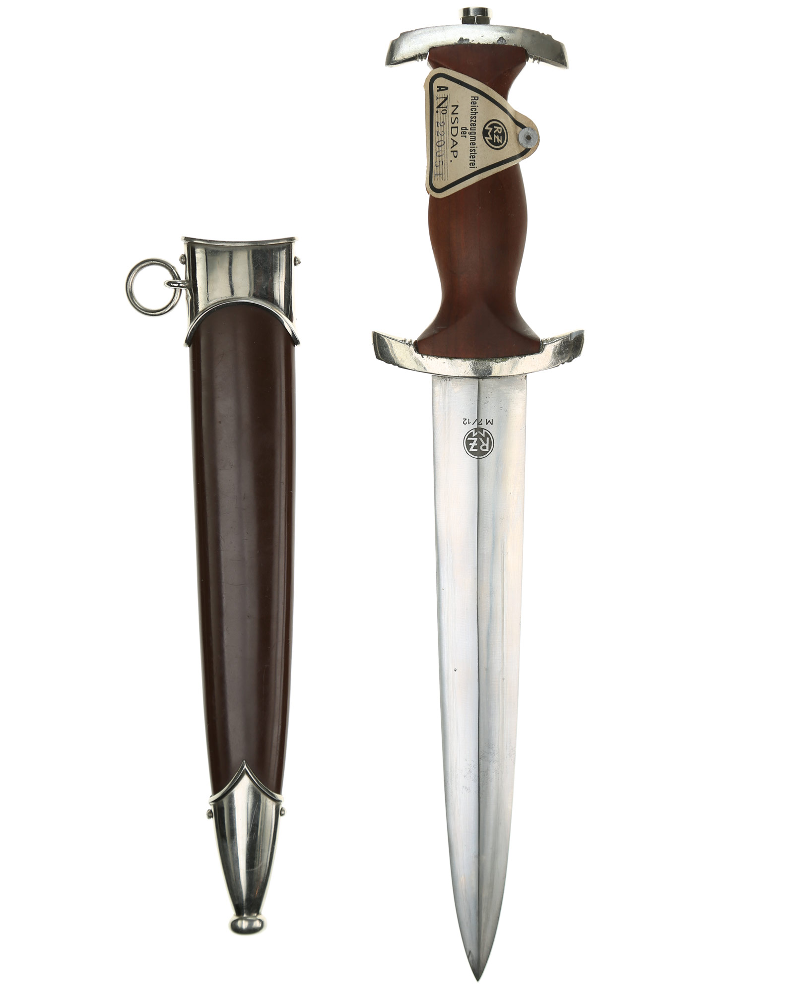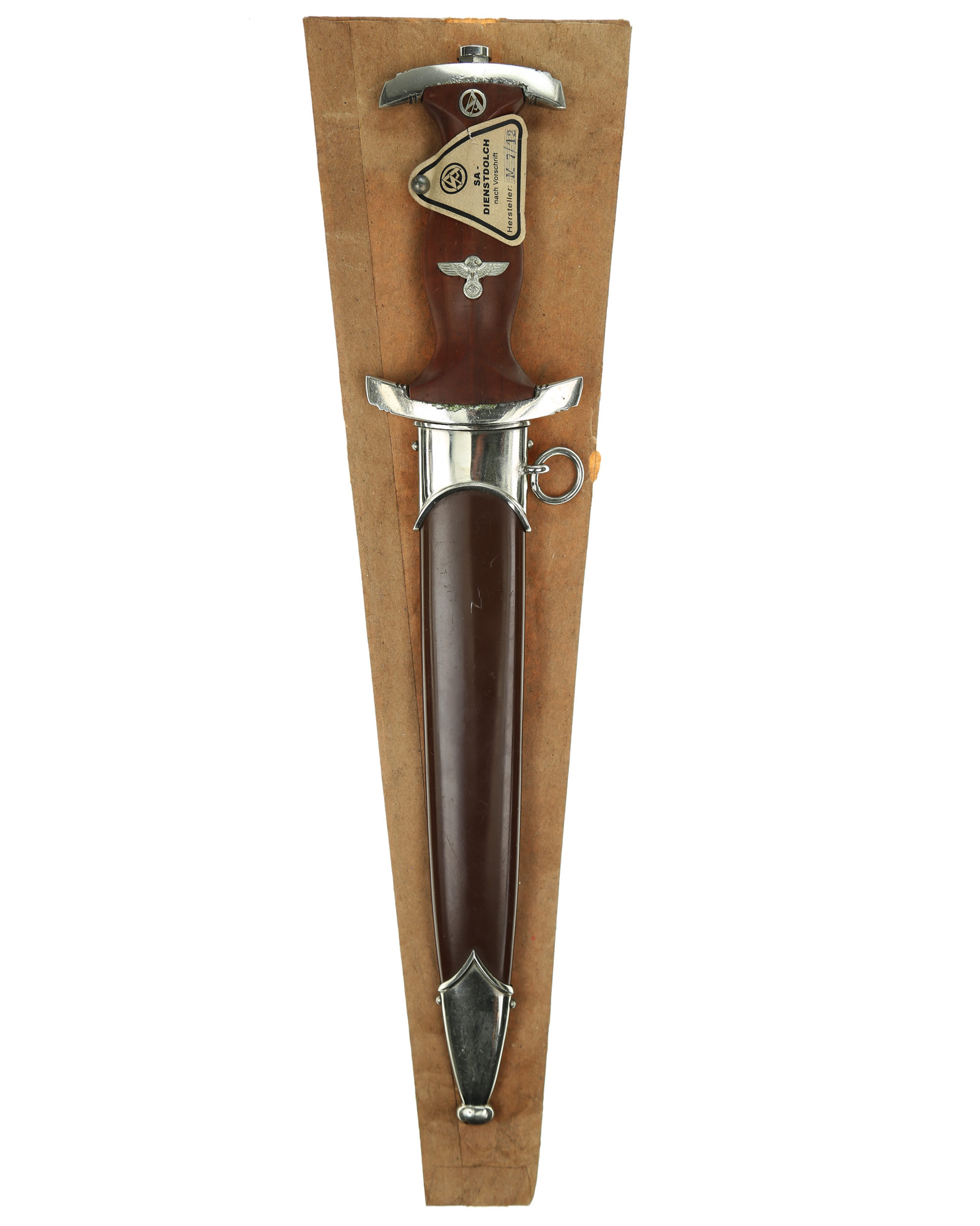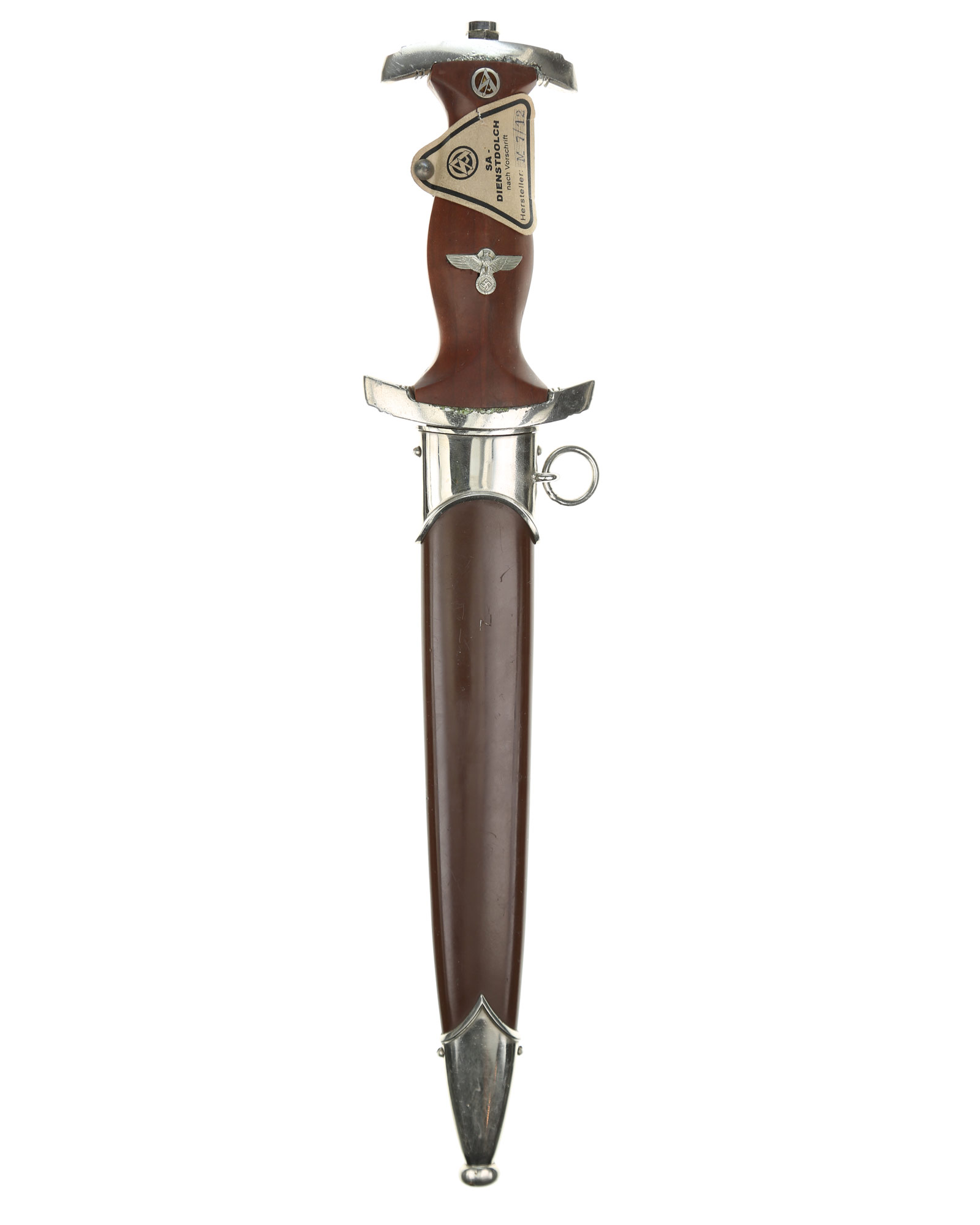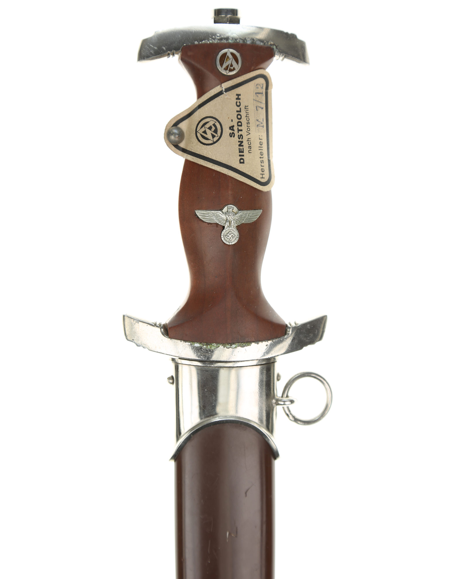 Прибор рукояти и ножен никелирован. Рукоять изготовлена из проваренного и прокрашенного в темно-бордовый цвет дерева, в которую вмонтированы алюминиевый орел и эмалевая эмблема SA. На рукояти сохранилась этикетка с номером M7/12, поставленная при производстве кинжала. Клинок классический кинжального типа, стальной, прямой, двулезвийный, с выраженным центральным ребром. На клинке превосходно сохранилась заводская полировка. На лицевой стороне нанесен травлением девиз SА «Alles für Deutchland» «Всё для Германии», на оборотной стороне у основания стоит совмещенное клеймо производителя Вайерсберг Макс Ваффенфабрик (ВМВ), Золинген с кодом RZM, M7/12 (Weyersberg Max Waffenfabrik, WMW Solingen). Ножны в оригинальнй заводской краске сохранившейся на 100%. Превосходная нетронутая сохранность.