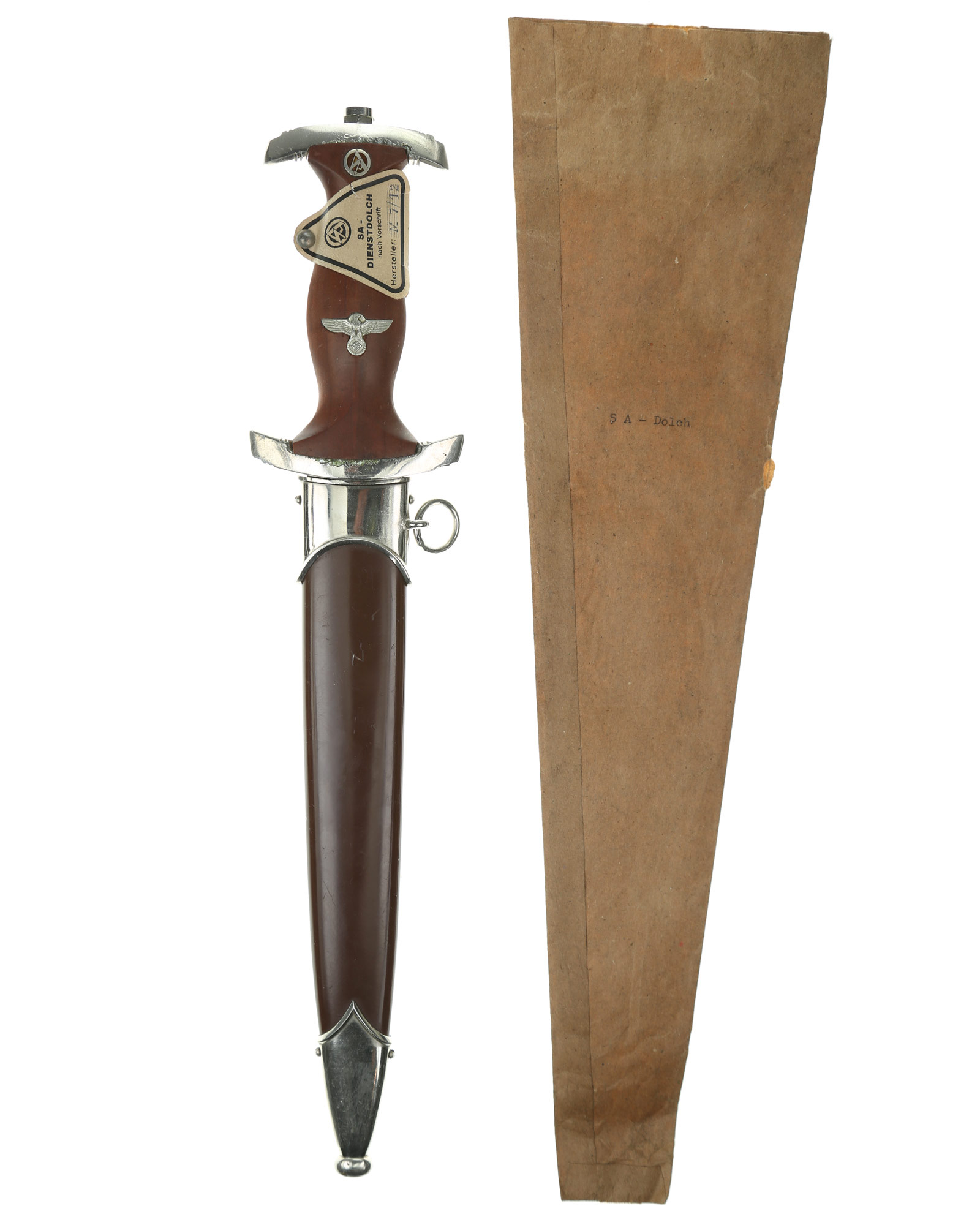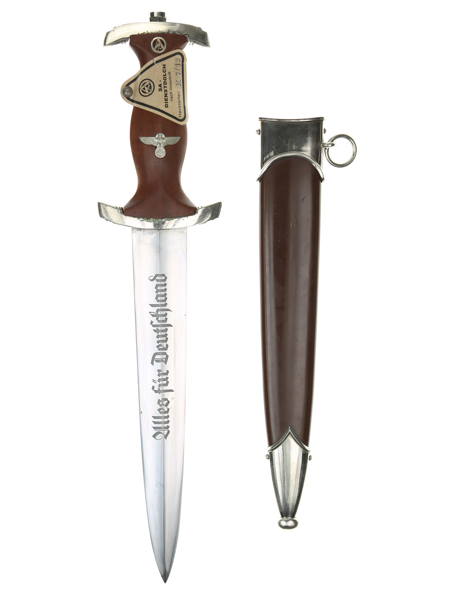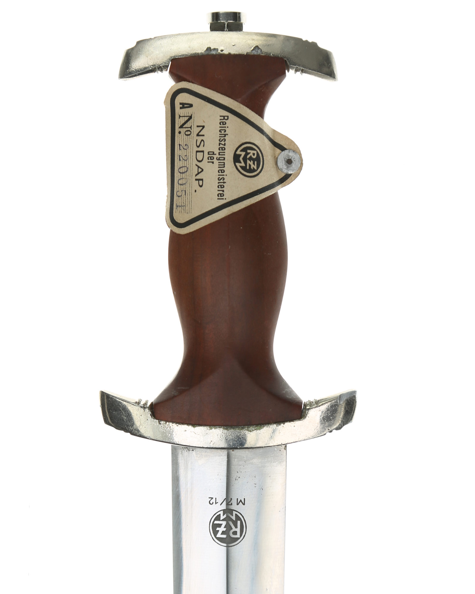 Прибор рукояти и ножен никелирован. Рукоять изготовлена из проваренного и прокрашенного в темно-бордовый цвет дерева, в которую вмонтированы алюминиевый орел и эмалевая эмблема SA. На рукояти сохранилась этикетка с номером M7/12, поставленная при производстве кинжала. Клинок классический кинжального типа, стальной, прямой, двулезвийный, с выраженным центральным ребром. На клинке превосходно сохранилась заводская полировка. На лицевой стороне нанесен травлением девиз SА «Alles für Deutchland» «Всё для Германии», на оборотной стороне у основания стоит совмещенное клеймо производителя Вайерсберг Макс Ваффенфабрик (ВМВ), Золинген с кодом RZM, M7/12 (Weyersberg Max Waffenfabrik, WMW Solingen). Ножны в оригинальнй заводской краске сохранившейся на 100%. Превосходная нетронутая сохранность.