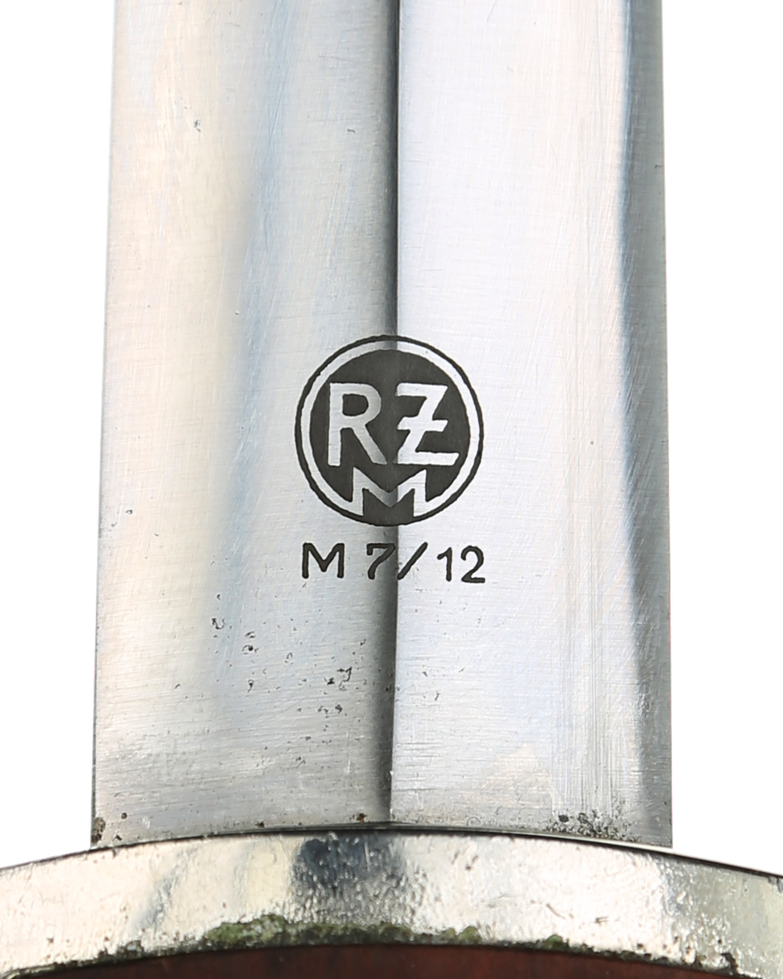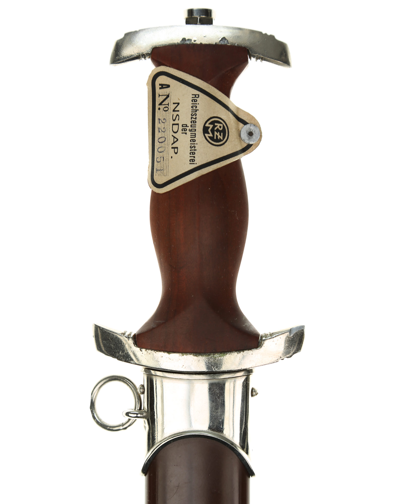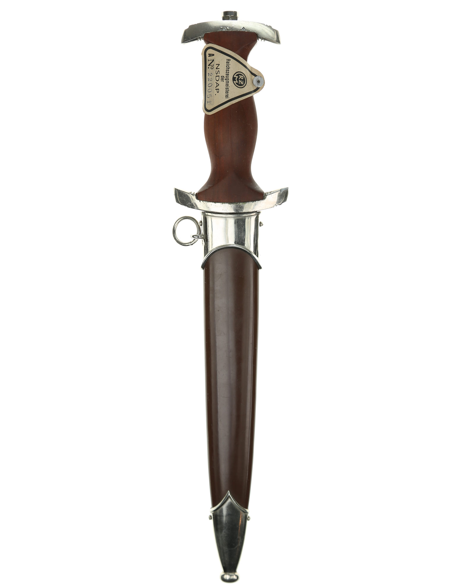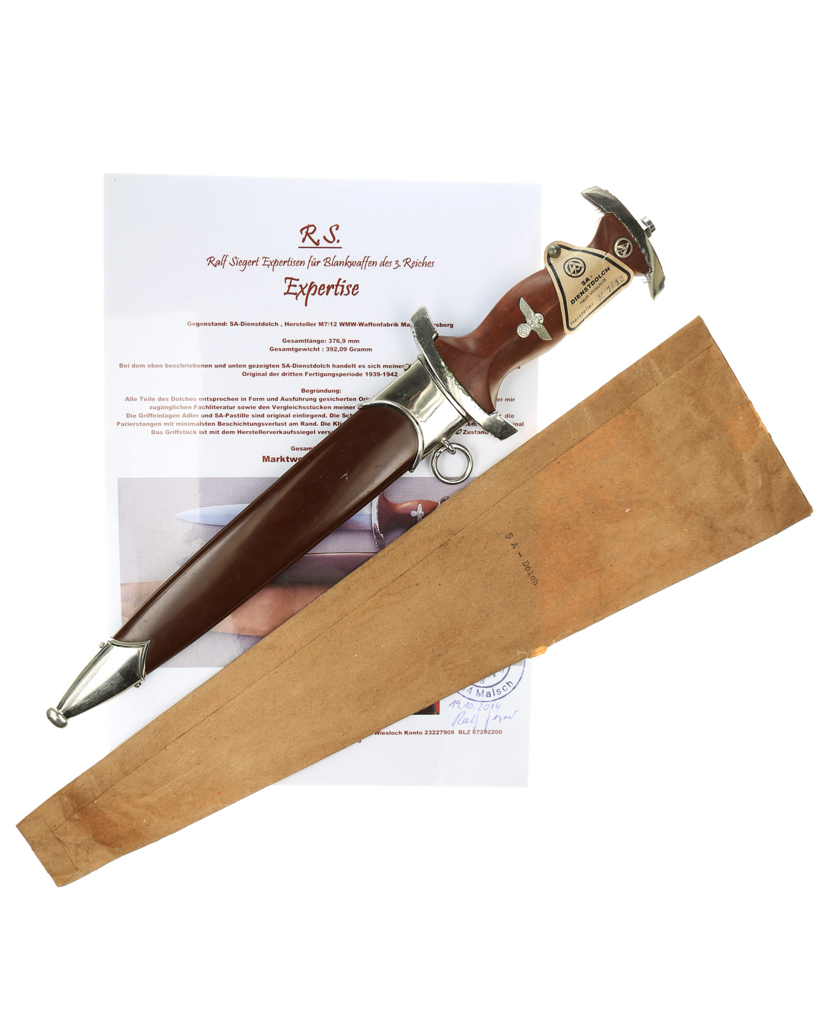 Прибор рукояти и ножен никелирован. Рукоять изготовлена из проваренного и прокрашенного в темно-бордовый цвет дерева, в которую вмонтированы алюминиевый орел и эмалевая эмблема SA. На рукояти сохранилась этикетка с номером M7/12, поставленная при производстве кинжала. Клинок классический кинжального типа, стальной, прямой, двулезвийный, с выраженным центральным ребром. На клинке превосходно сохранилась заводская полировка. На лицевой стороне нанесен травлением девиз SА «Alles für Deutchland» «Всё для Германии», на оборотной стороне у основания стоит совмещенное клеймо производителя Вайерсберг Макс Ваффенфабрик (ВМВ), Золинген с кодом RZM, M7/12 (Weyersberg Max Waffenfabrik, WMW Solingen). Ножны в оригинальнй заводской краске сохранившейся на 100%. Превосходная нетронутая сохранность.