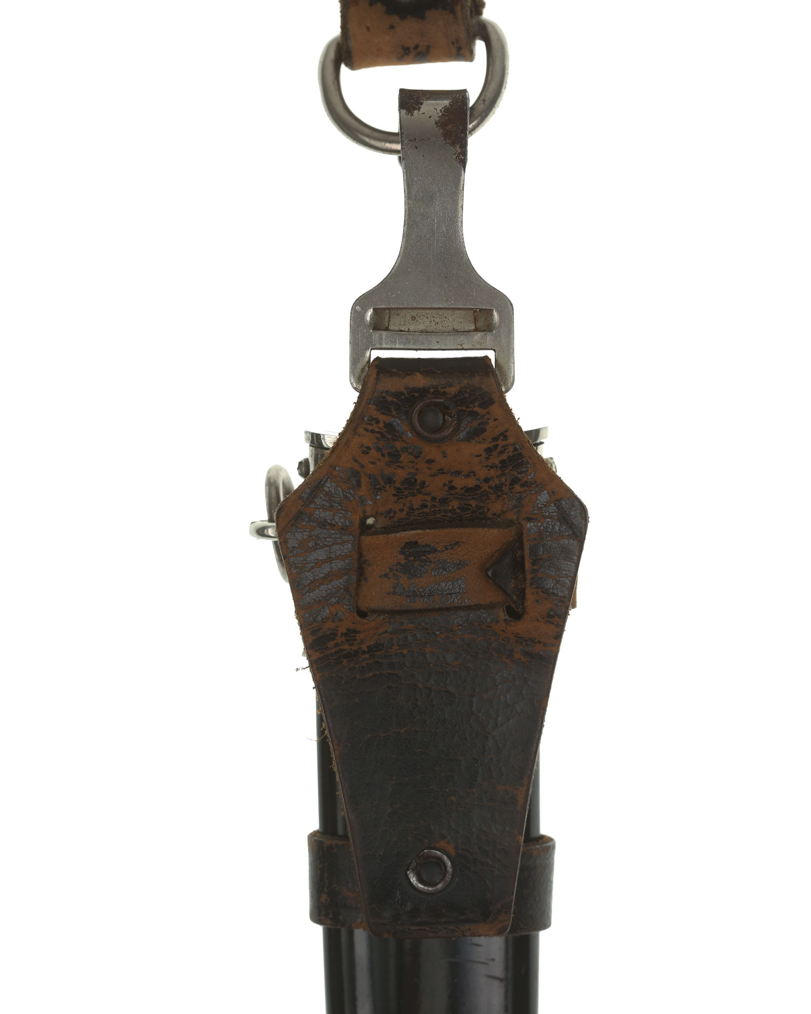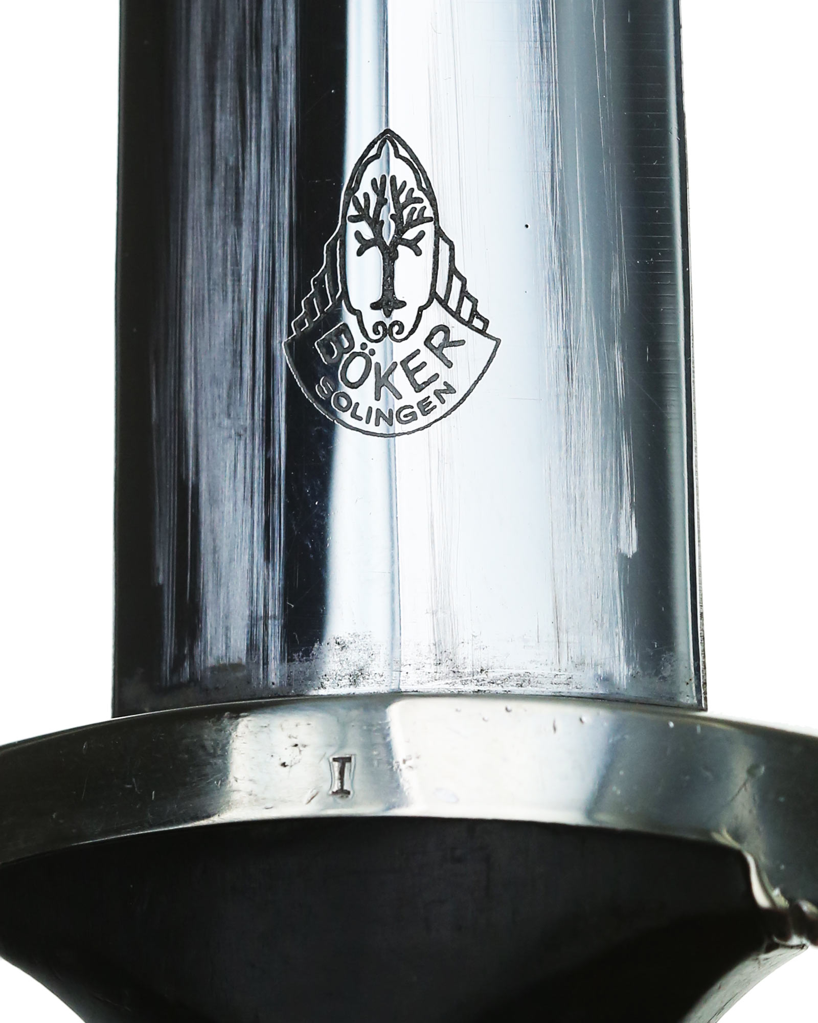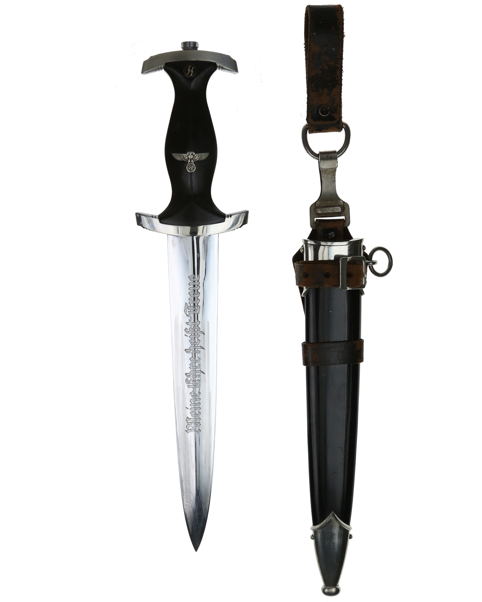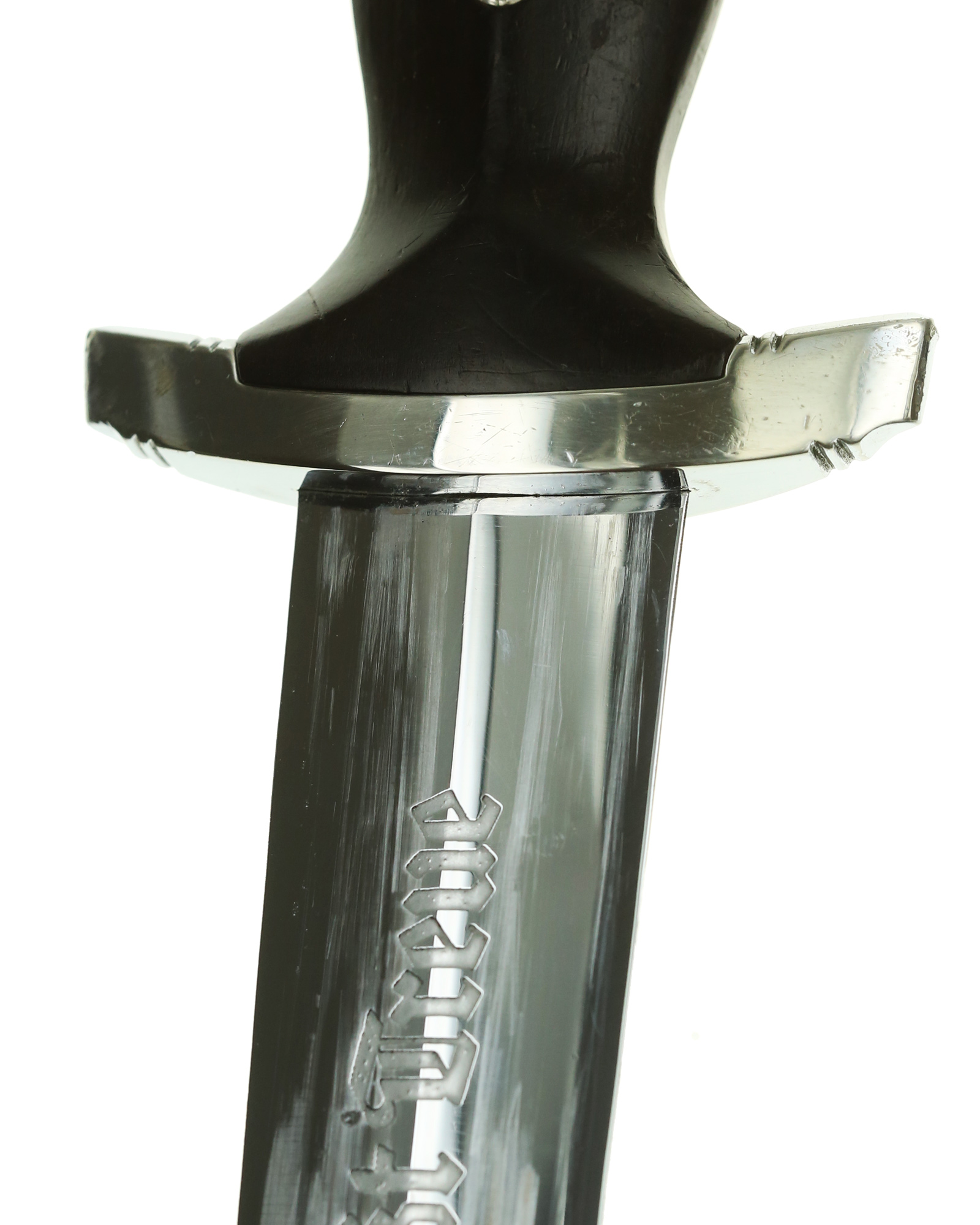 Клинок: Клинок кинжала прямой, стальной, двулезвийный, кинжального типа, с выраженным центральным ребром. На одной стороне клинка методом травления нанесен девиз СС «Meine Ehre heisst Treue» (Моя честь называется верностью). Клинок на оборотной стороне у основания стоит клеймо производителя Хайнрих Беккер, Золинген (Heinrich Böker, Solingen).