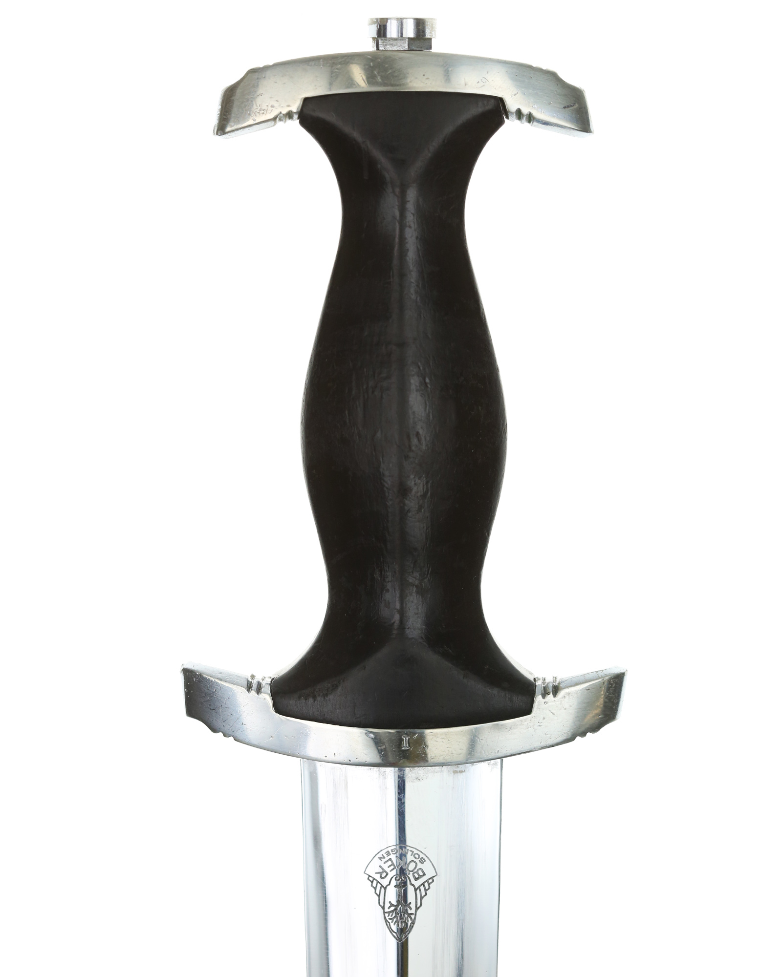 Рукоять: Рукоять из мореного в черный цвет дерева. Рукоять в верхней части имеет вставку в виде черного эмалевого глазка с рунами, в средней части рукояти – металлический знак в виде стилизованного изображения раскинувшего крылья орла, держащего в когтях венок со свастикой. Металлические элементы гарды изготовлены из мельхиора. Крестовина С-образная, белого металла, с концами, чуть загнутыми вверх, в несколько увеличенном и перевернутом виде копирует навершие рукояти.