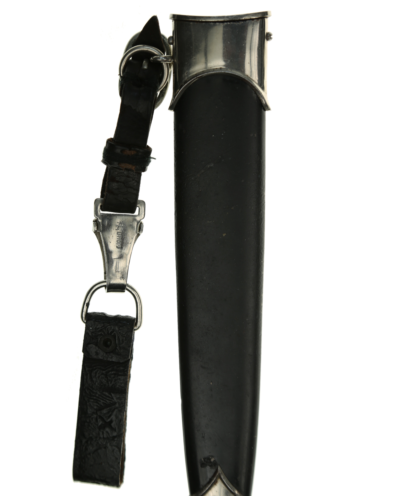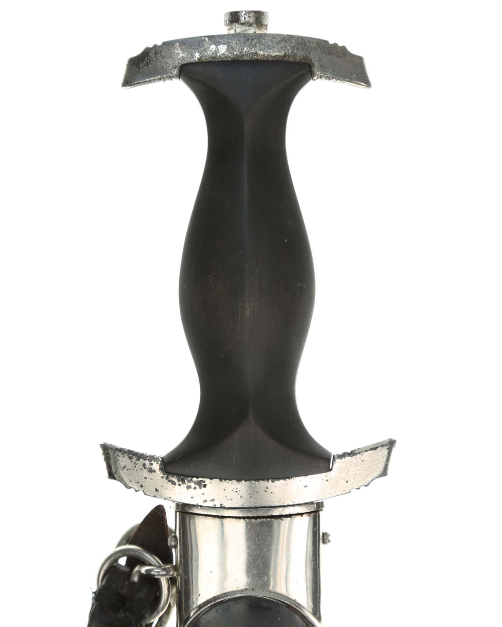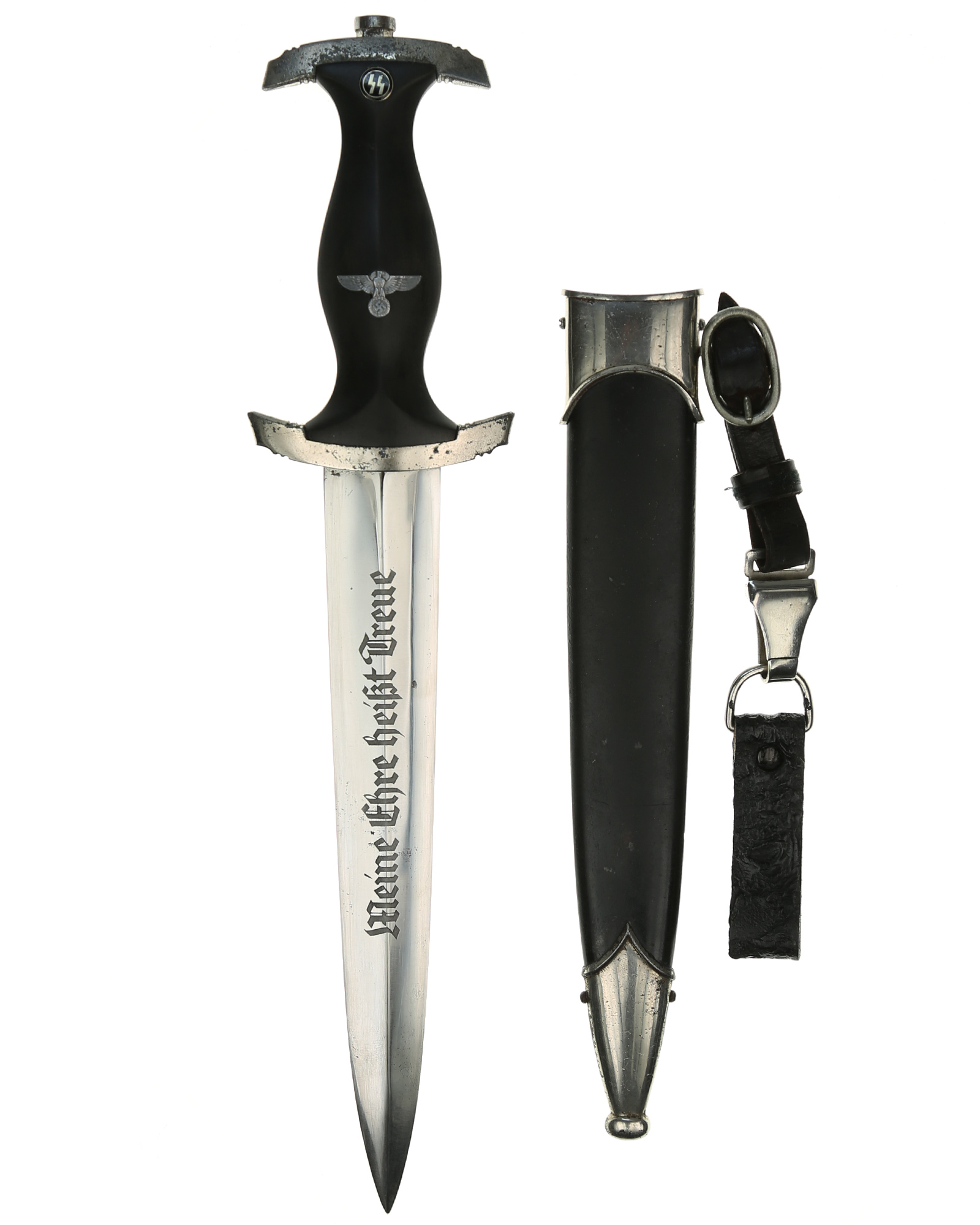 Рукоять из мореного в черный цвет дерева. Клинок стальной, классический кинжального типа, прямой, двулезвийный, с выраженным центральным ребром. Традиционно на лицевой стороне методом травления нанесен девиз СС Meine Ehre heisst Treue (Моя честь называется верностью). Клинок с клейма производителя RZM M7/37 (Robert Klaas Solingen), RZM 1051/38 SS. Металлические элементы гарды мельхиоровые, вмонтированный в рукоять орел. Ножны металлические в черном лаке. Превосходно сохранился оригинальный подвес. Хорошая сохранность.
