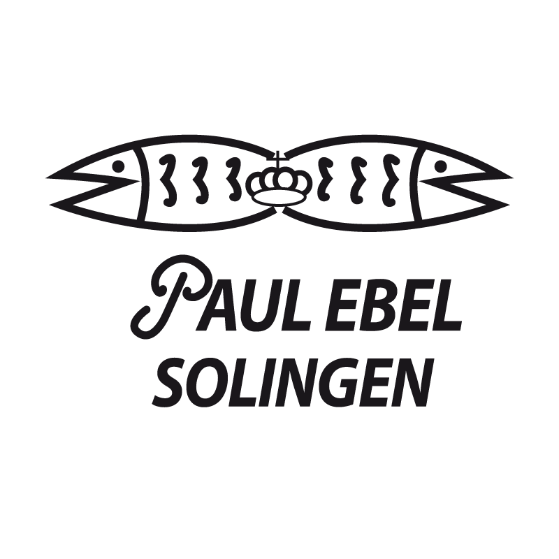 Логотип Пауль Эбель показывает текст „Paul Ebel Solingen“ в чётком, растянутом шрифте, часто с стилизованным символом, как изображено на клинках кинжалов, и два рыбы и корона в середине как центральный элемент.