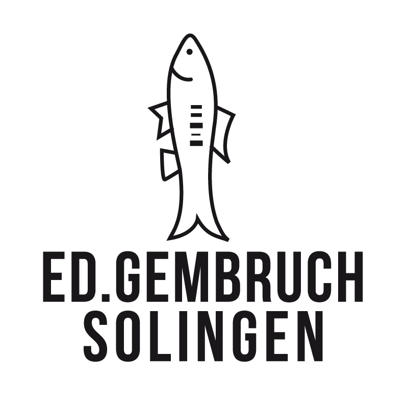 Логотип Эдуард Гембрух показывает текст „Eduard Gembruch Solingen“ в чётком, растянутом шрифте, часто с стилизованной рыбой как центральным элементом, указывающим на качество и традицию производителя, обычно вытравленный на клинках.