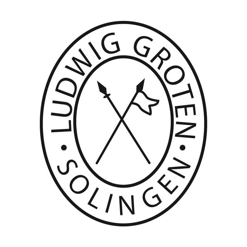 Логотип Людвиг Гротен показывает текст „Ludwig Groten Solingen“ в чётком, растянутом шрифте, часто с стилизованным якорем, символизирующим стабильность и качество, обычно вытравленным на клинках.