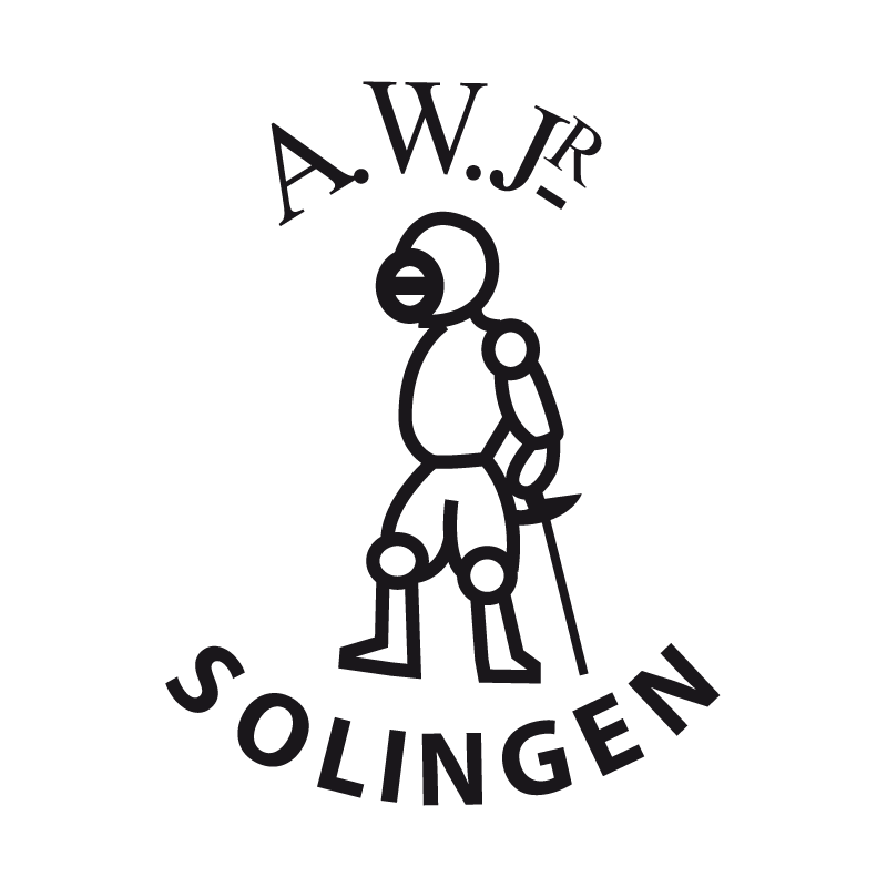 Логотип Антон Юниор Винген представляет собой стилизованный силуэт рыцаря или воина, стоящего с мечом или посохом, с "A.W.JR" сверху и "SOLINGEN" изогнутым снизу. Логотип в тёмно-сером цвете на прозрачном фоне, символизирующий рыцарство и традицию, обычно вытравленный на клинках.