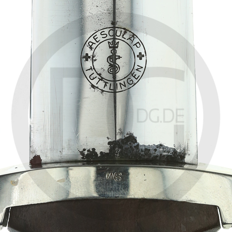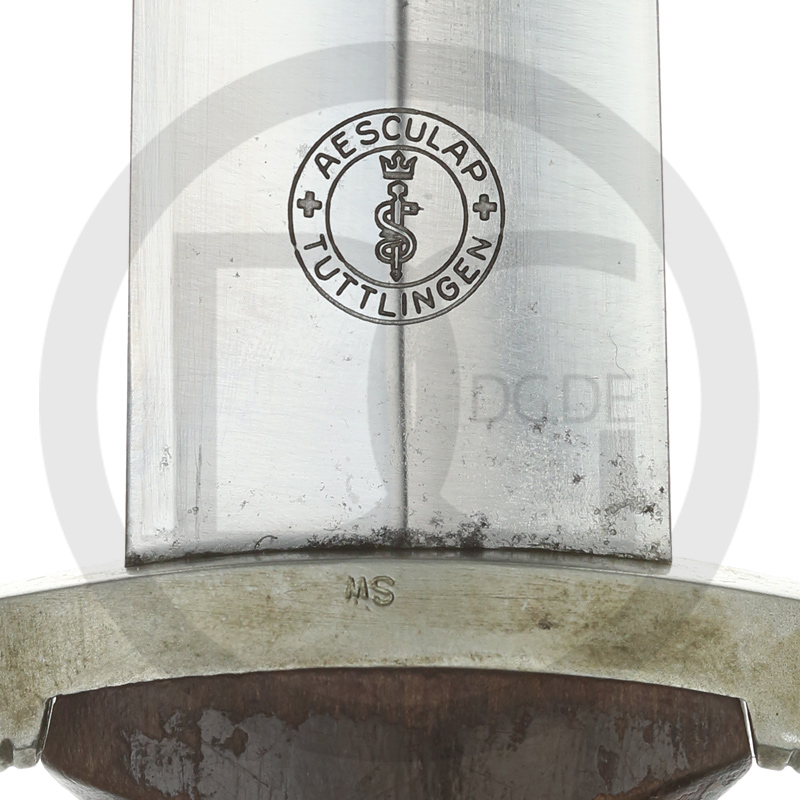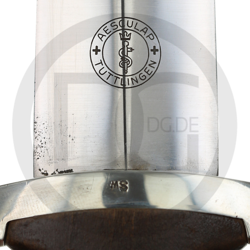 По травлёному логотипу со змеёй и посохом, надписи «AESCULAP TUTTLINGEN», ранним никелевым деталям и высокому качеству обработки рукояти и клинка.