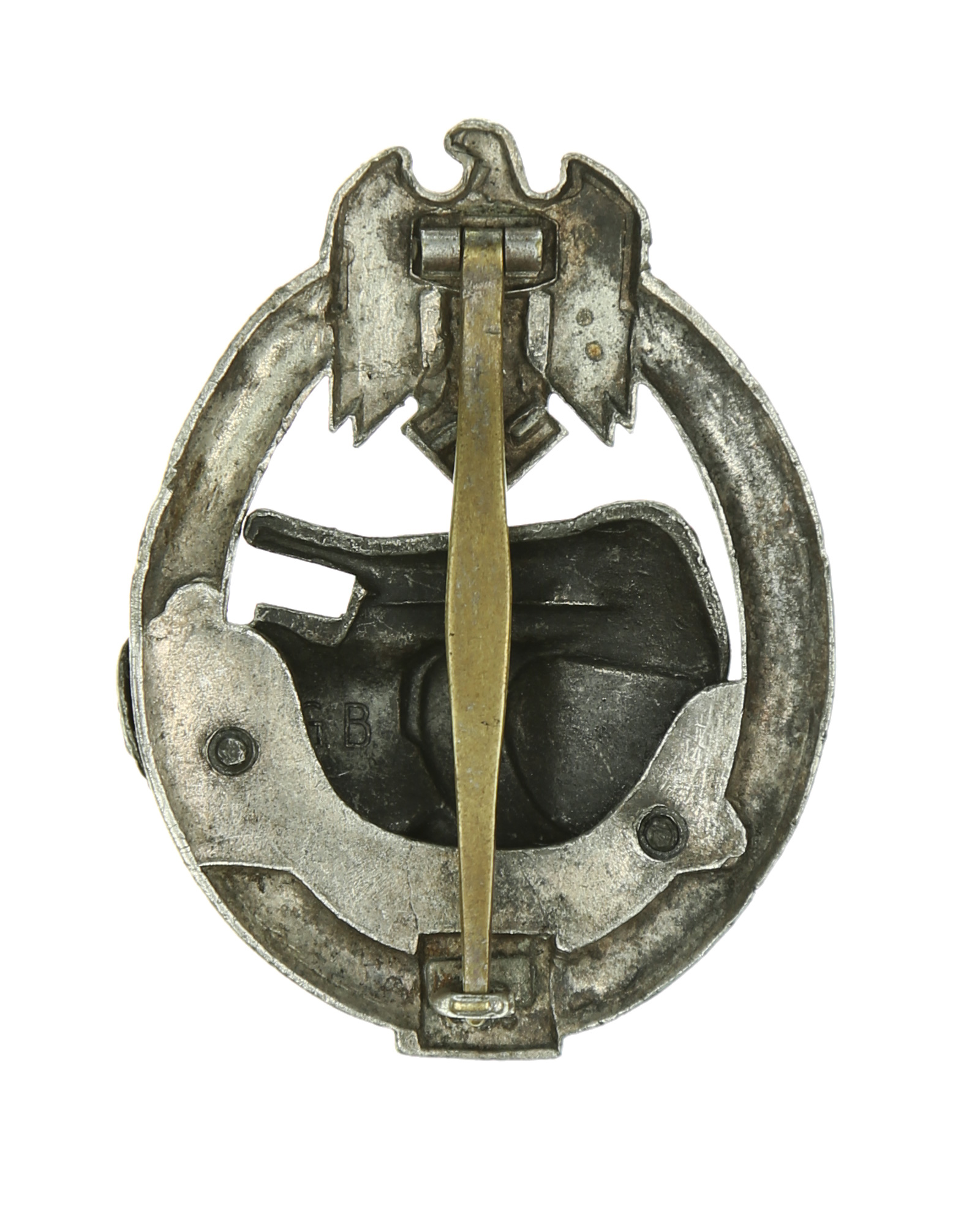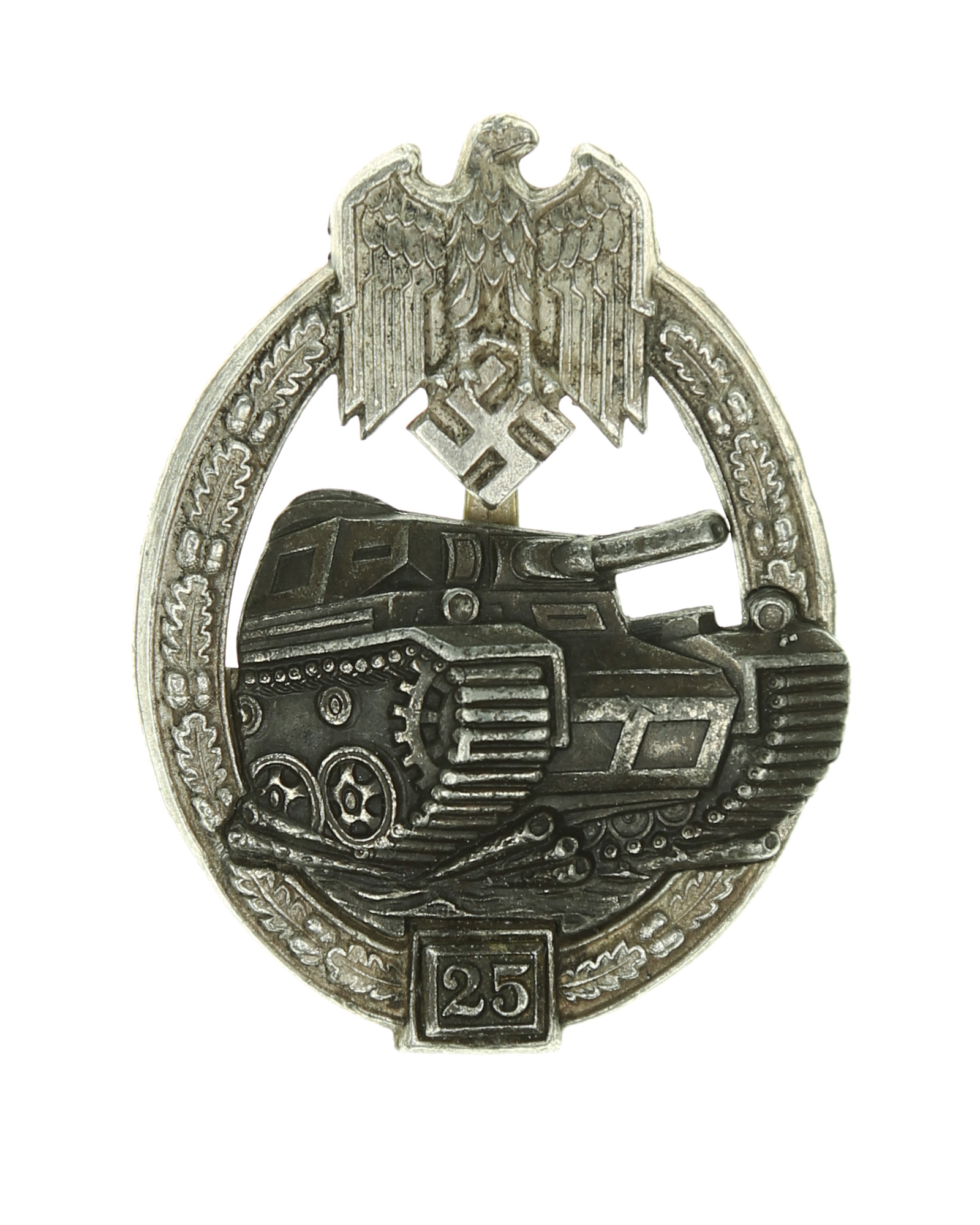Оригинальнй танковый боевой знак в серебре с цифрой «25». Цинк, бронзирование. Клеймо: G.B. (производитель «Gustav Brehmer», Markneukirchen). Стальная булавка. Ширина знака 48 мм; высота 62 мм; вес 26 гр. Хорошее состояние. Очень редкий.