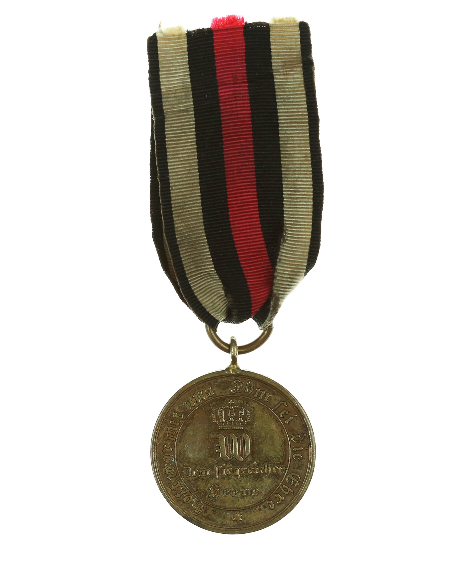 Памятная военная медаль за кампании 1870-1871 гг. учреждена 20.05.1871 г. кайзером и королем Пруссии Вильгельмом I для награждения военнослужащих прусской и союзных армий, принимавших участие во франко-прусской войне (19.07.1870-10.05.1871), а также некомбатантов, включая женщин. В статуте награды особо оговаривалось, что медаль также вручалась экипажу и обслуживающему персоналу императорского корвета “Августа” (SMS Augusta), несшим службу с 11.12.1870 г. по 02.03.1871 г. Дизайн штампа разрабатывался Вильгельмом Куллрихом.