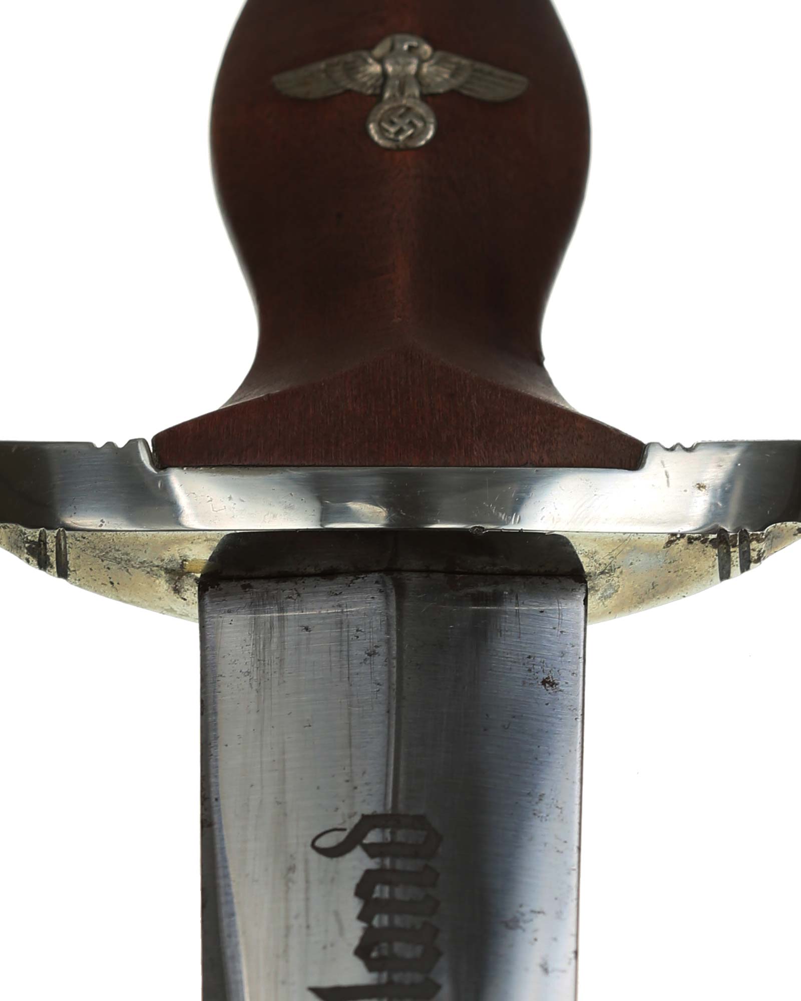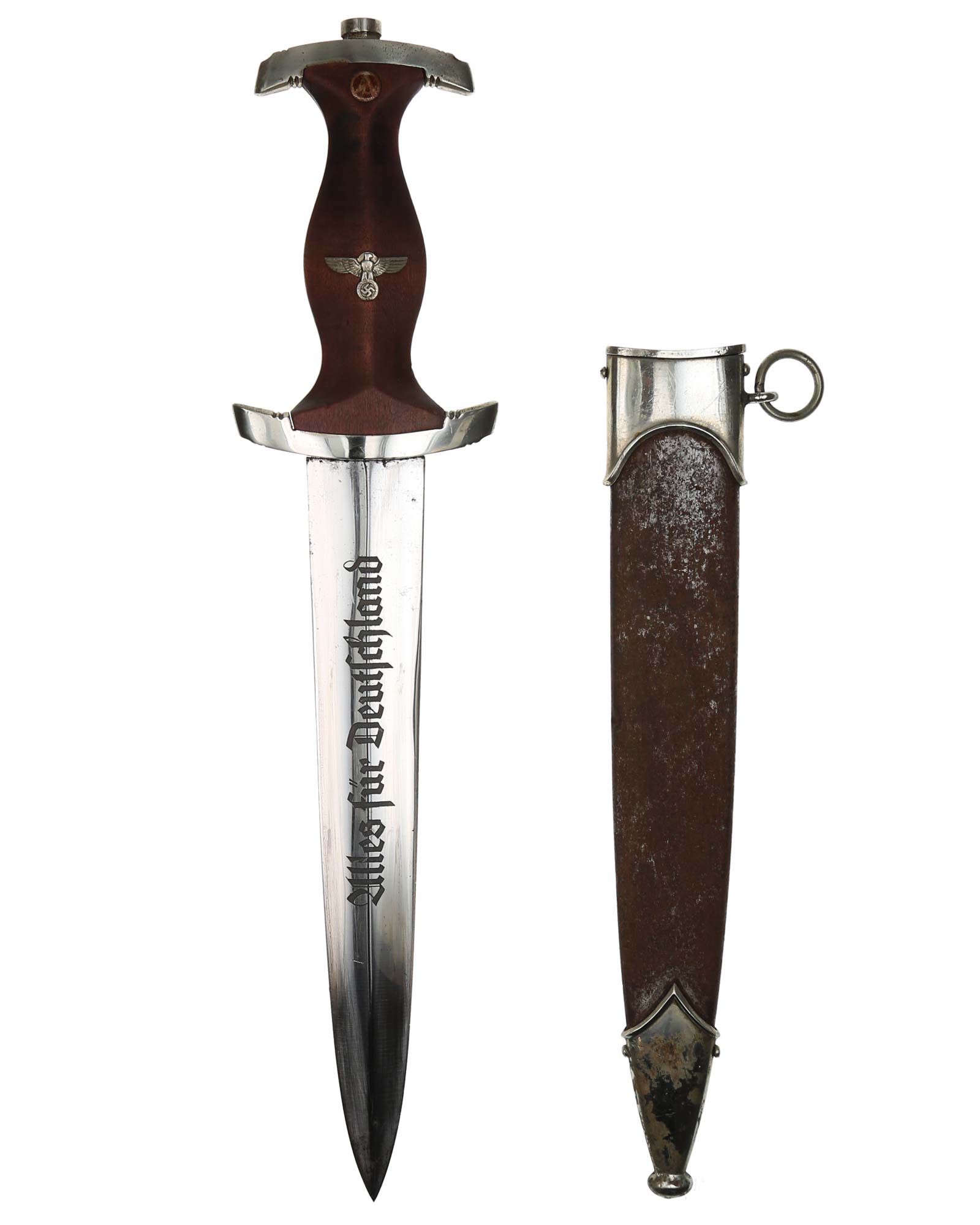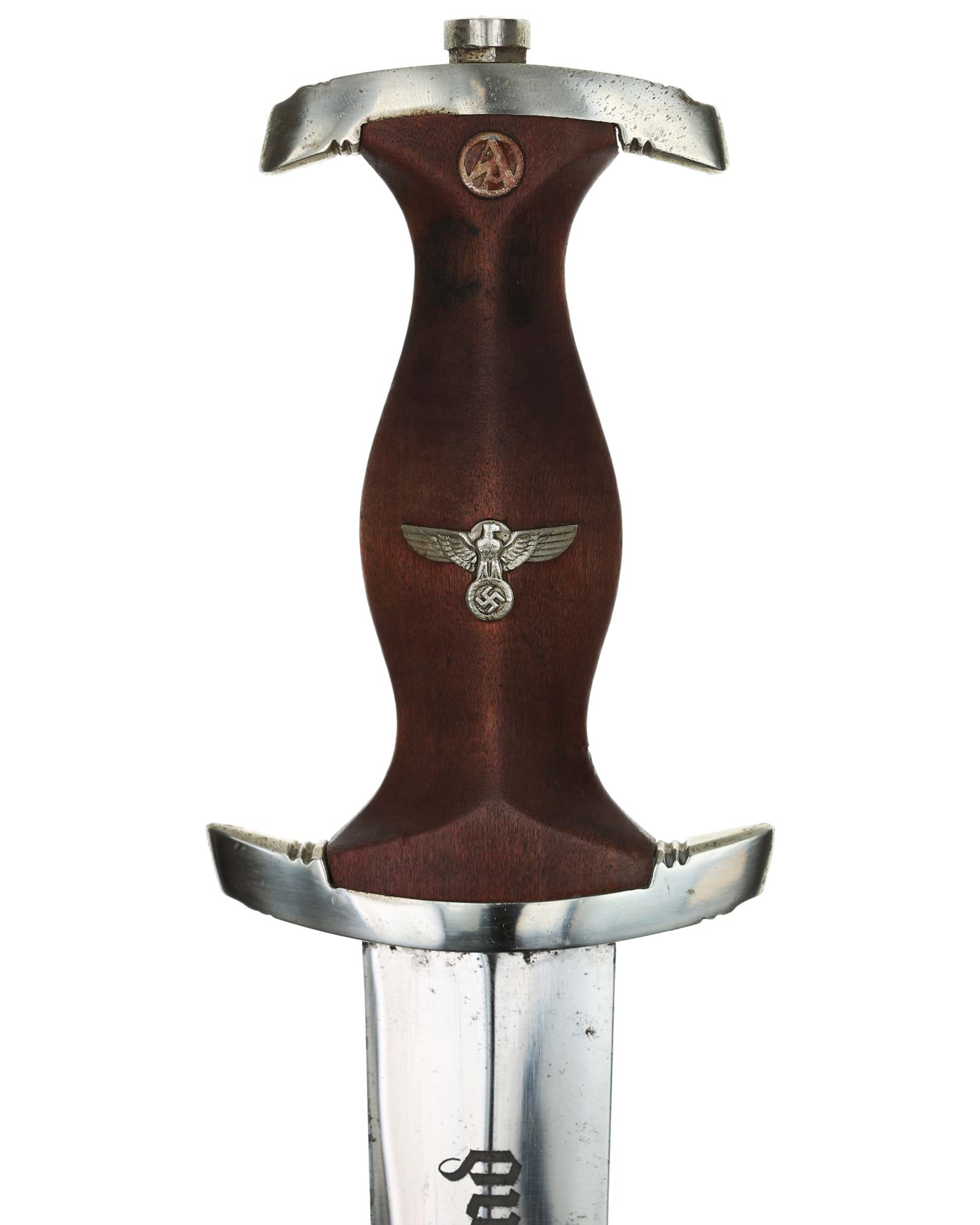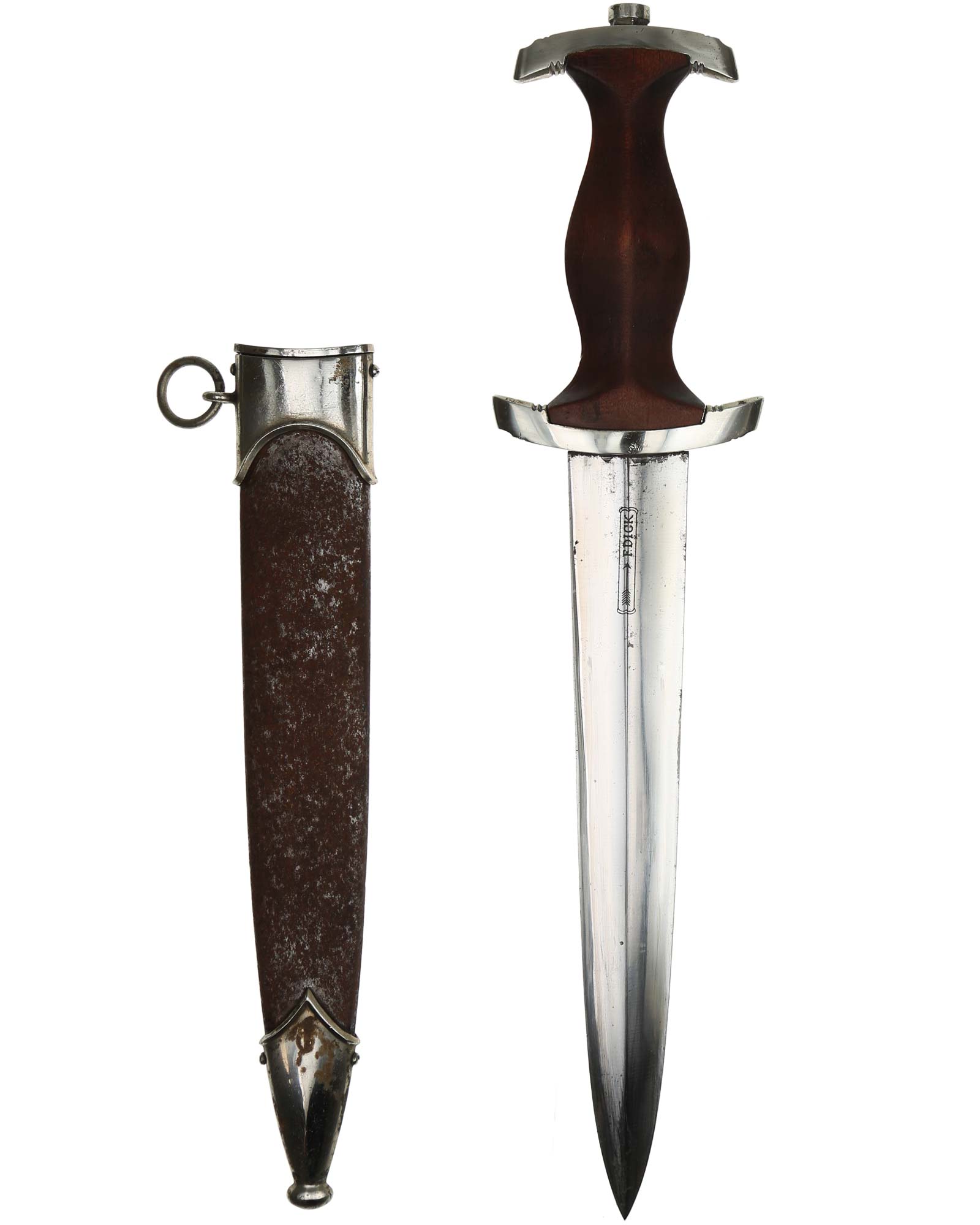 Клинок: Клинок кинжала прямой, стальной, двулезвийный, кинжального типа, с выраженным центральным ребром. На одной стороне клинка методом травления нанесен девиз СА «Всё для Германии» (Alles für Deutchland). Клинок на оборотной стороне у основания стоит клеймо производителя Friedrich Dick Esslingen (Дик Фридрих Есслинген).