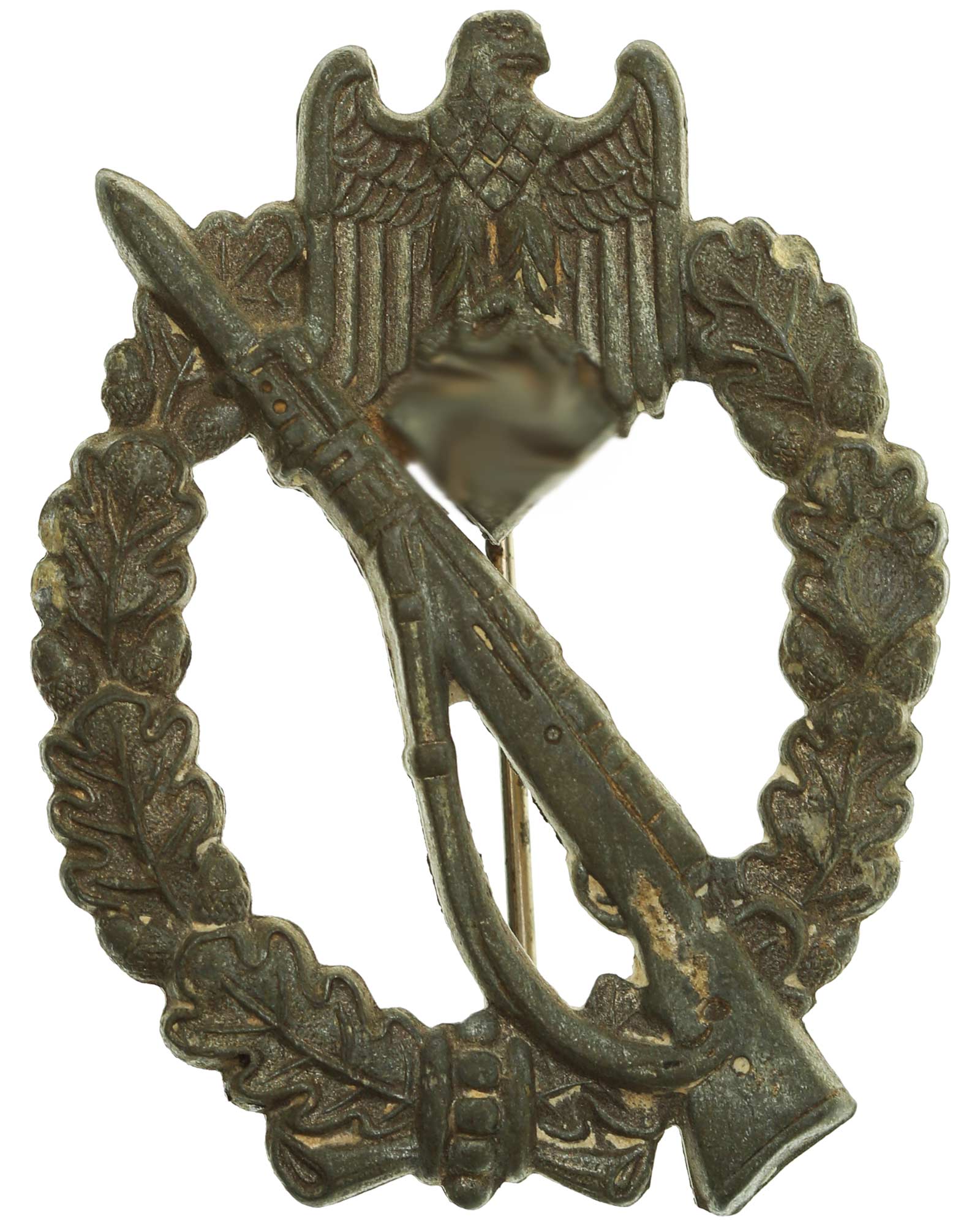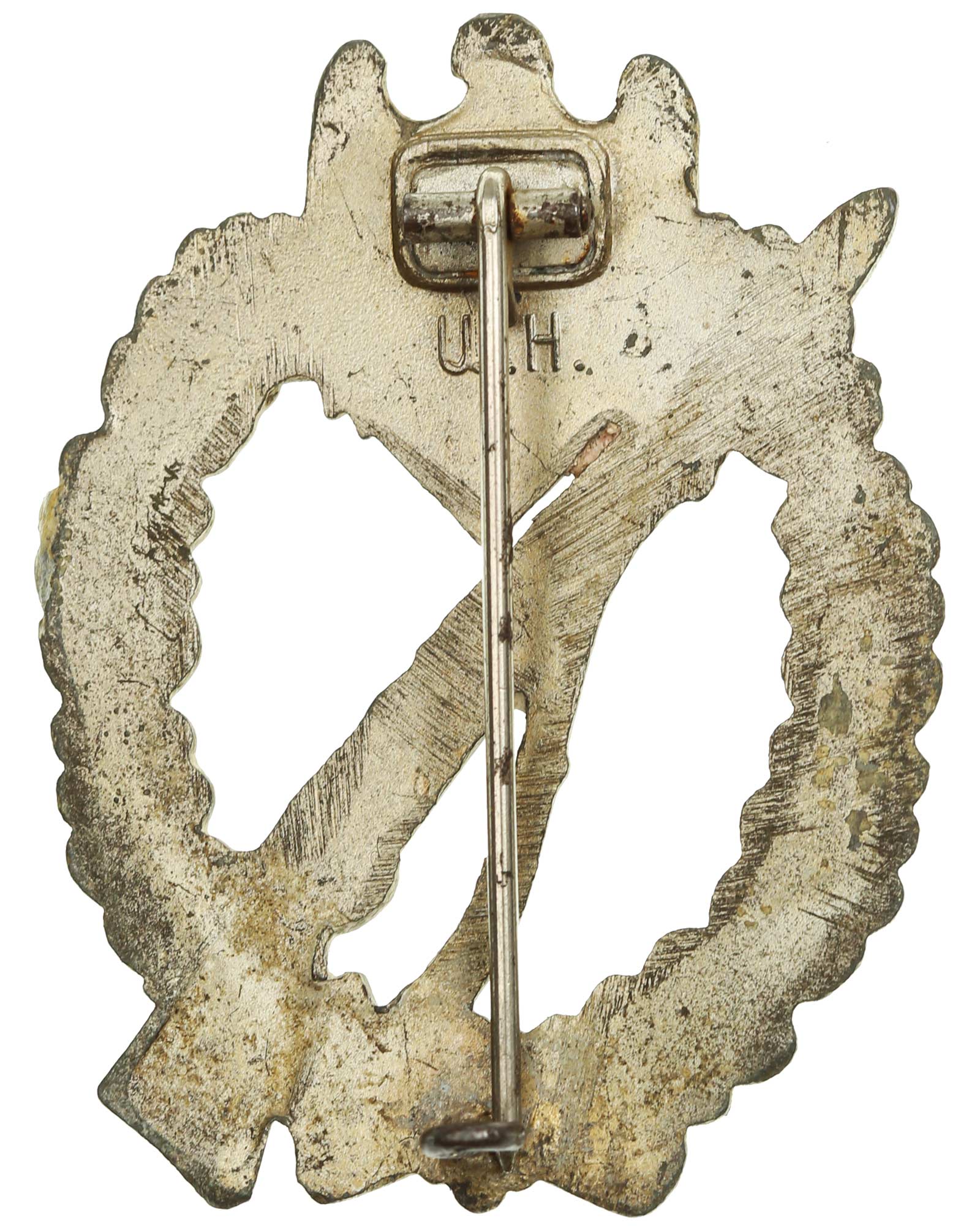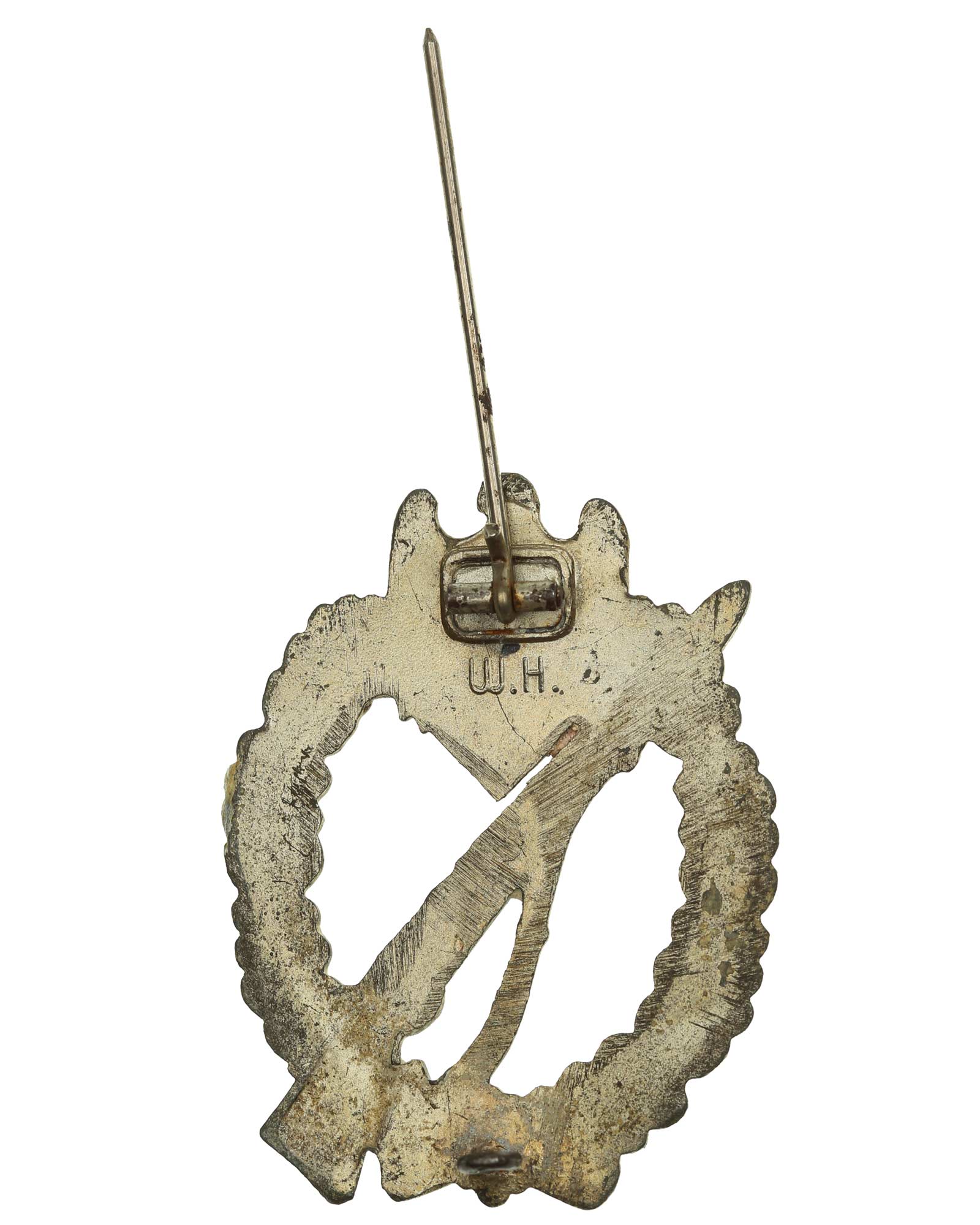 Пехотный штурмовой знак в "серебре". Клеймо производителя "W.H." - Wilhelm Hobacher. Квалификационный пехотный штурмовой знак в хорошем состоянии. Общий вес 34 г. Размер: 61,23 x 46,81 мм.