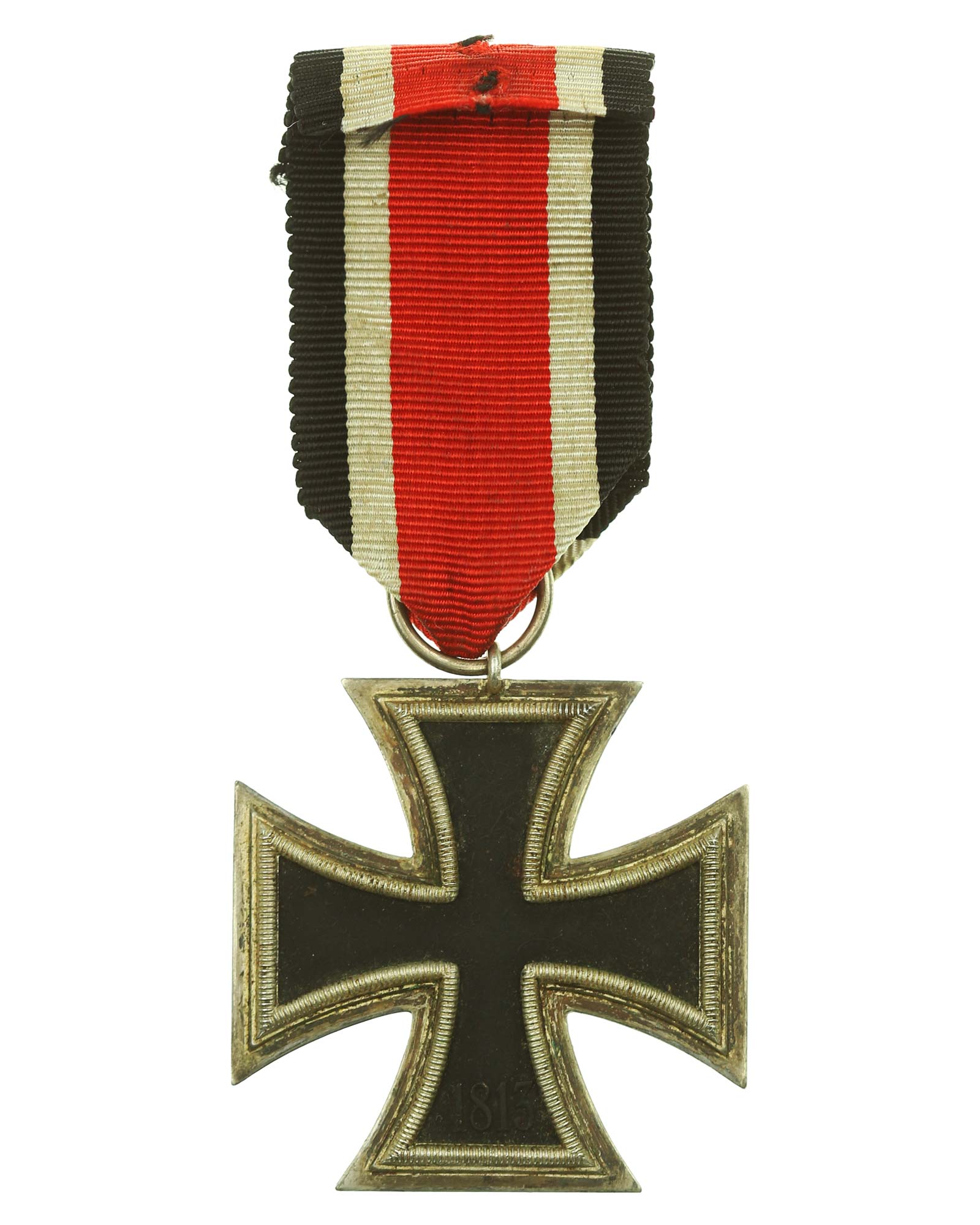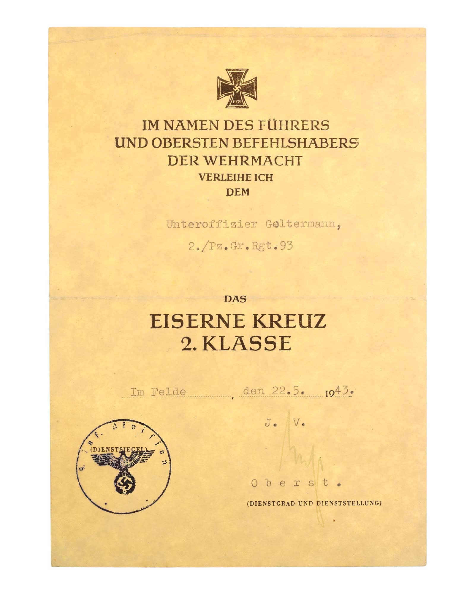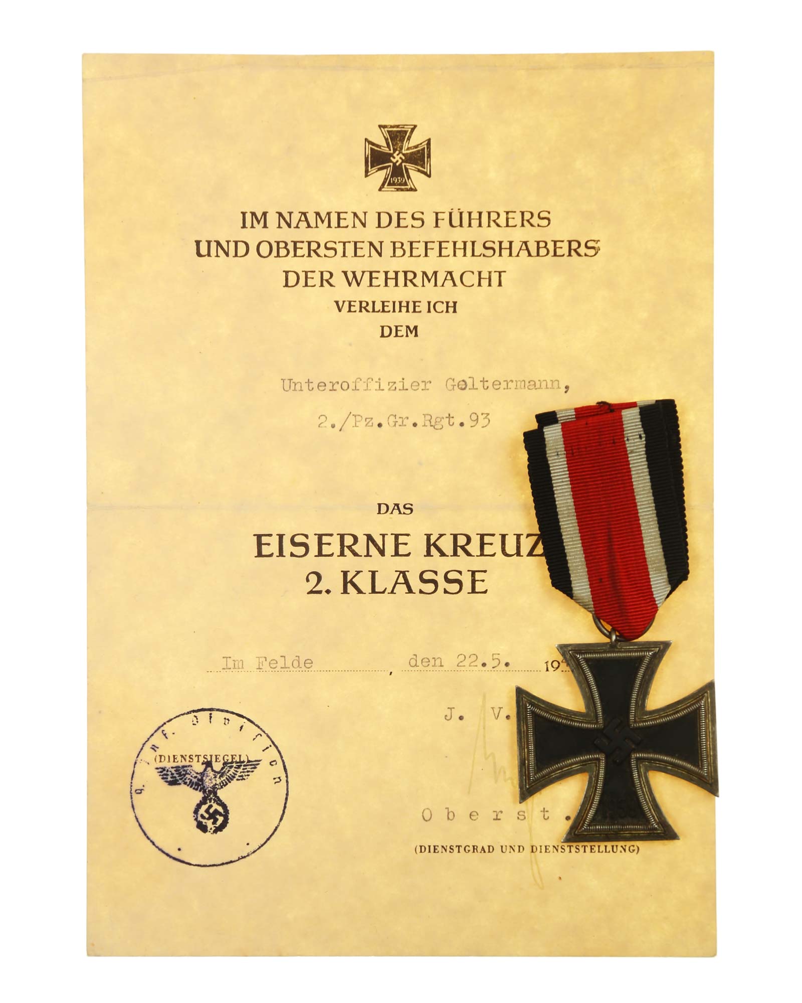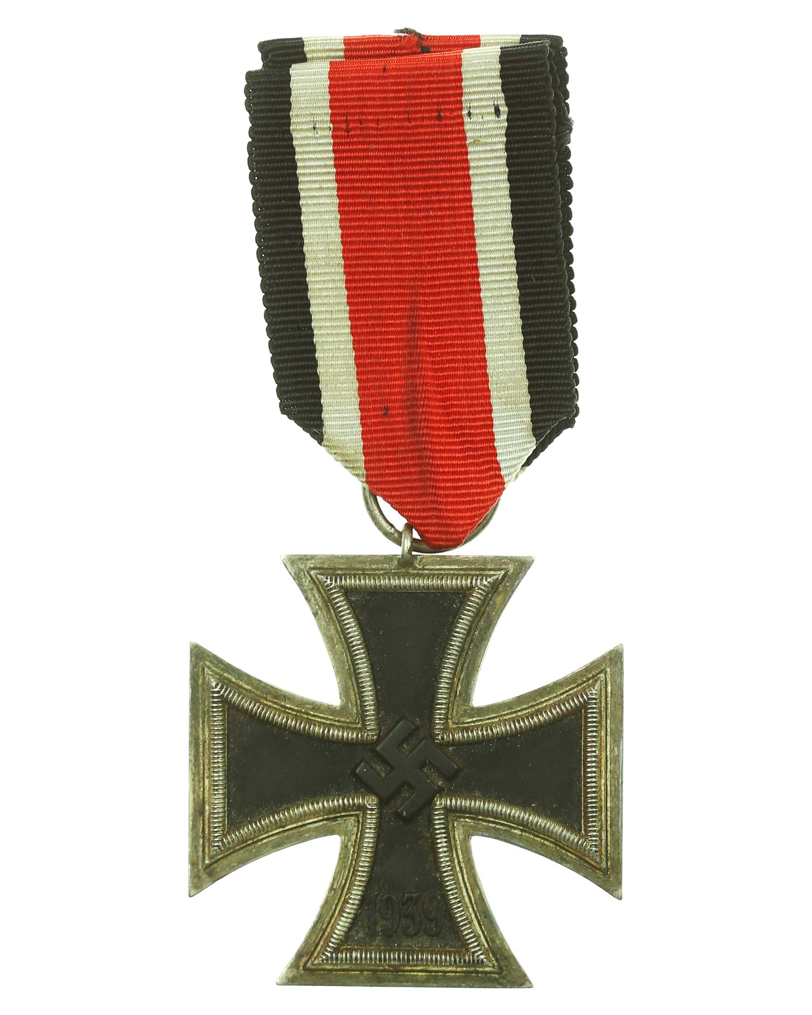 Железный крест 2-го класса 1939 г. Свастика «на подставке» плотно поджата, на ленте (черный | белый | красный | белый | черный). Без клейма производителя. Общий вес 21 г. Размеры: 44,16 х 44,01 мм. Вместе со свидетельством о праве собственности от NCO Adolf Goltermann.