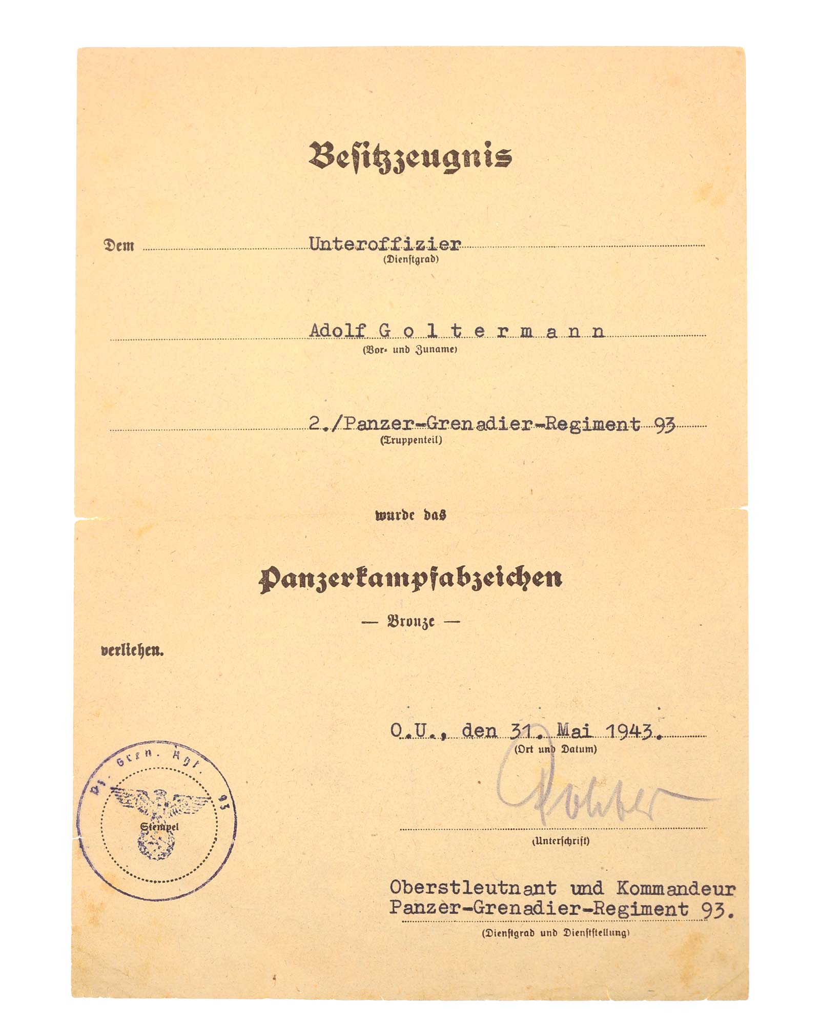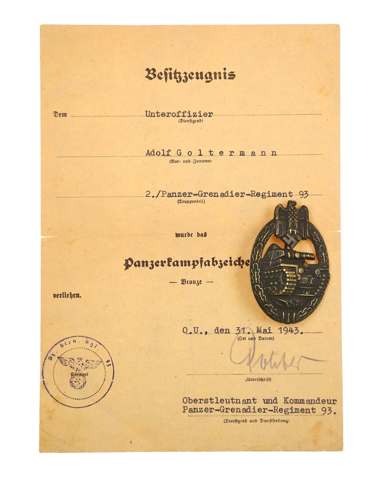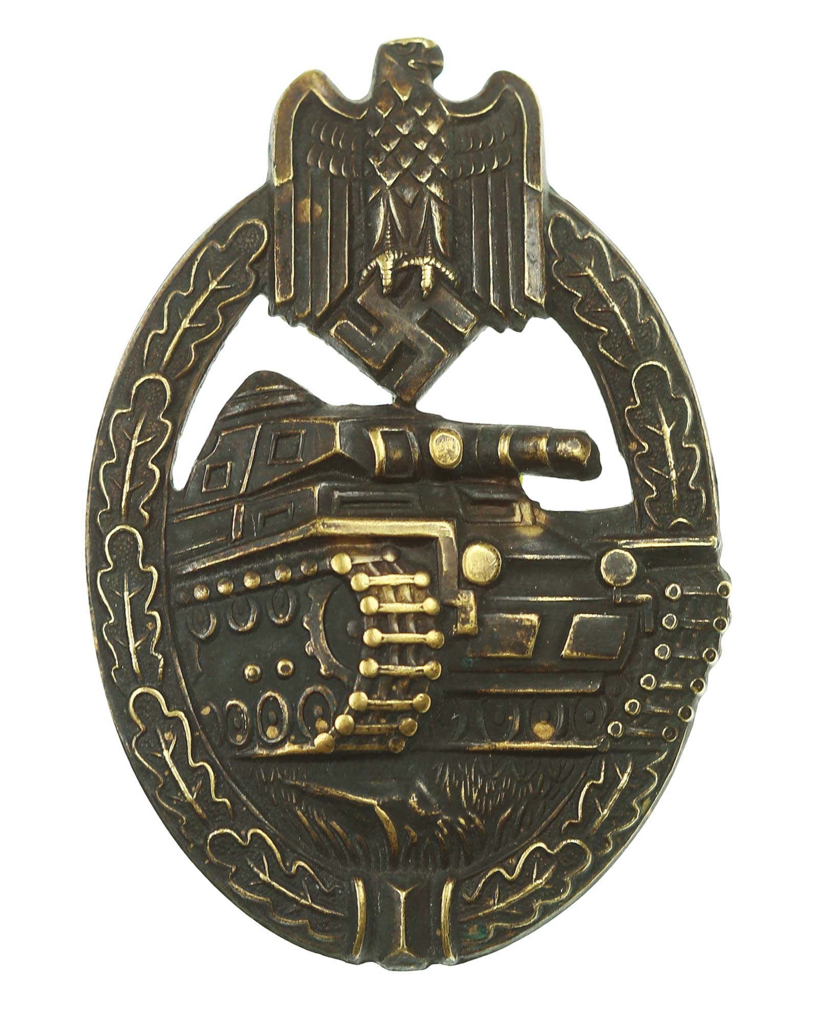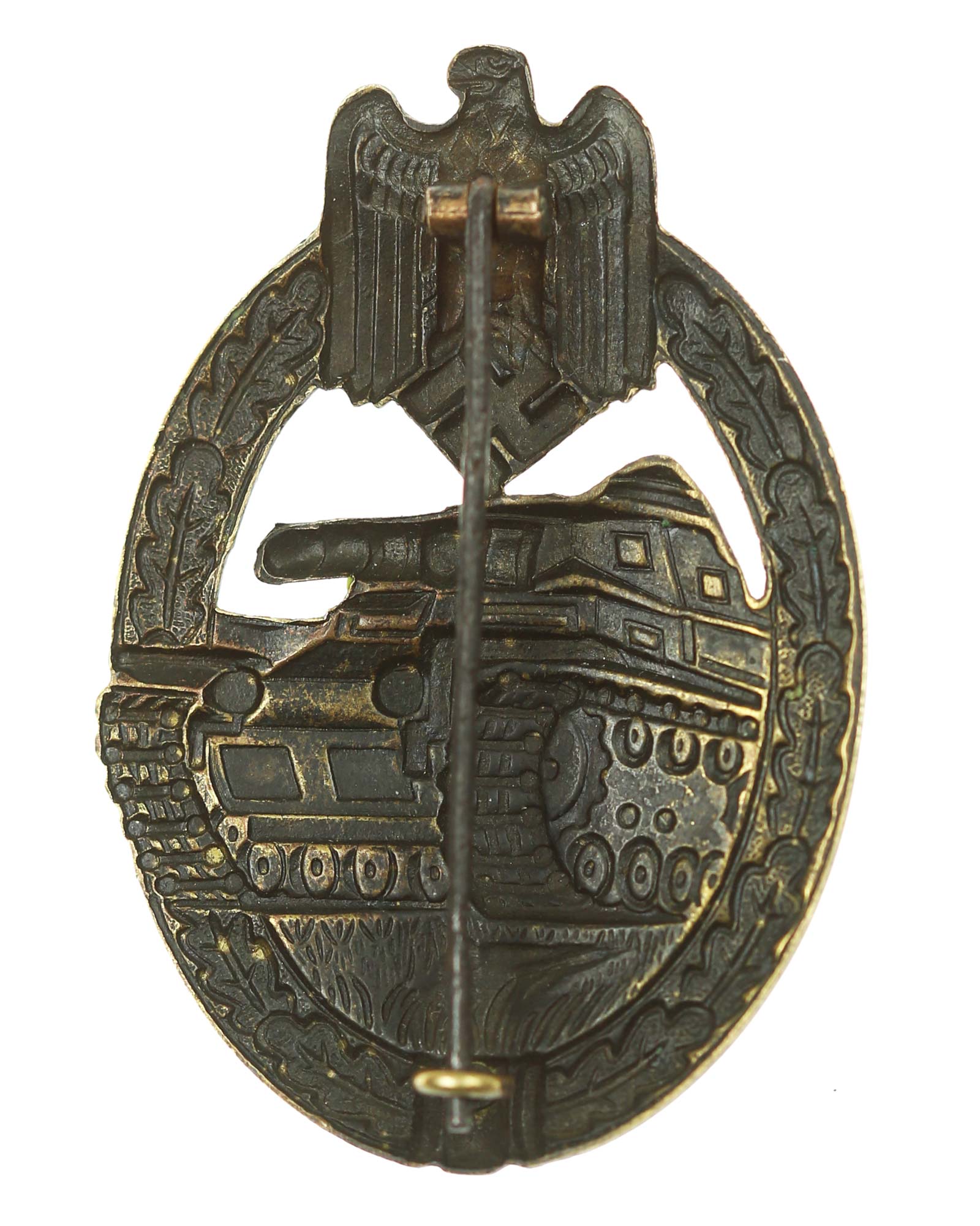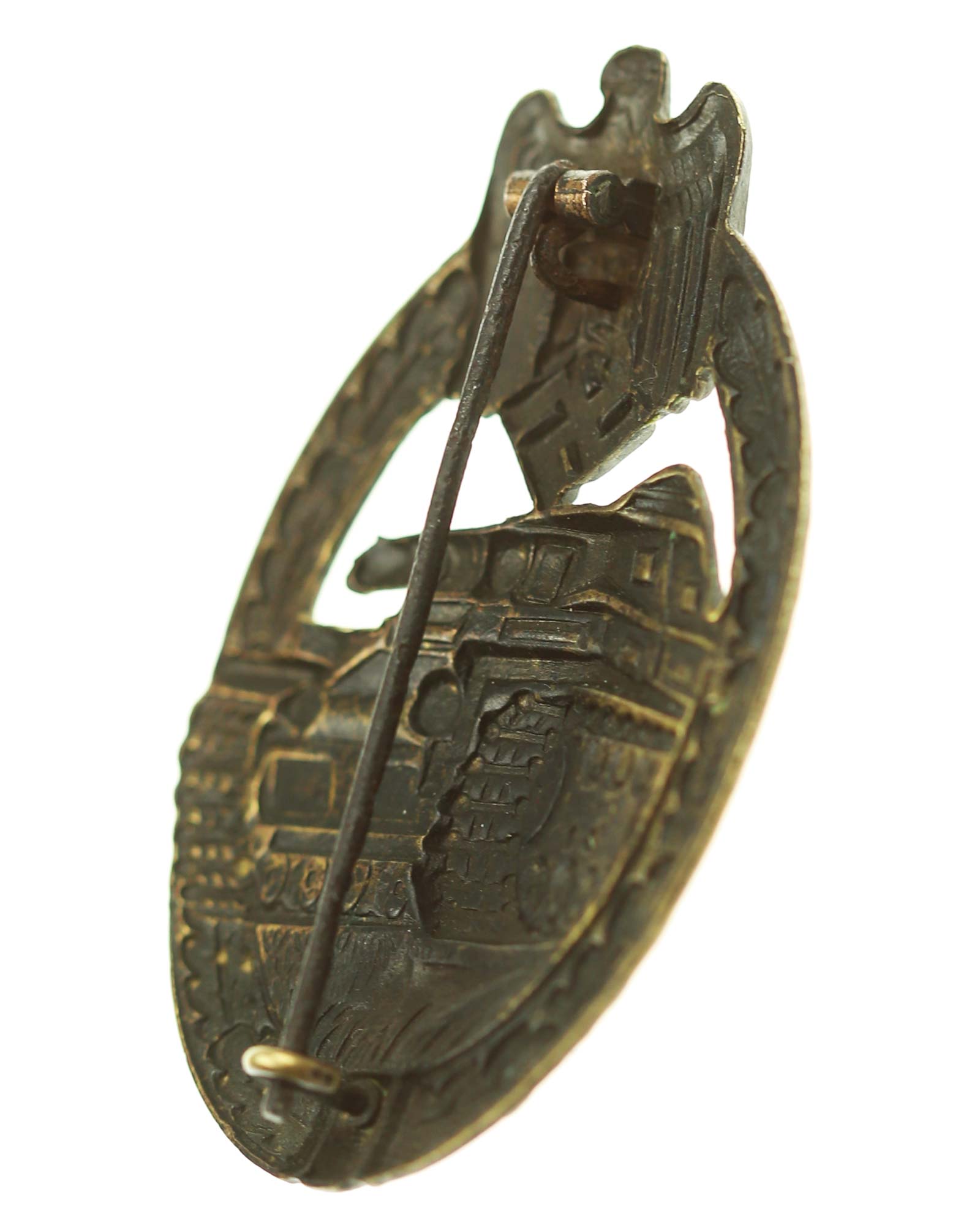 Знак «За танковые атаки» в бронзе. Бронзовый цветной металл, на игле. Без клейма производителя. Общий вес 16 г. Размеры: 61,35 x 42,31 мм Вместе с свидетельством о собственности от NCO Adolf Goltermann.