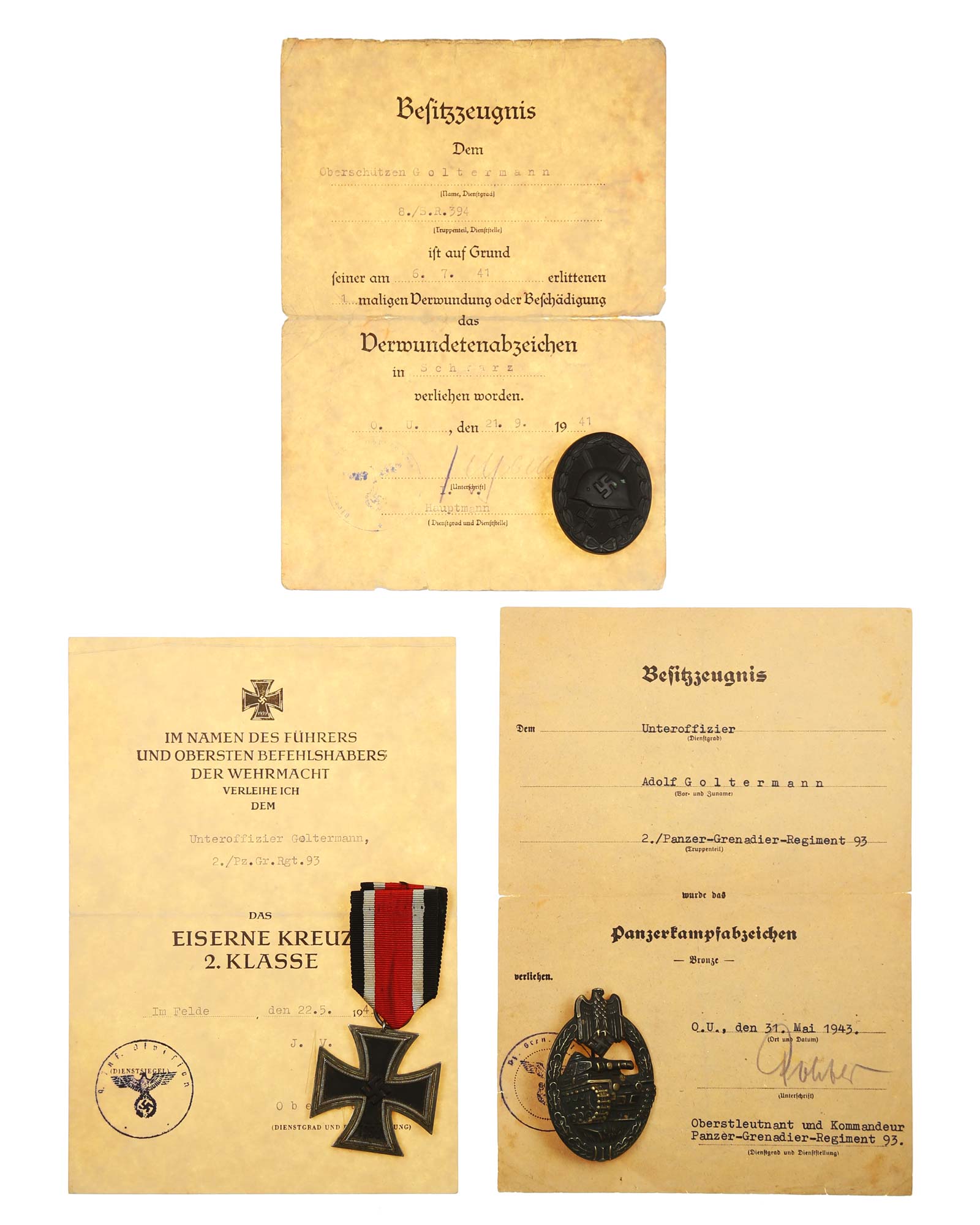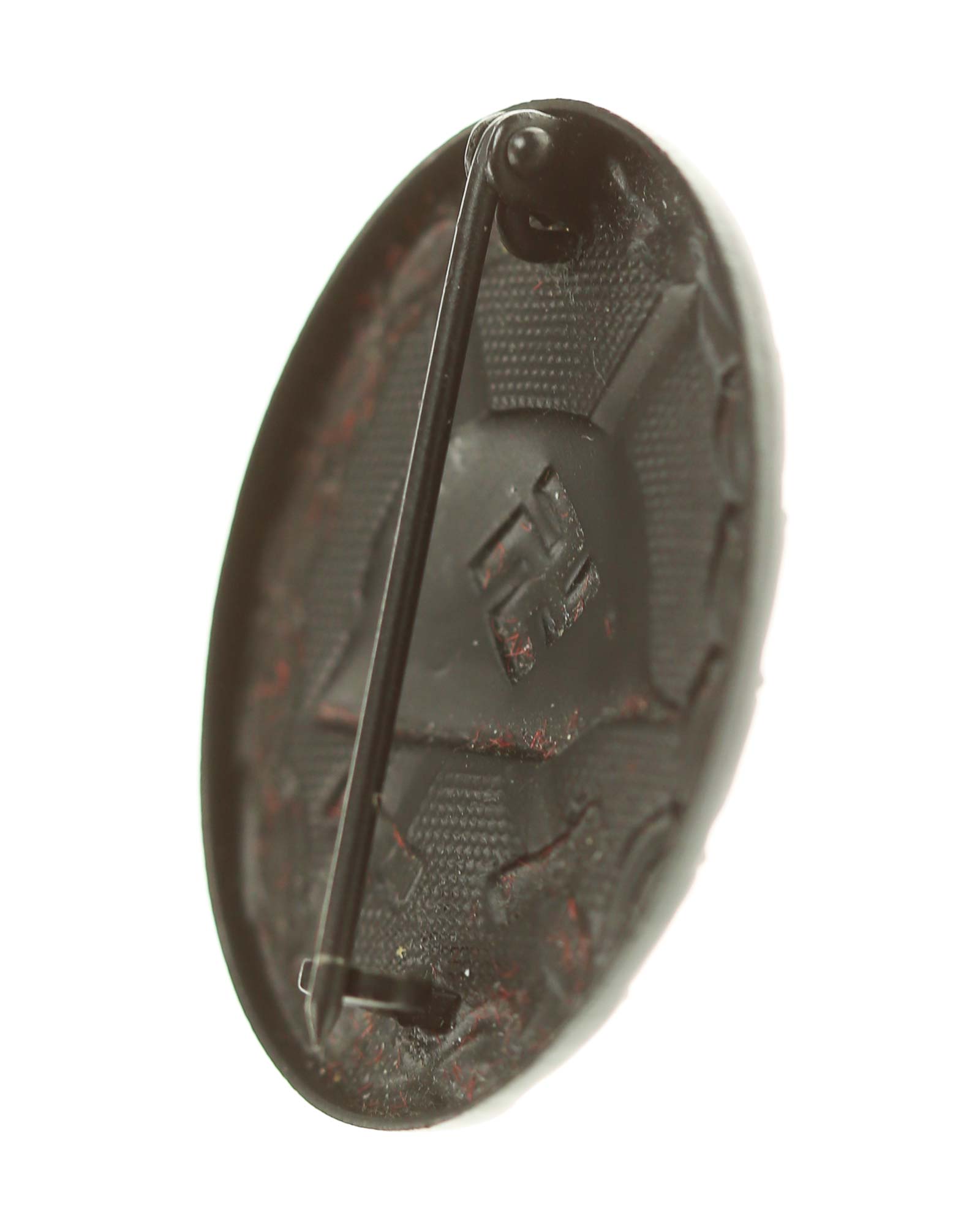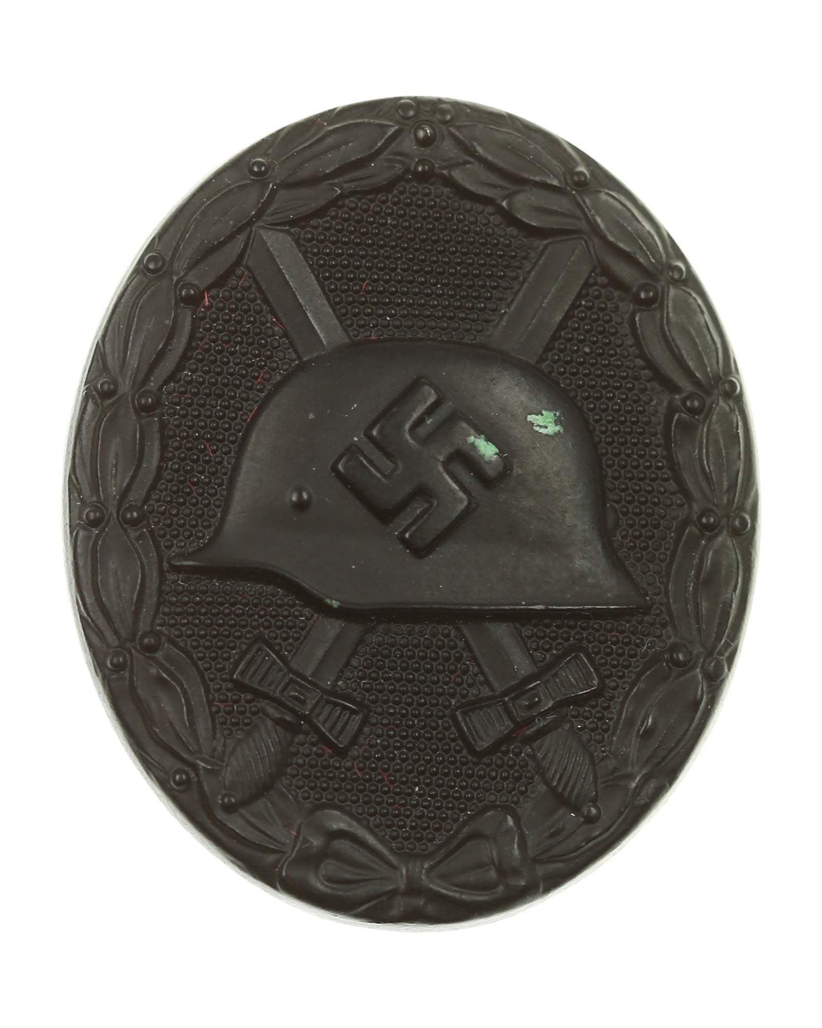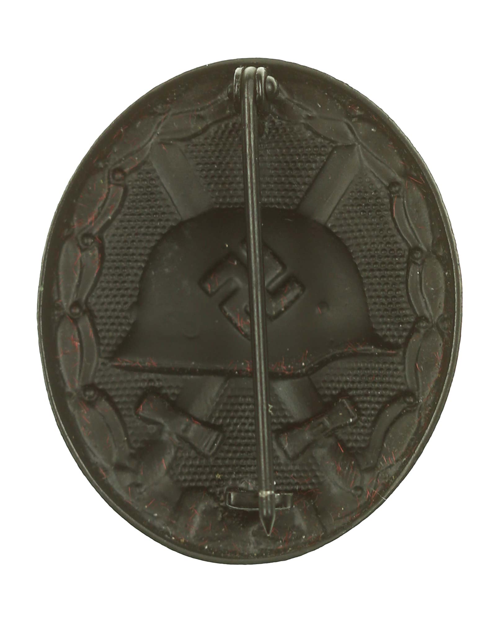 Нагрудный знак «За ранение» - Черный. Штамповано из листового железа (магнитное) и окрашено в черный цвет, клейма производителя: Hersteller 65, Klein & Quenzer A.G., Idar Oberstein. Общий вес 10 г. Размеры: 44,25 х 37,01 мм Вместе с свидетельством о праве собственности от NCO Adolf Goltermann.