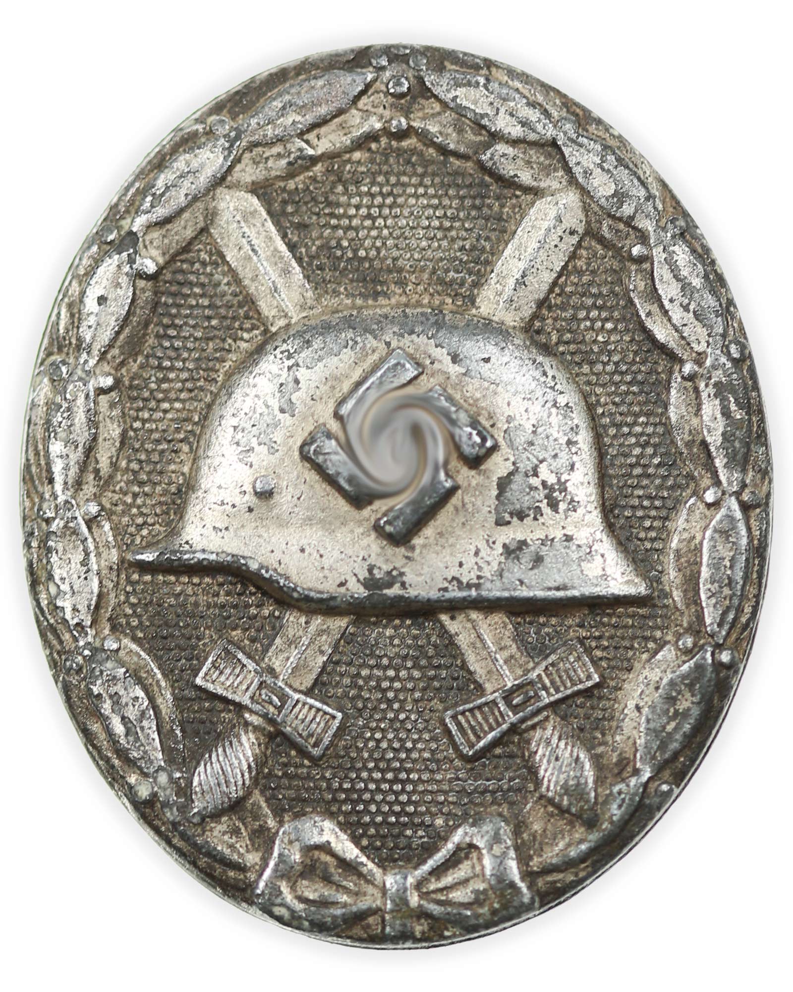 Знак «За ранение» в серебре, L/13 (Paul Meybauer Berlin). Учрежден 1 сентября 1939 г. Общий вес 25 г. Размер: 36,21 x 43,52 мм.