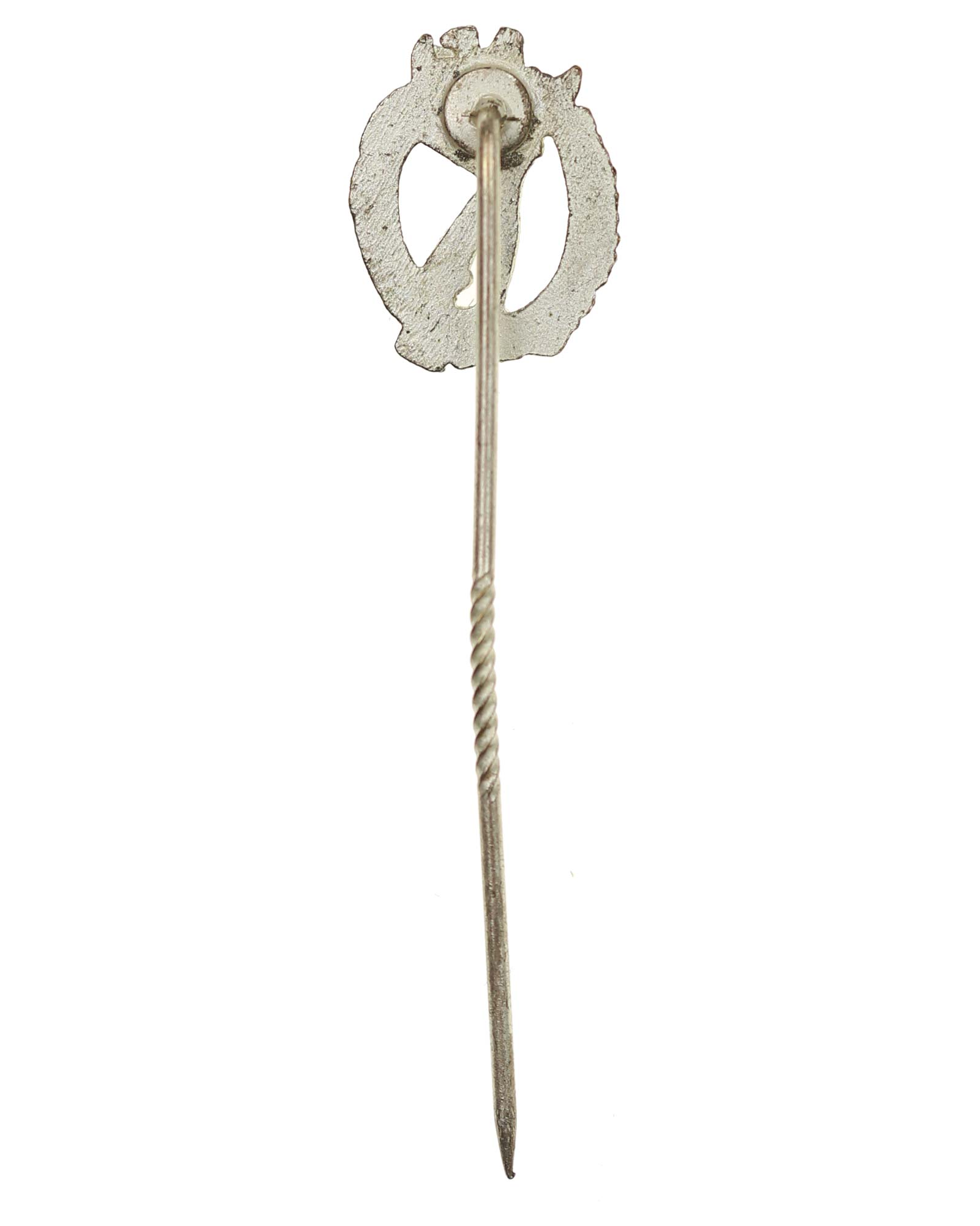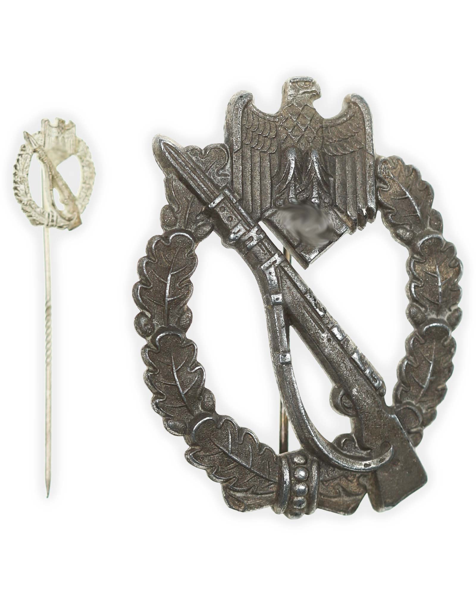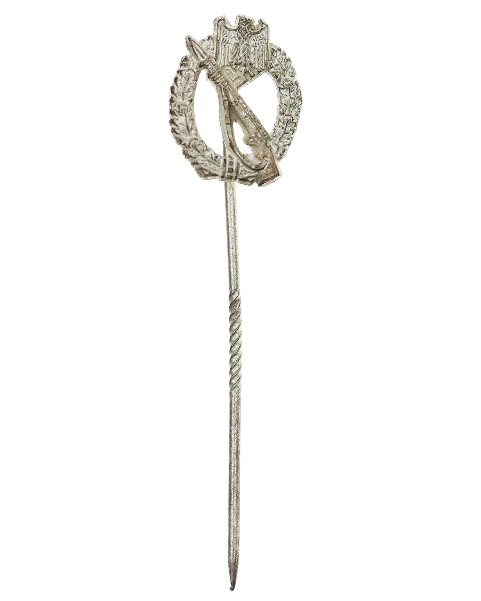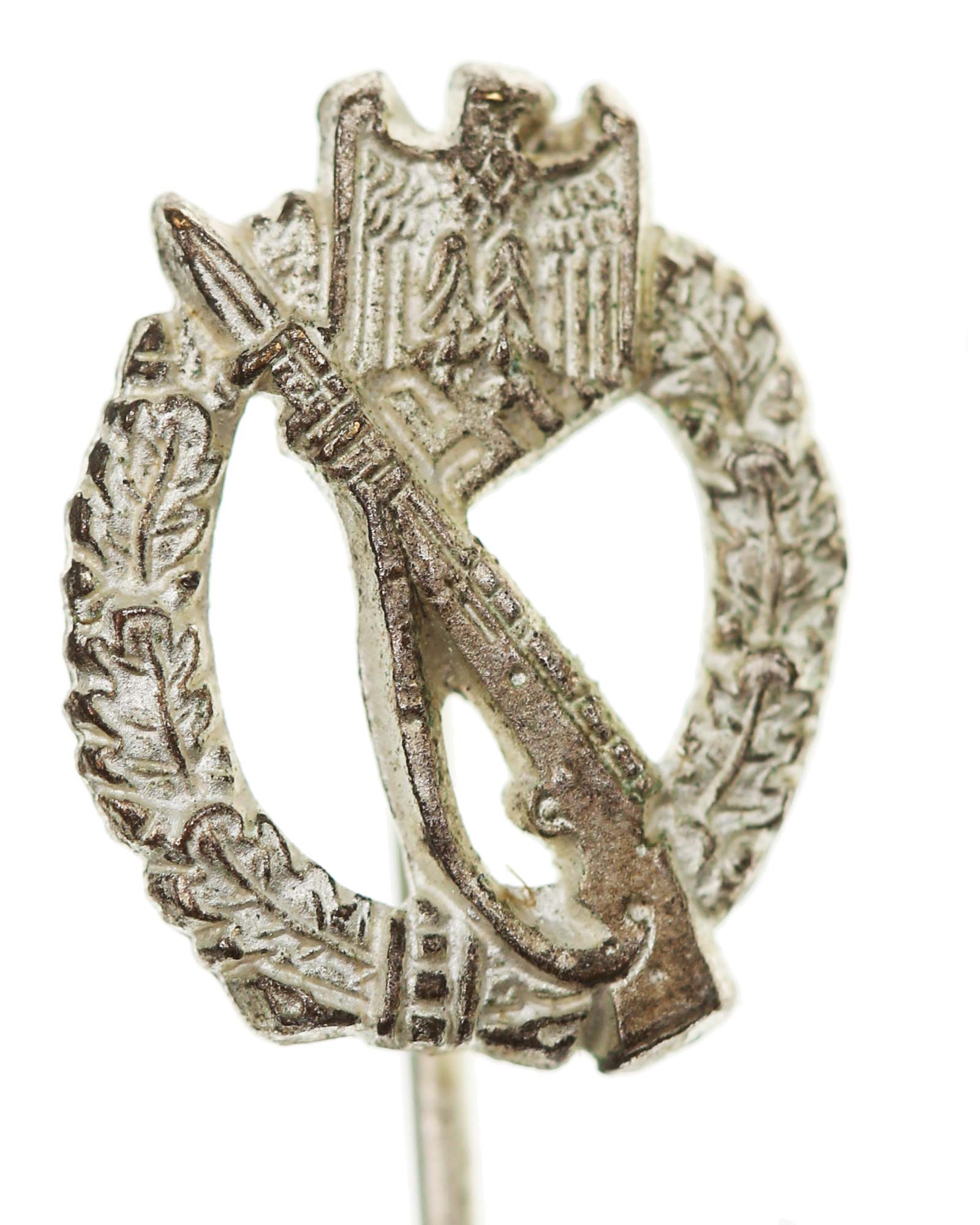 Квалификационный «Пехотный штурмовой знак в серебре» - миниатюра, с иглой. Общий вес 2 г. Размеры: 16,20 х 12,55 мм.