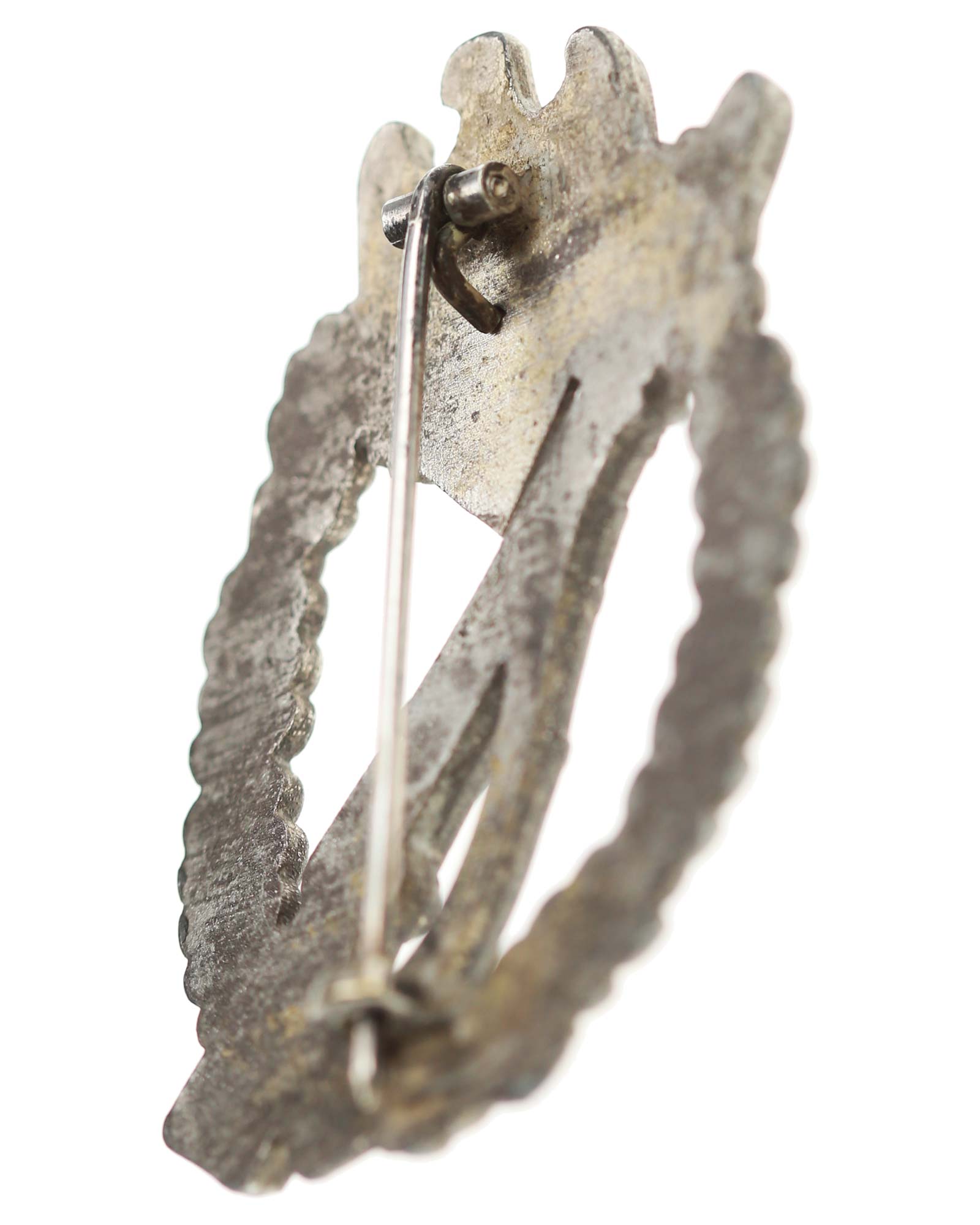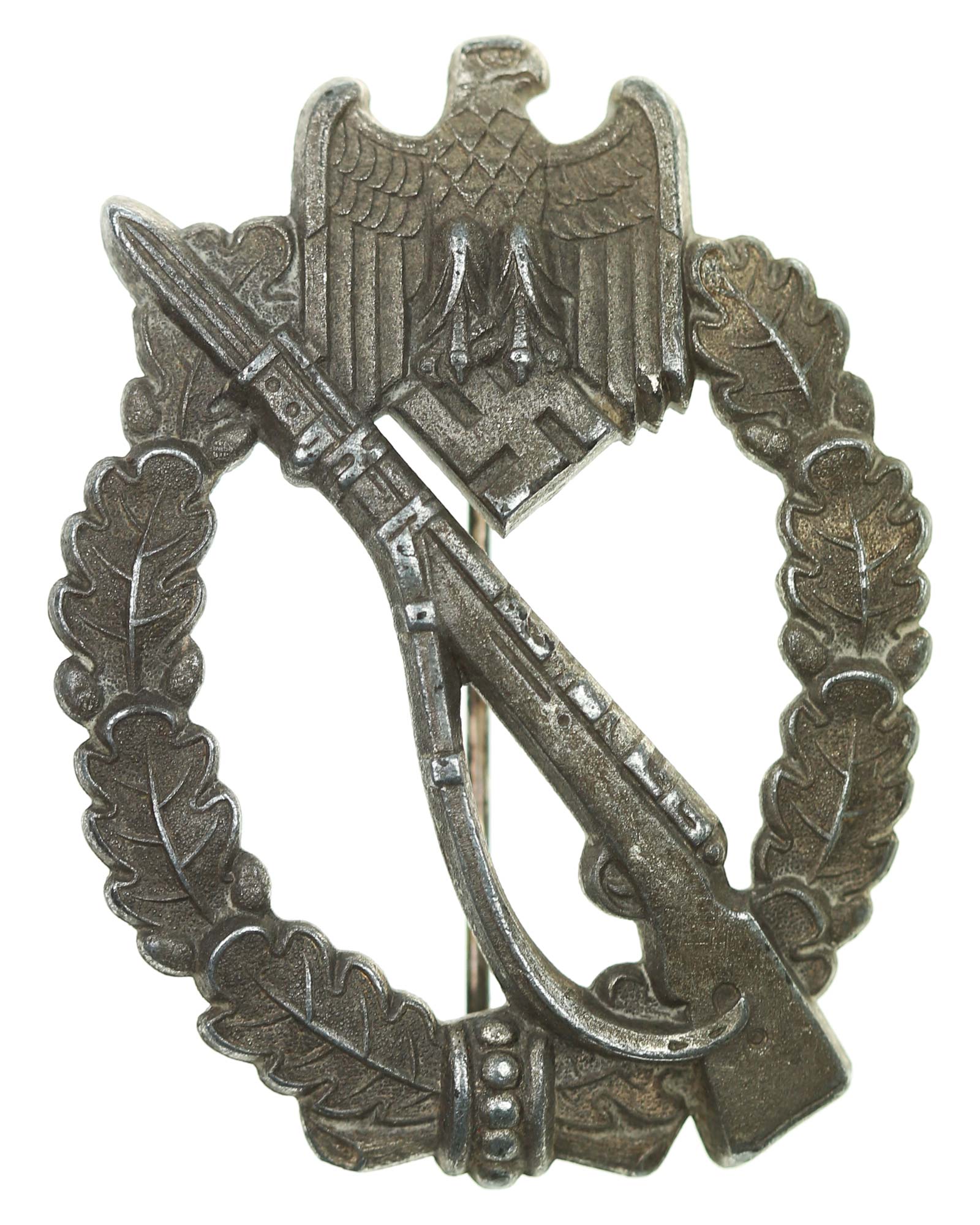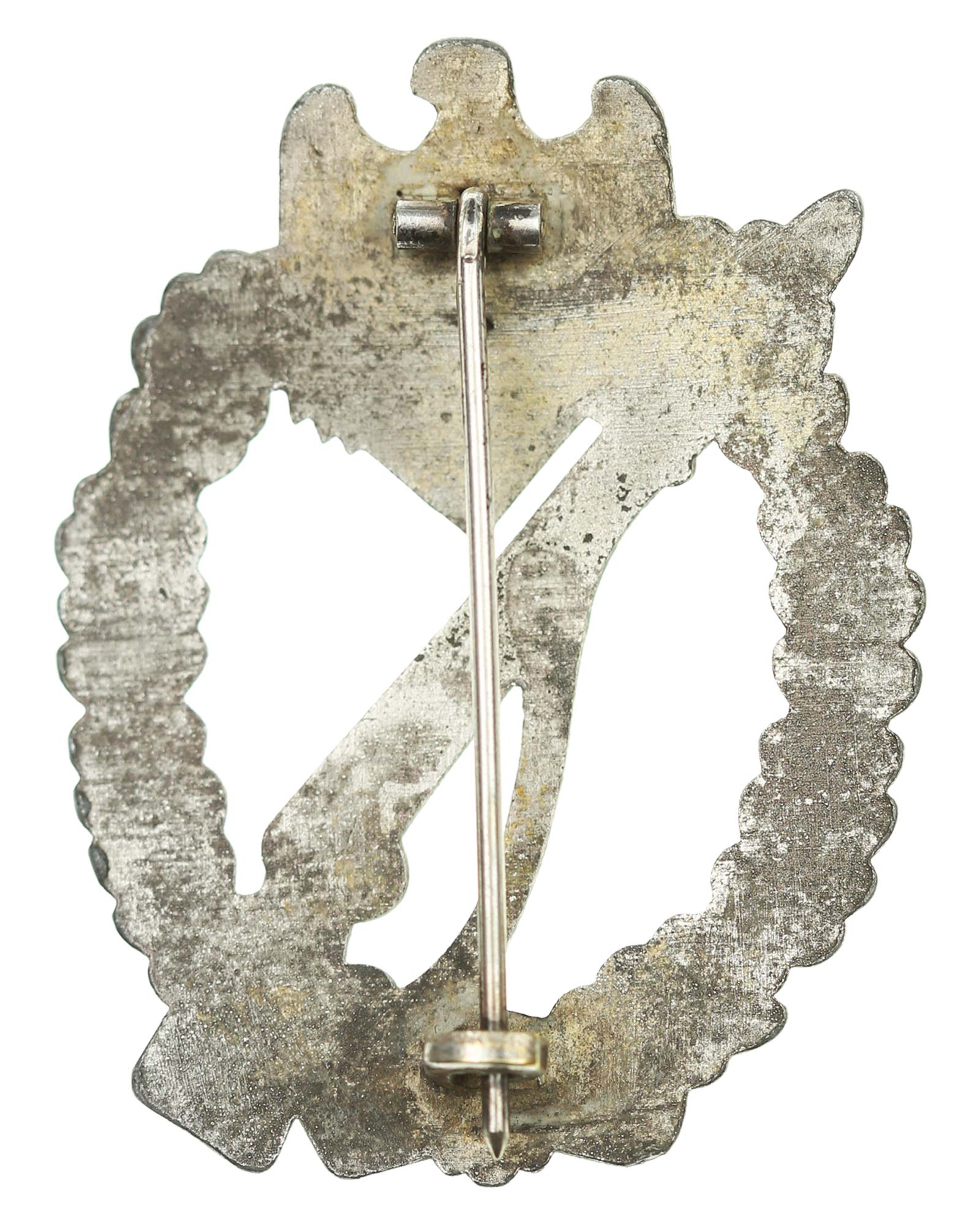 Квалификационный «Пехотный штурмовой знак в серебре» (цинк). Без производителя, с иглой. Общий вес 32 г. Размеры: 62,78 x 47,35 мм.