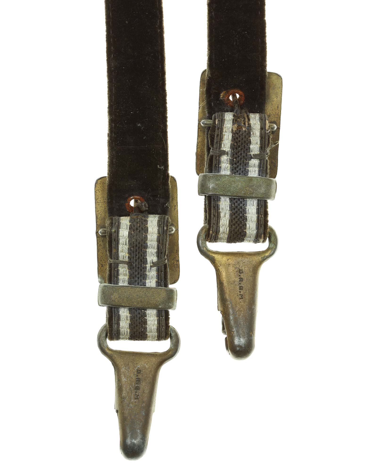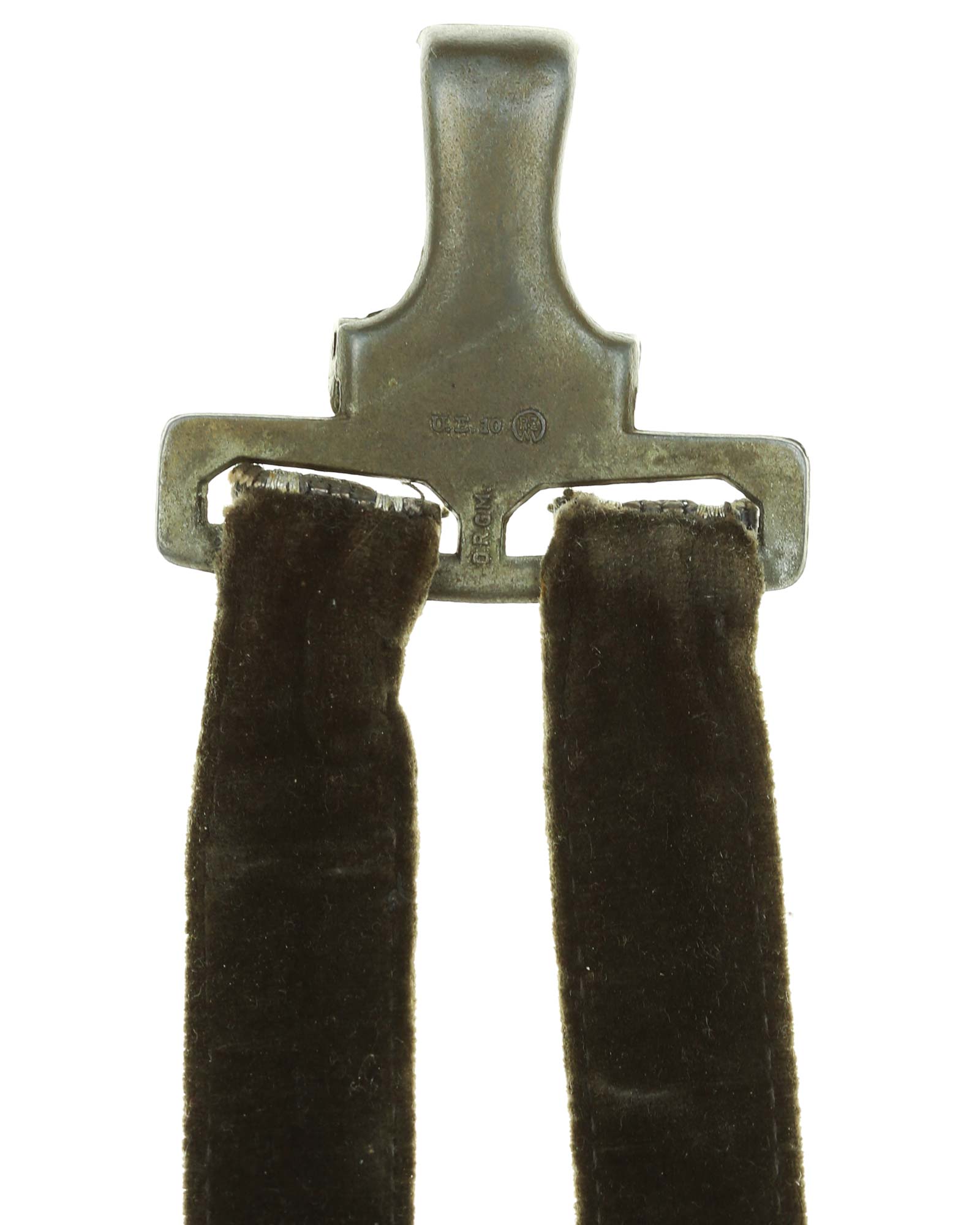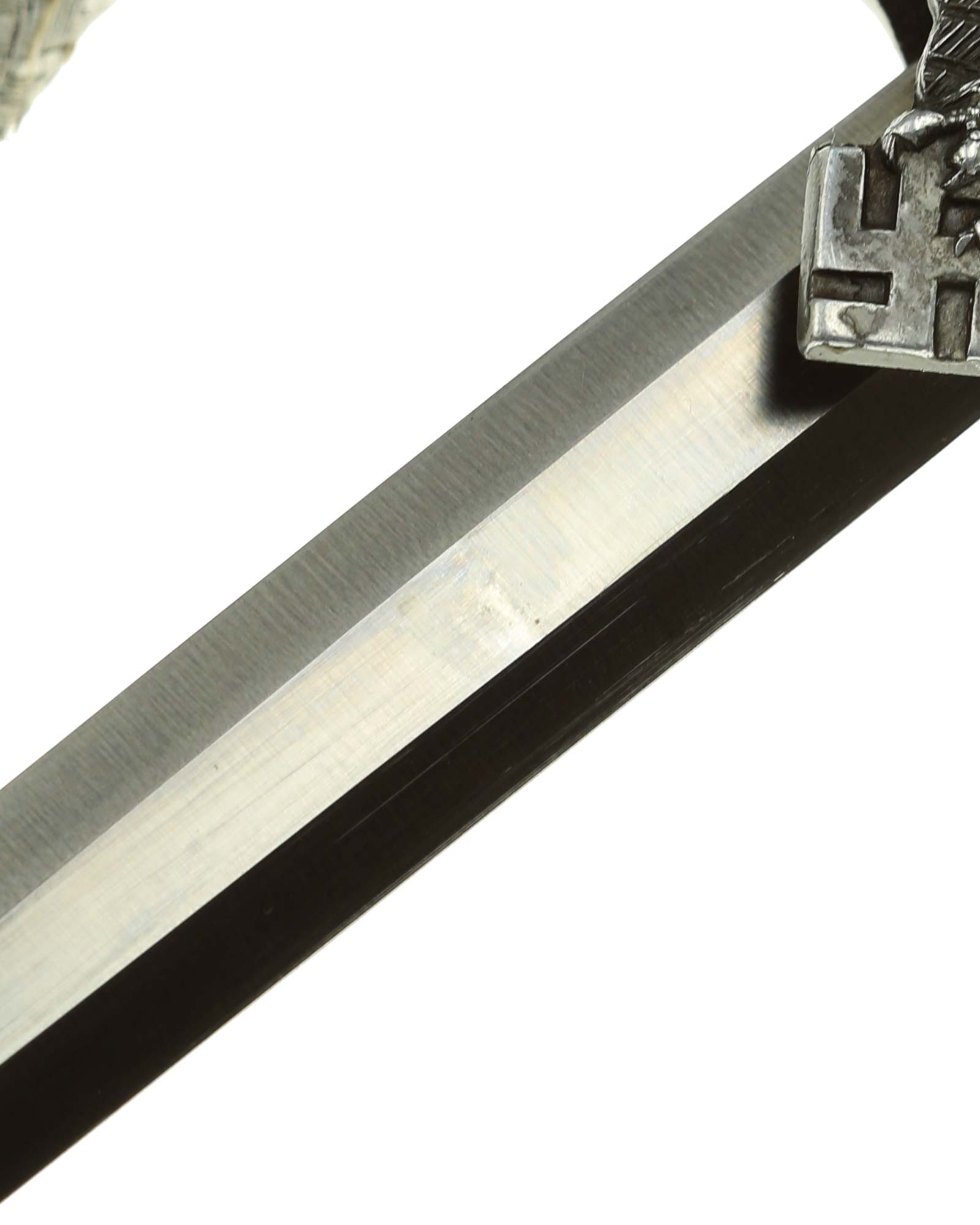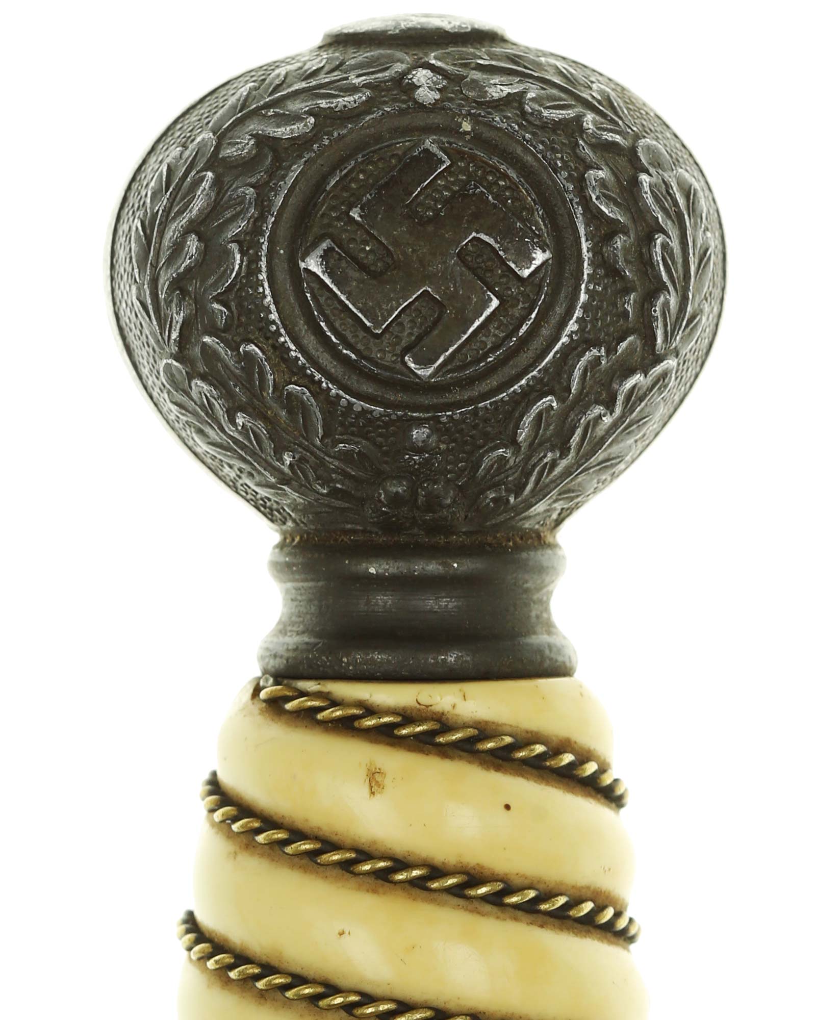 Рукоять: Рукоять бочкообразная, имитирующими слоновую кость, по спиральным желобкам рукоять обмотана витой серебристой проволокой. Внизу имеется цилиндрическая втулка, украшенная орнаментом из дубовых листьев. Головка рукояти шарообразная, отлита вместе с верхней гайкой. Украшена с двух сторон рельефным изображением свастики и орнаментом из дубовых листьев. Головка навинчивается на хвостовик и имеет сверху плоскую круглую пуговку. Крестовина литая, с лицевой стороны в виде летящего орла, несущего в когтях свастику. С обратной стороны крестовина имеет точечный фон.