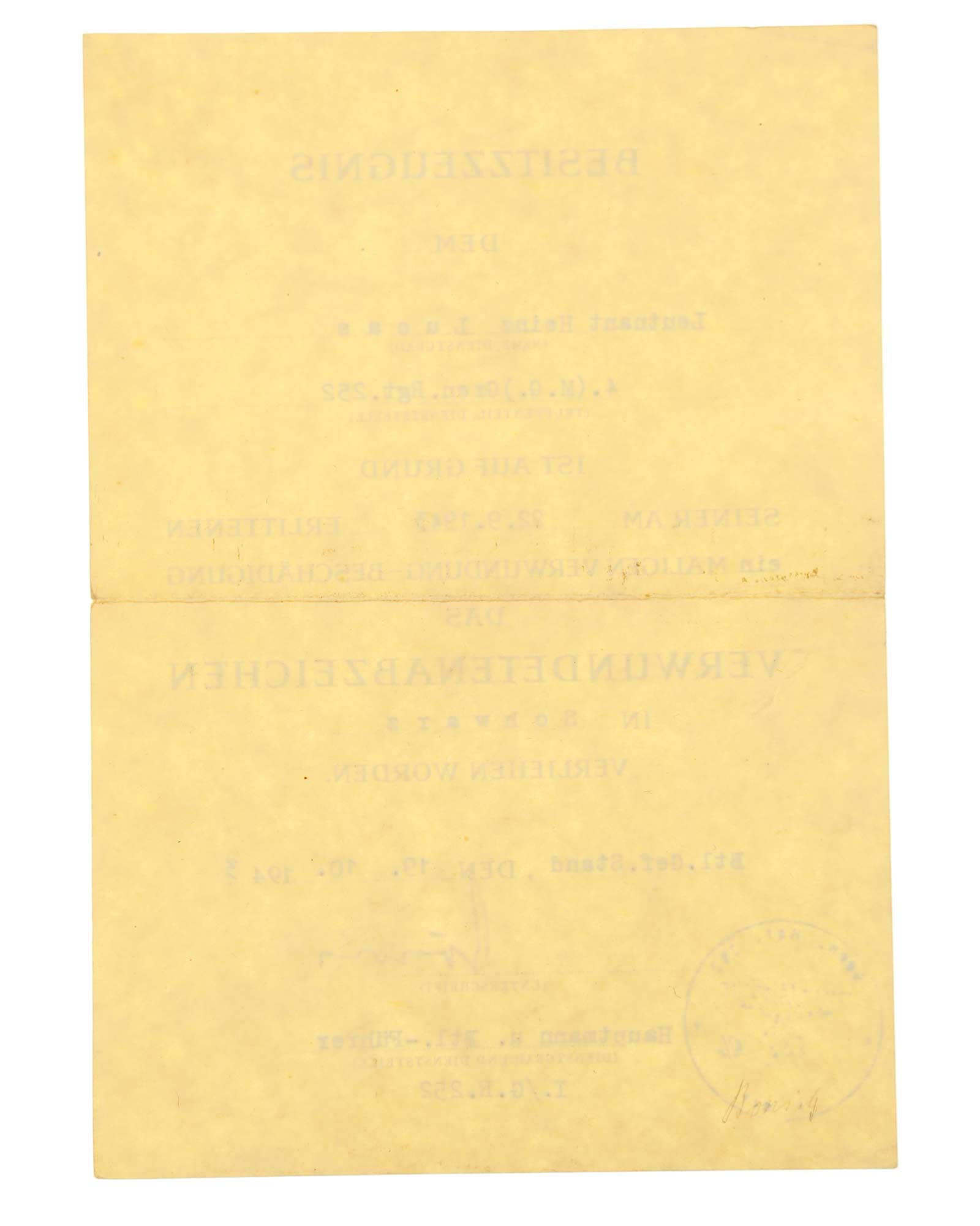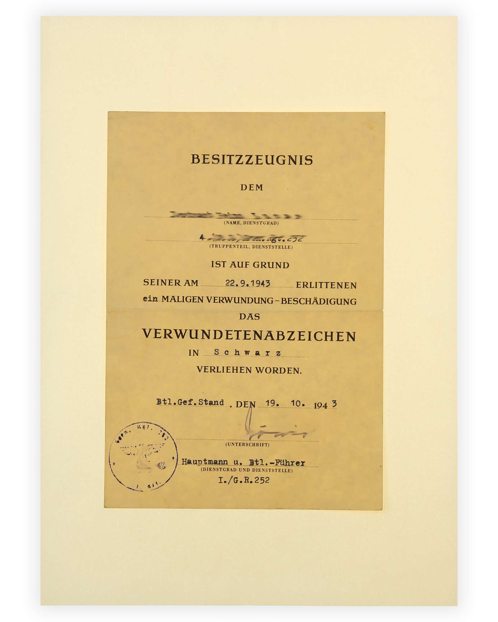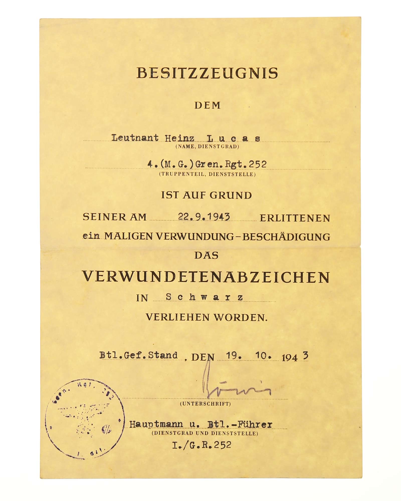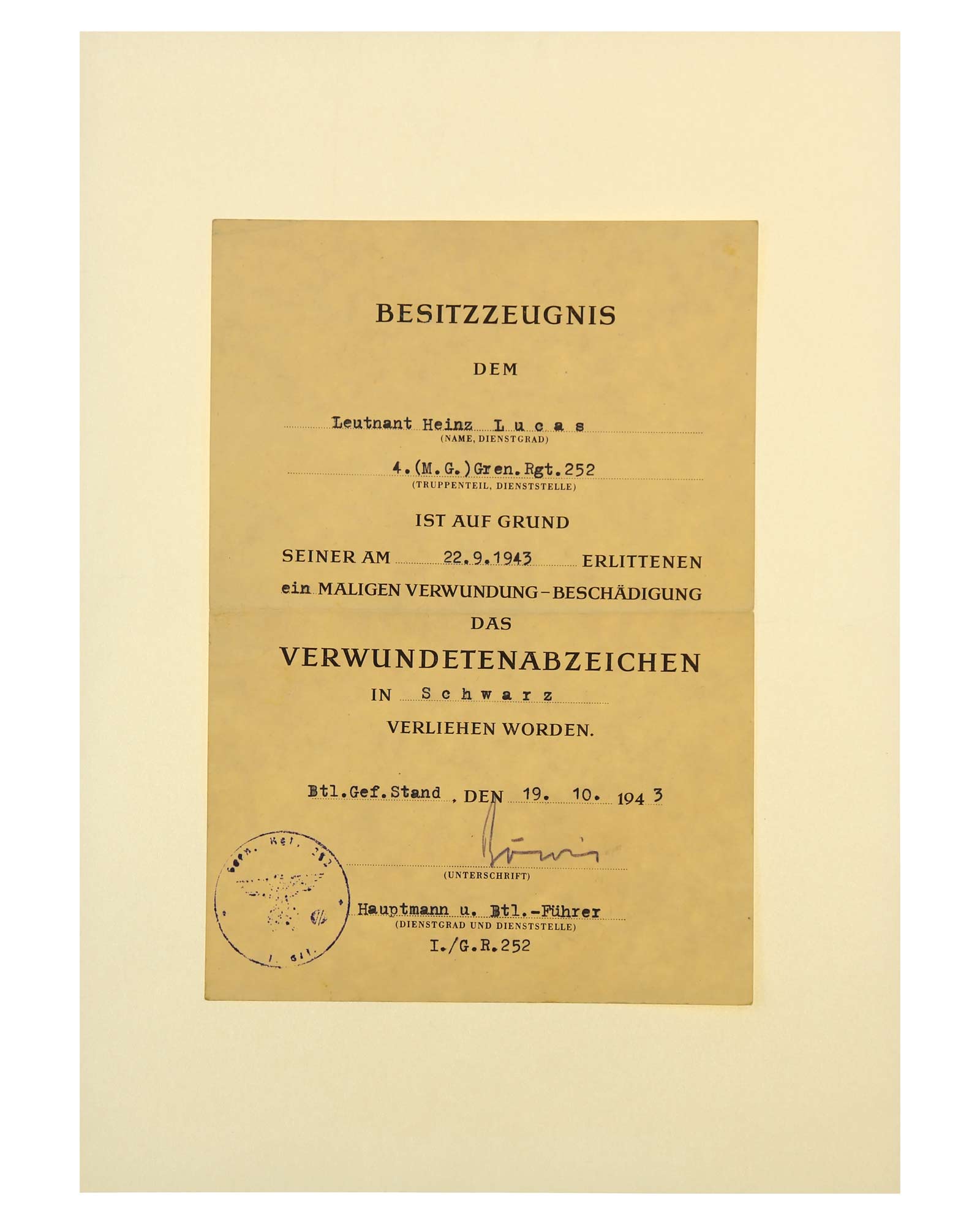 Свидетельство о владении черным знаком «Раненый» лейтенанта Хайнца Лукаса, выданное 19 октября 1943 года капитаном и командиром батальона.