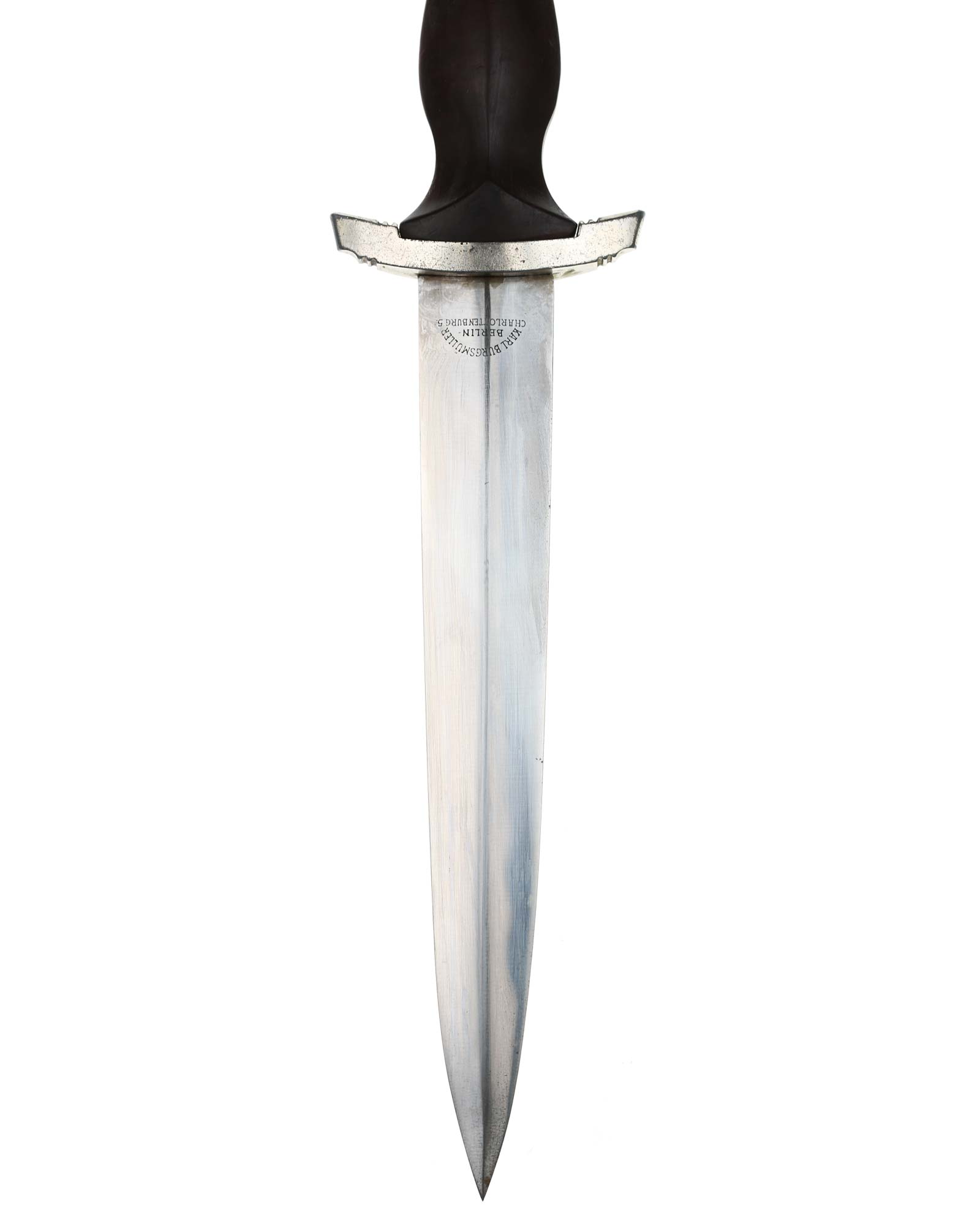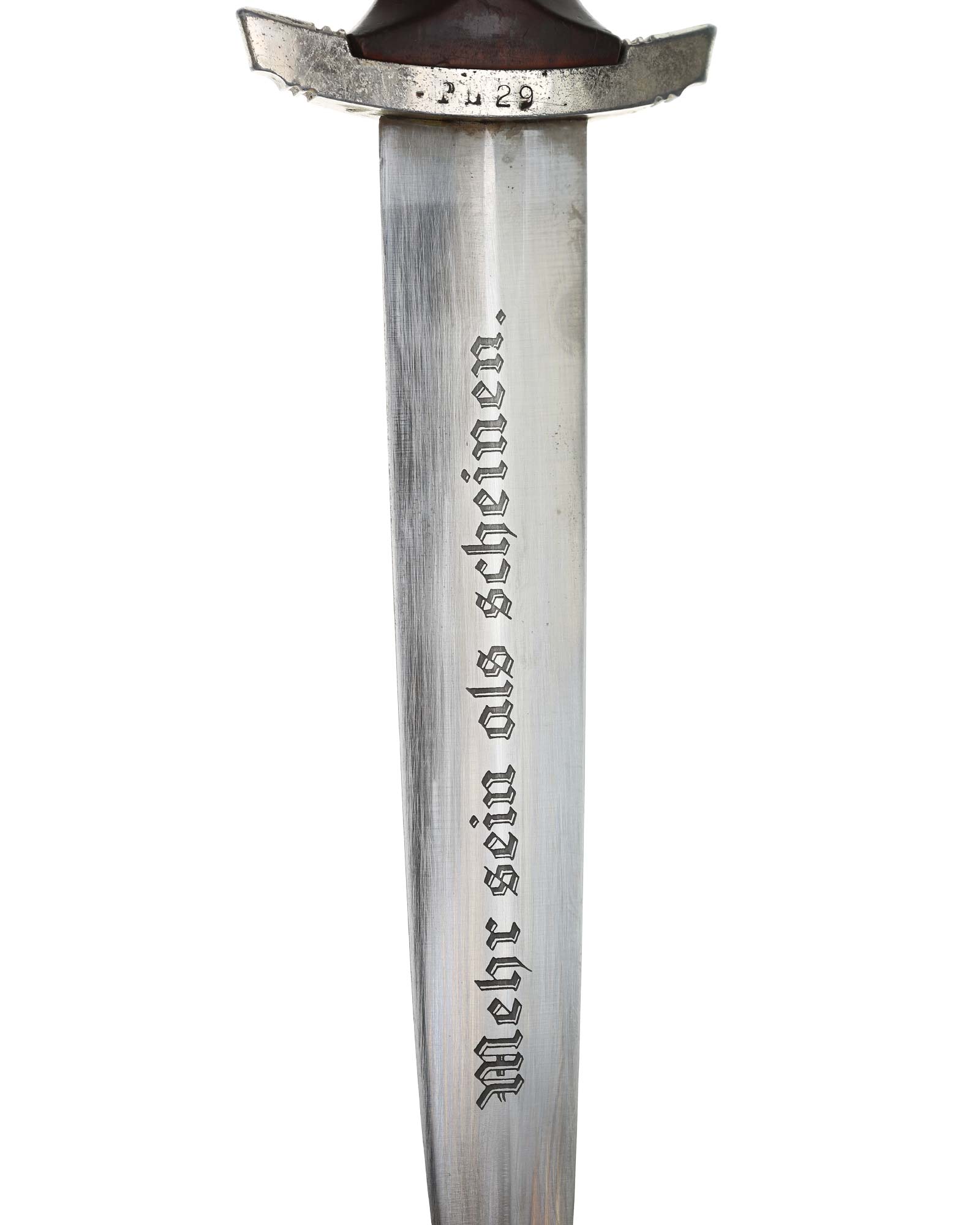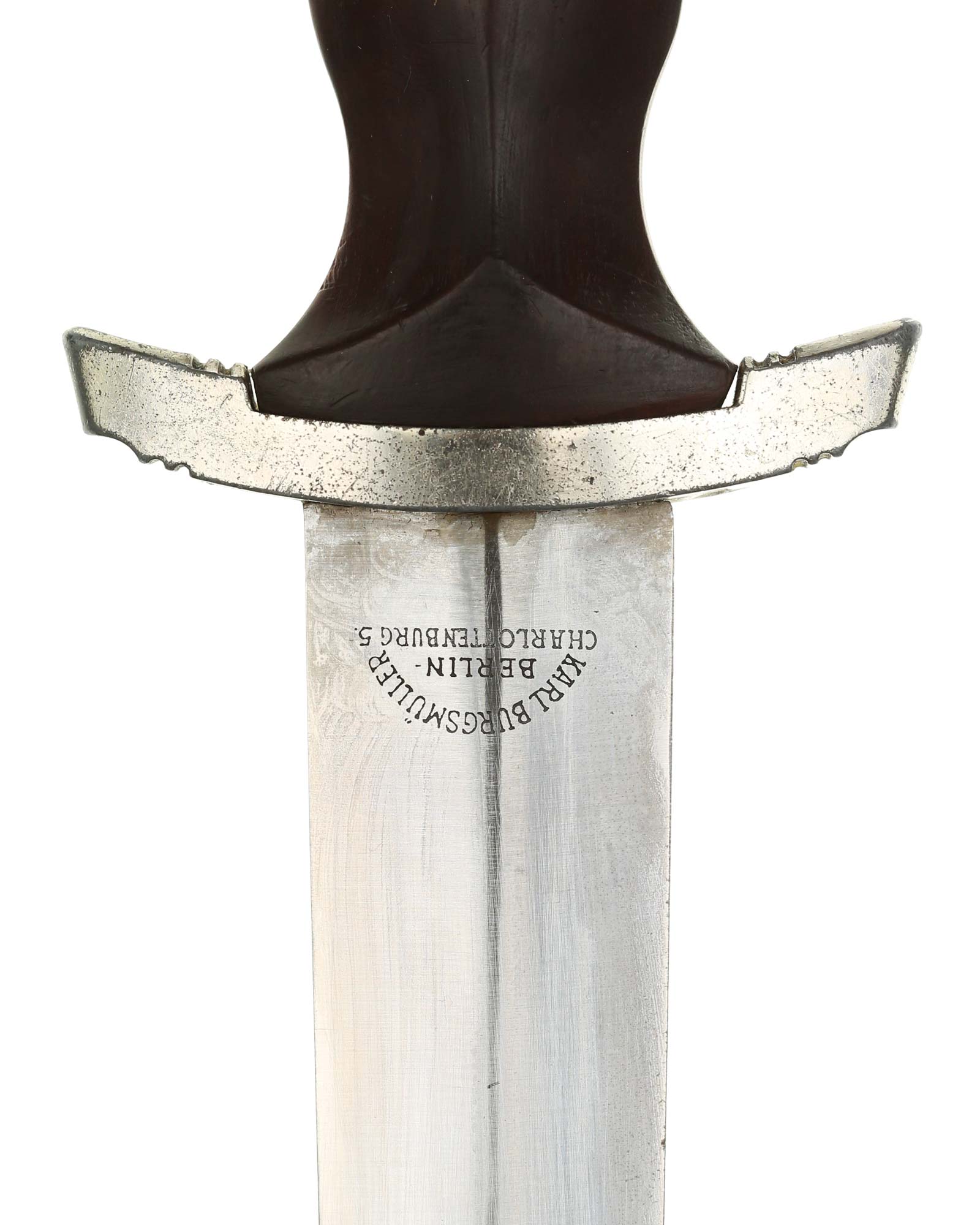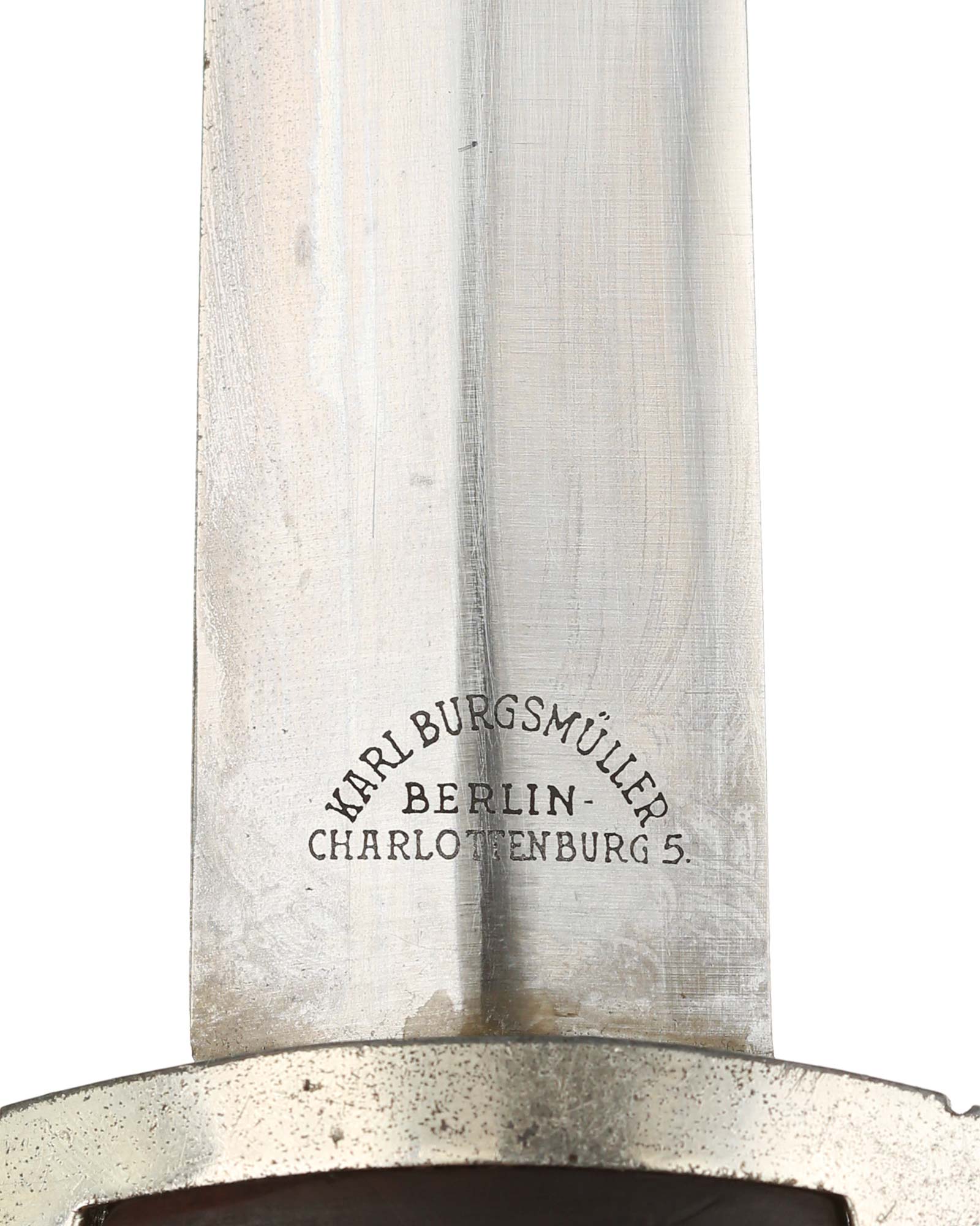 Клинок: Клинок стальной, прямой, двулезвийный, плоский, ромбический, плавно сужающийся к острию, полированный. На лицевой стороне надпись готическим шрифтом «Mehr Sein als Scheinen» — «Больше быть, чем казаться». Клинок маркирован клеймом производителя (дистрибьютор) - Karl Burgsmüller Berlin.