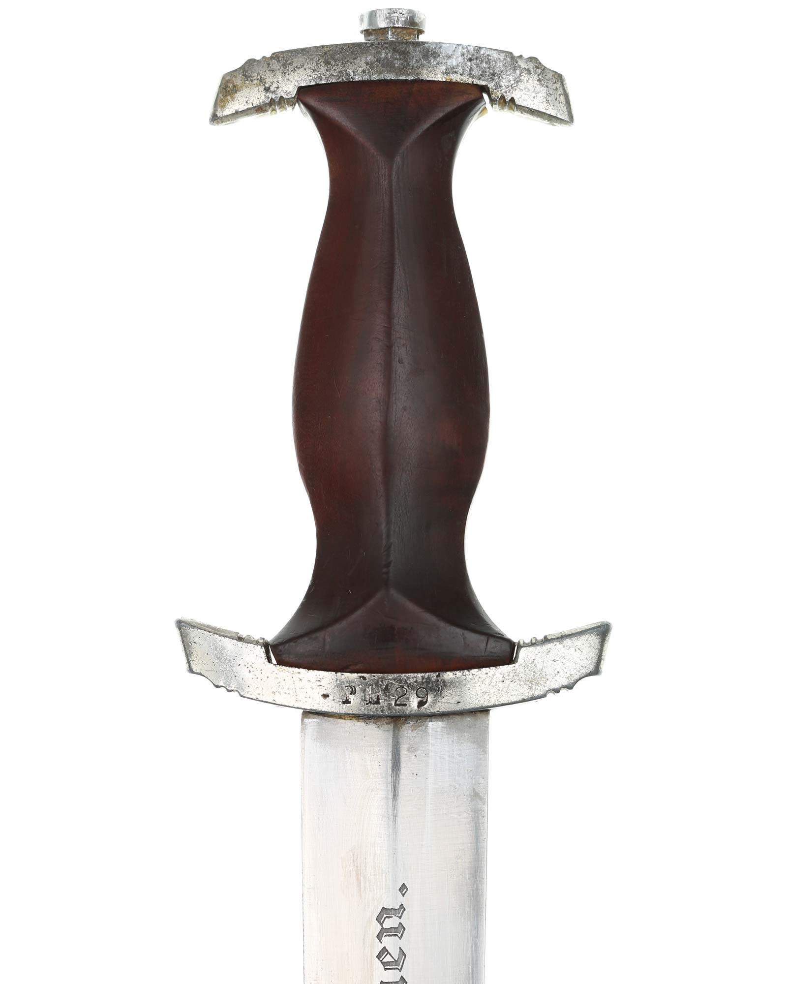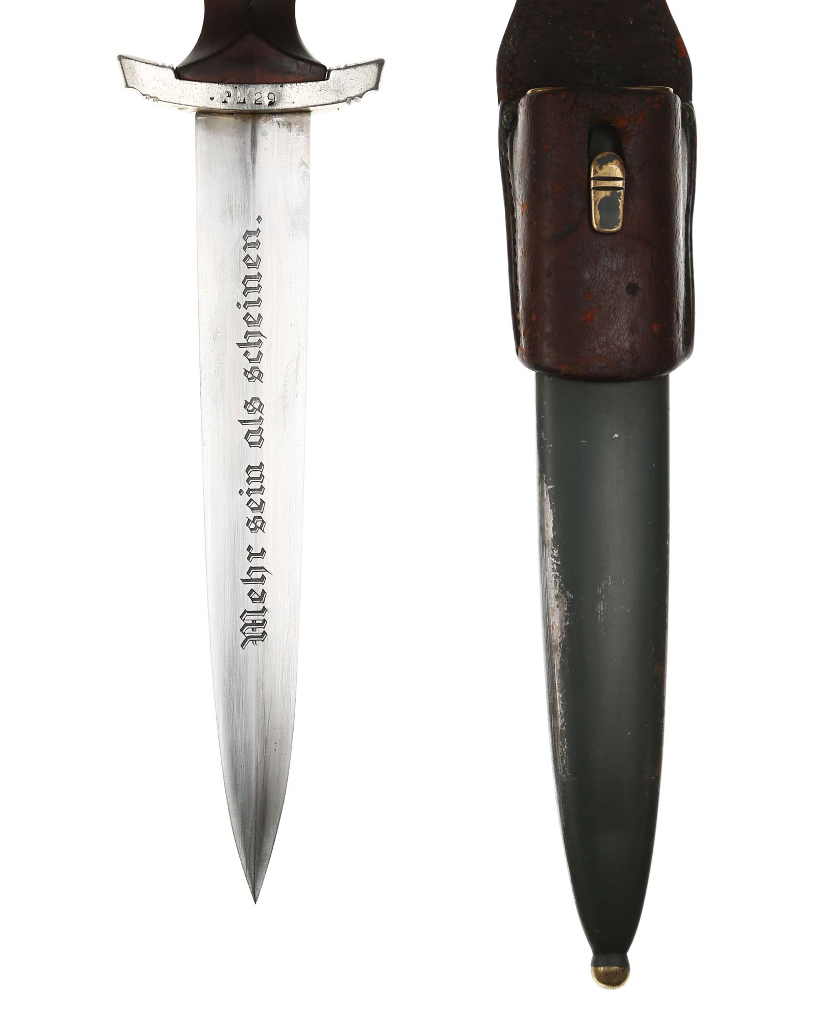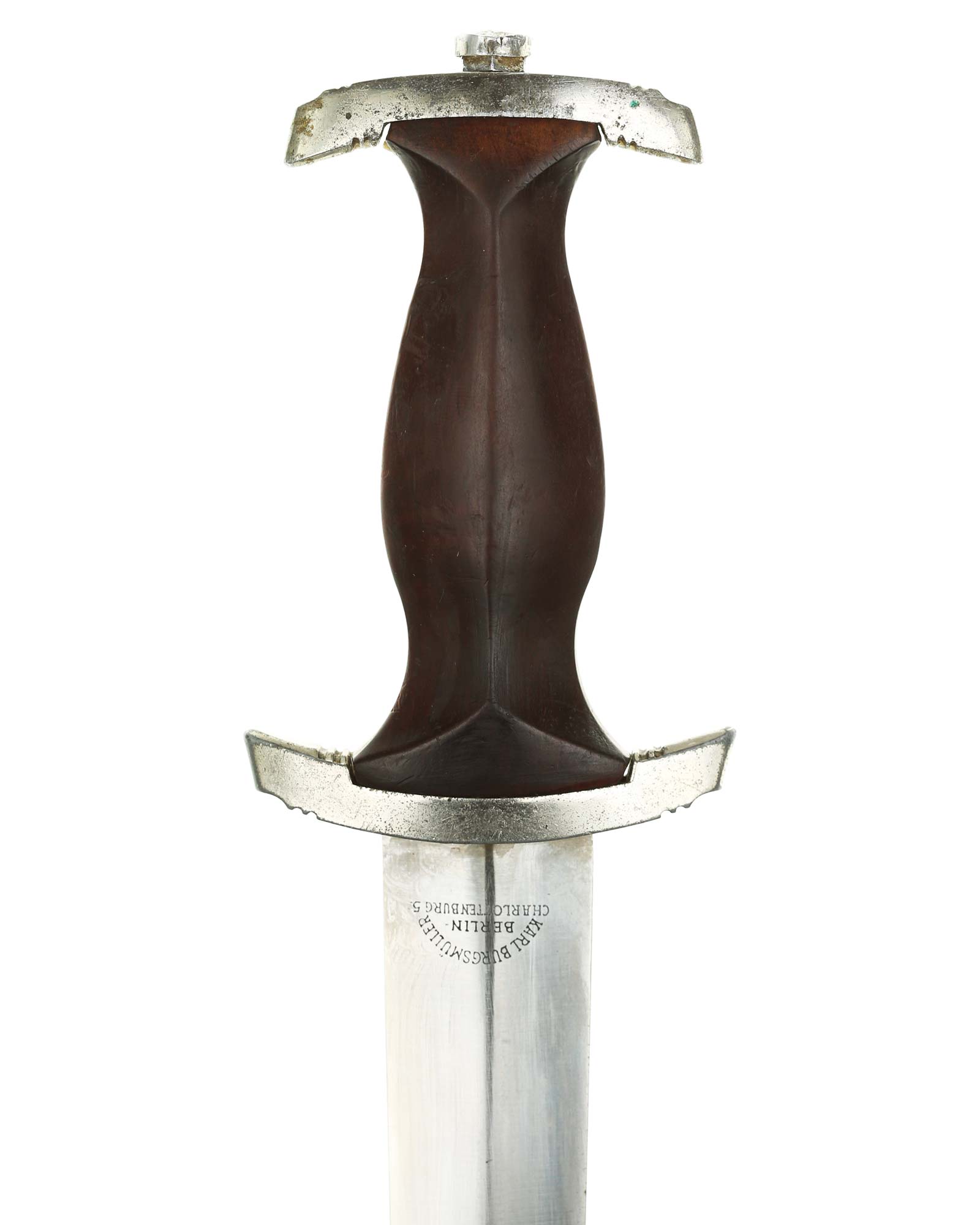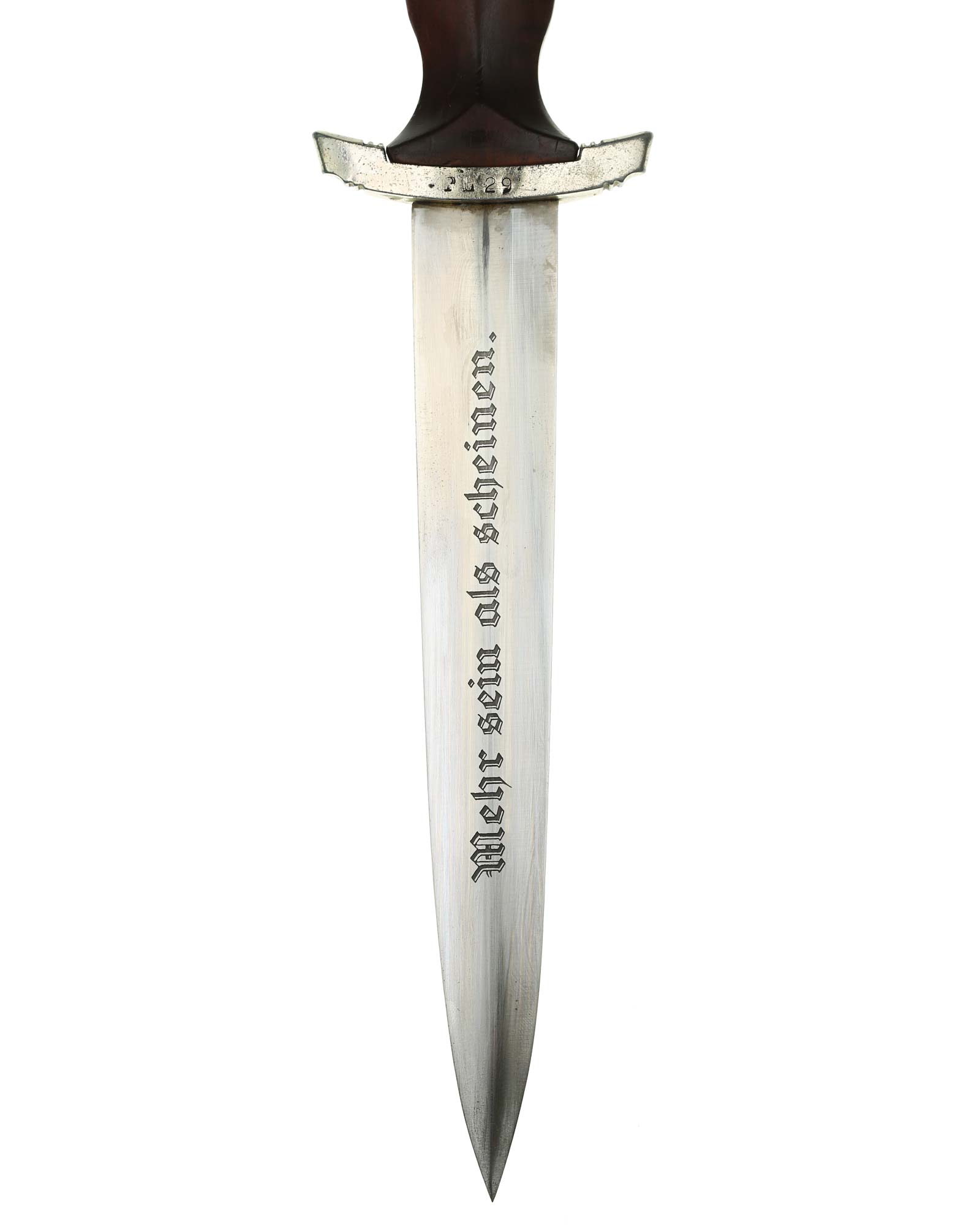 Клинок: Клинок стальной, прямой, двулезвийный, плоский, ромбический, плавно сужающийся к острию, полированный. На лицевой стороне надпись готическим шрифтом «Mehr Sein als Scheinen» — «Больше быть, чем казаться». Клинок маркирован клеймом производителя (дистрибьютор) - Karl Burgsmüller Berlin.