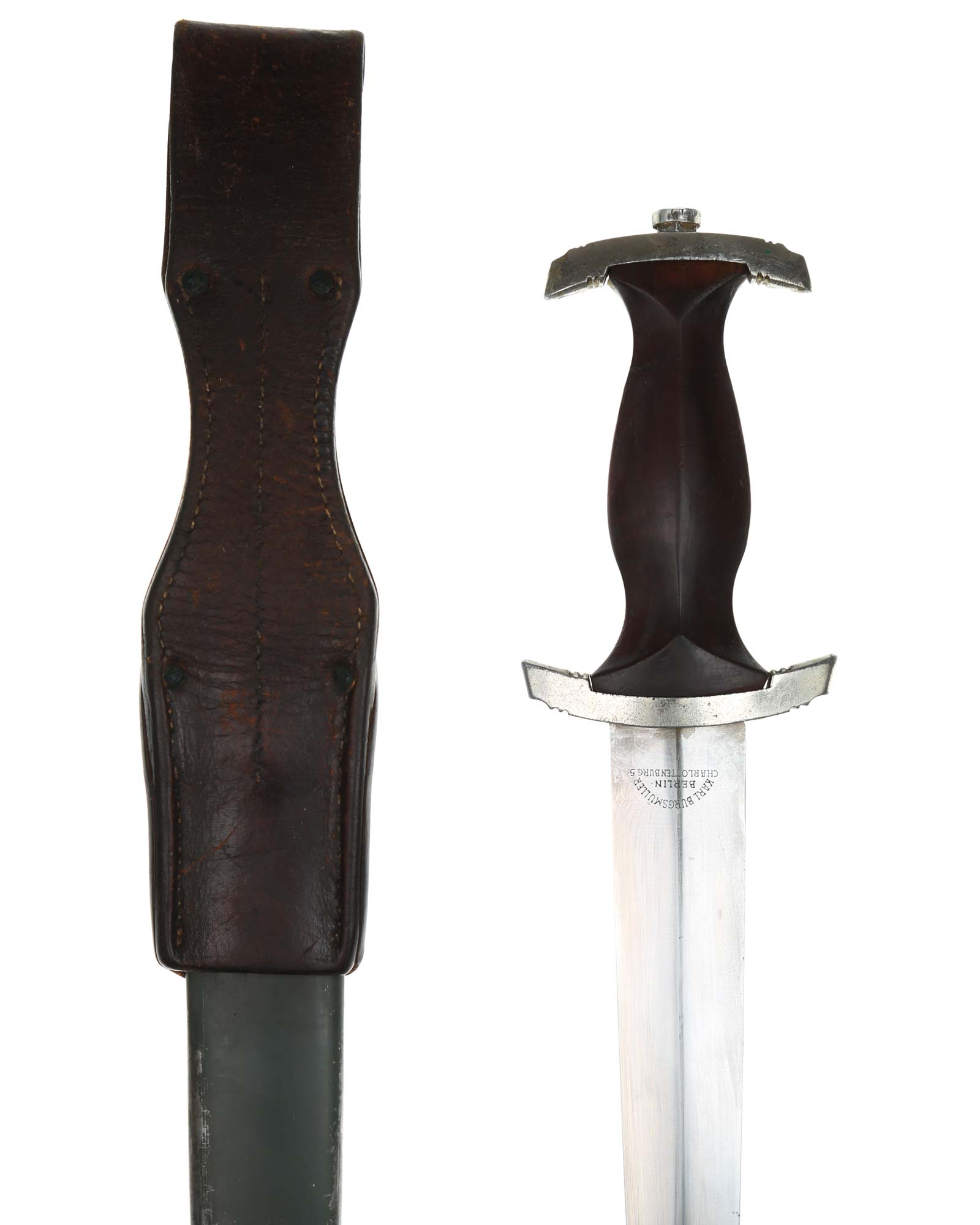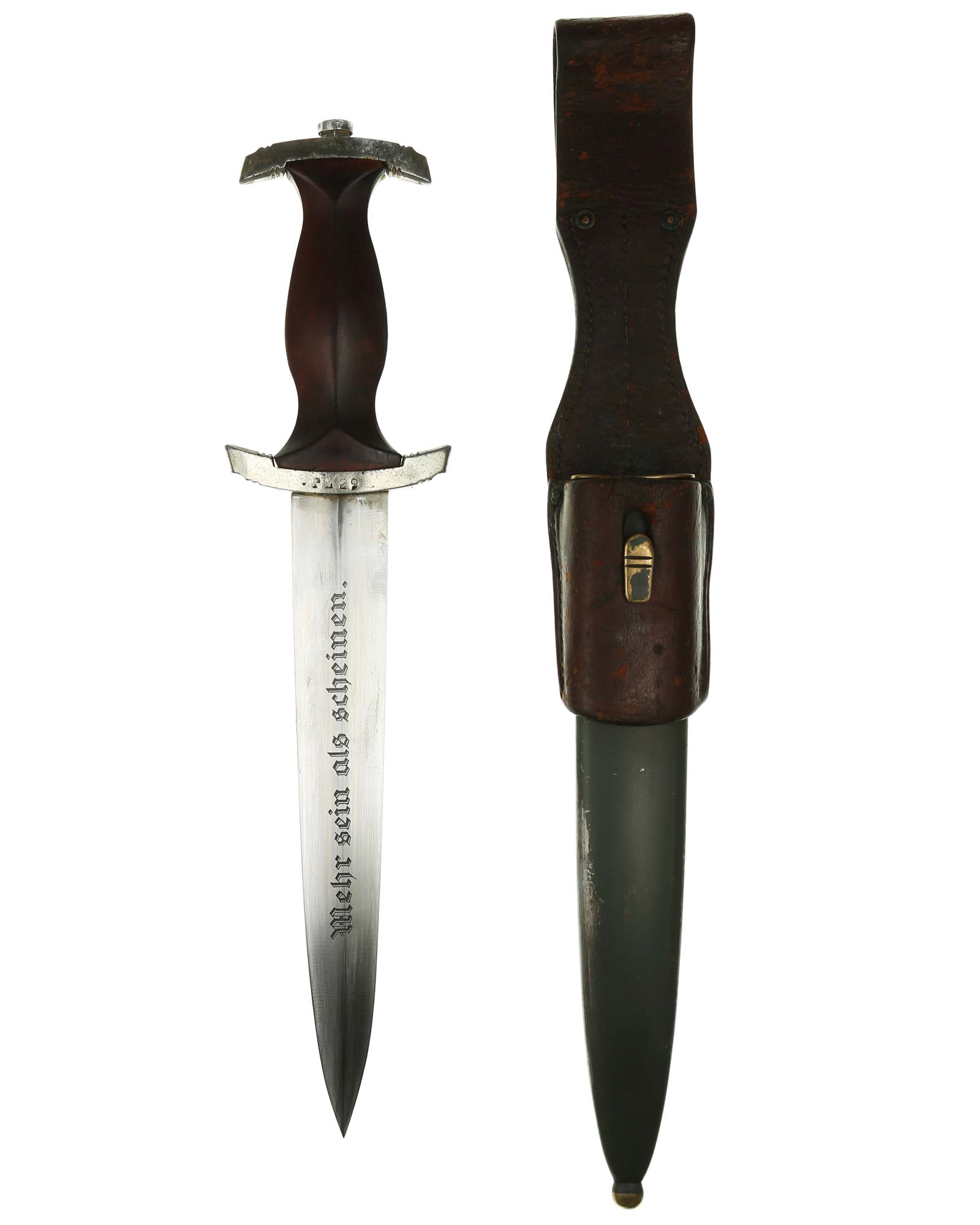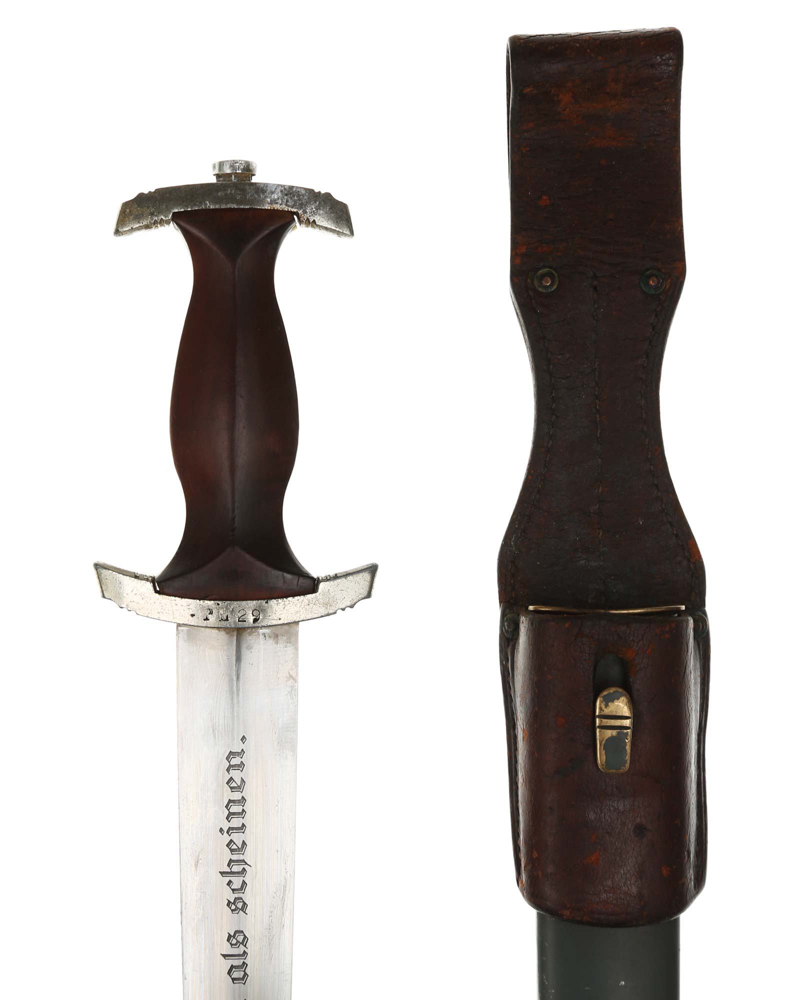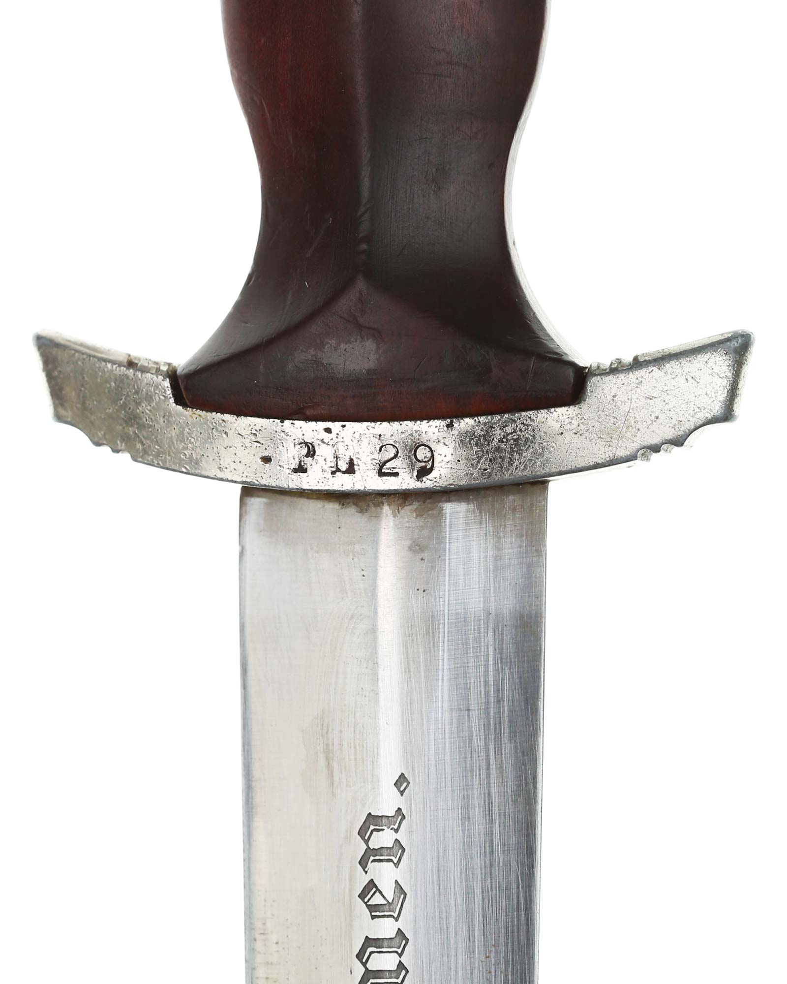 Клинок: Клинок стальной, прямой, двулезвийный, плоский, ромбический, плавно сужающийся к острию, полированный. На лицевой стороне надпись готическим шрифтом «Mehr Sein als Scheinen» — «Больше быть, чем казаться». Клинок маркирован клеймом производителя (дистрибьютор) - Karl Burgsmüller Berlin.