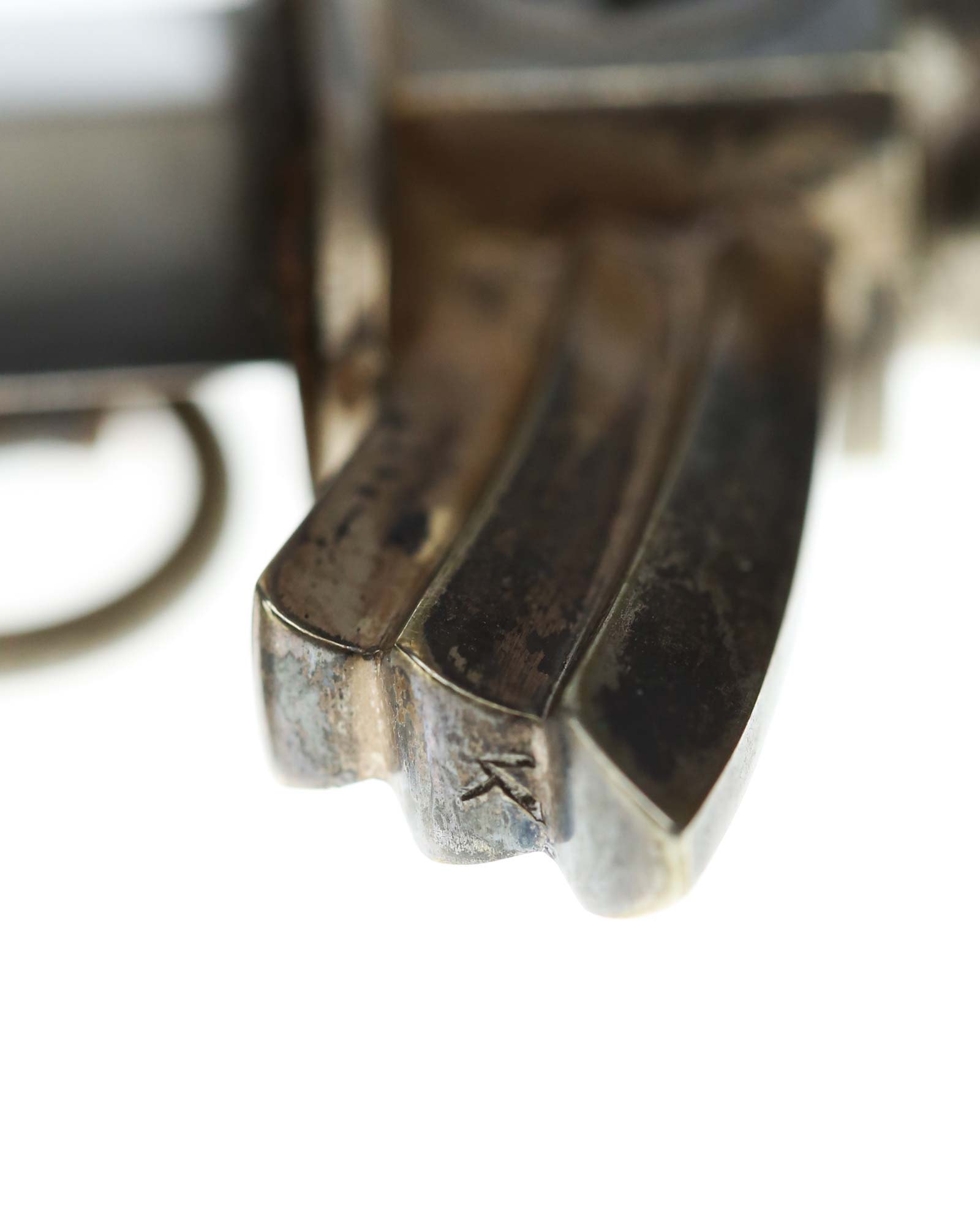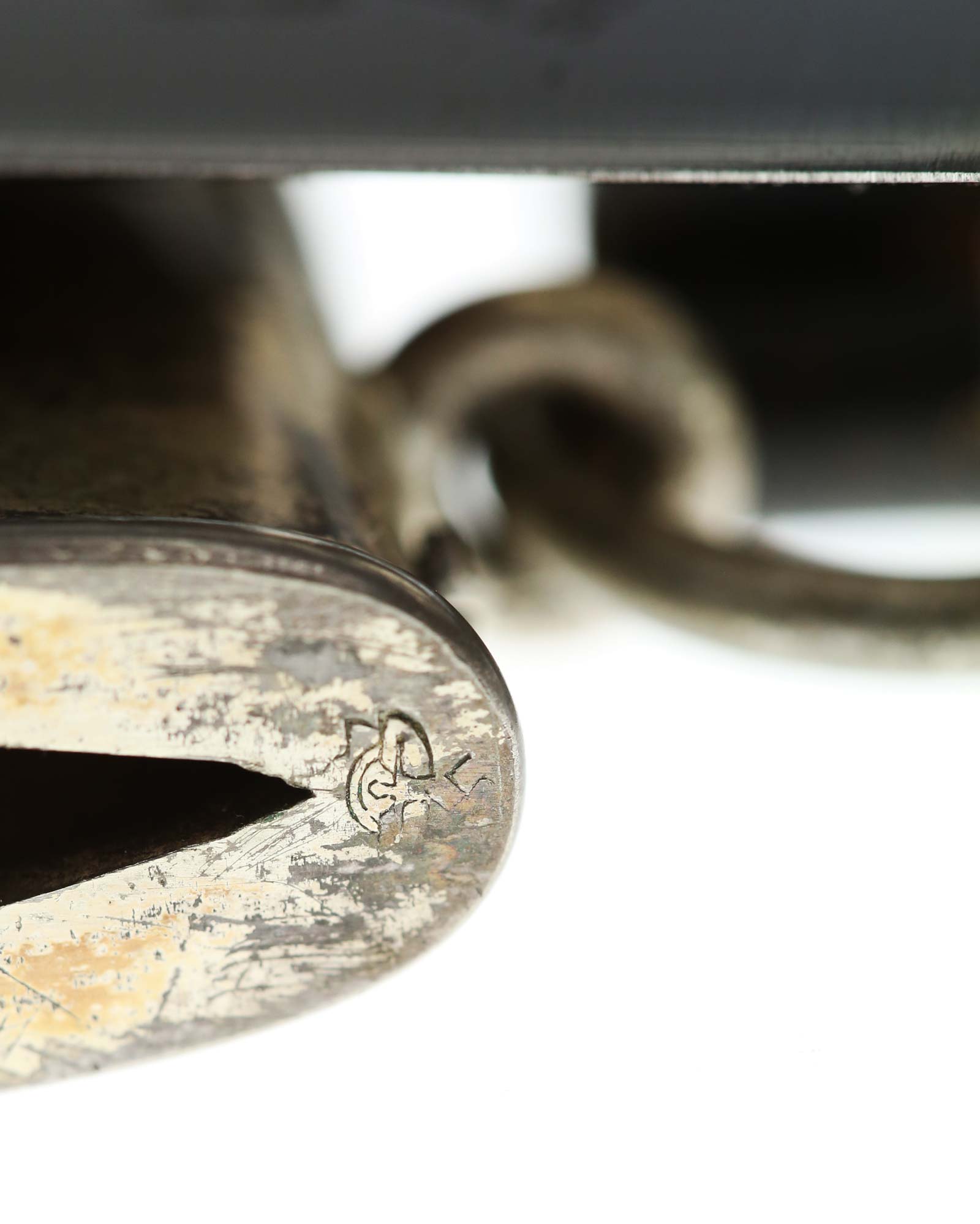 Клинок: Клинок стальной, прямой, ромбического сечения, двулезвийный, никелированный: Основание клинка: нанесено изображение короля, держащего меч и буквы «Stöcker & Co. SMF (Solinger Metallwaren-Fabrik GmbH, Fabrik feiner Stahl- und Metallwaren), Solingen» — клеймо немецкой фирмы производителя Штокер и К., Золинген.
