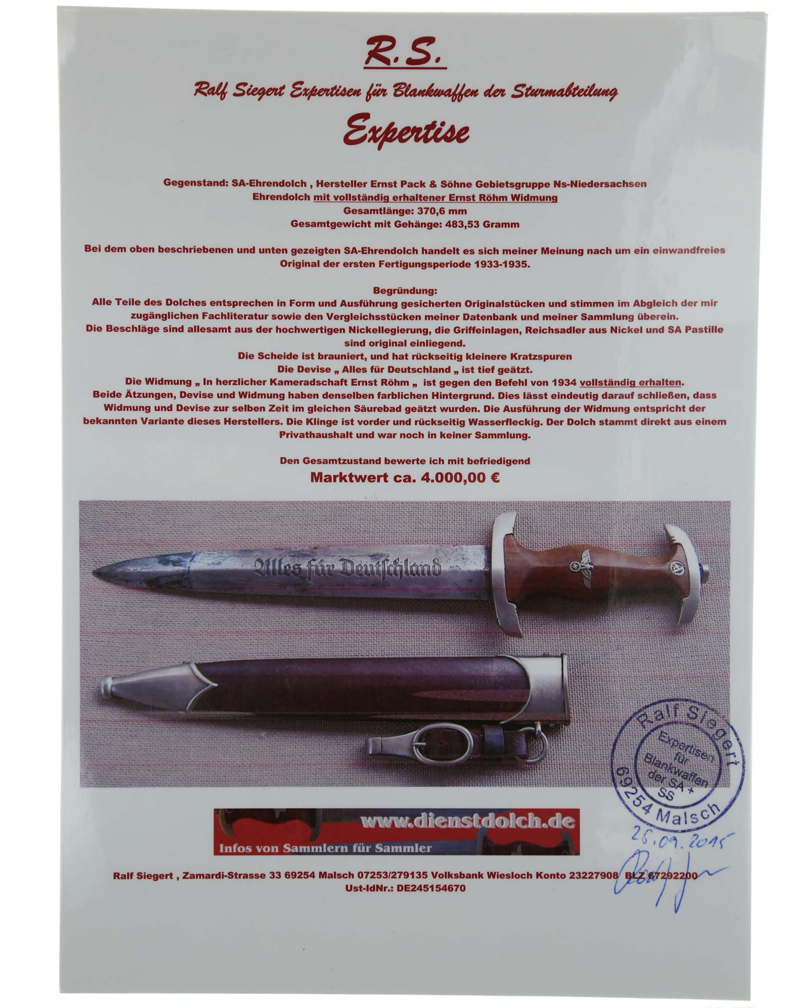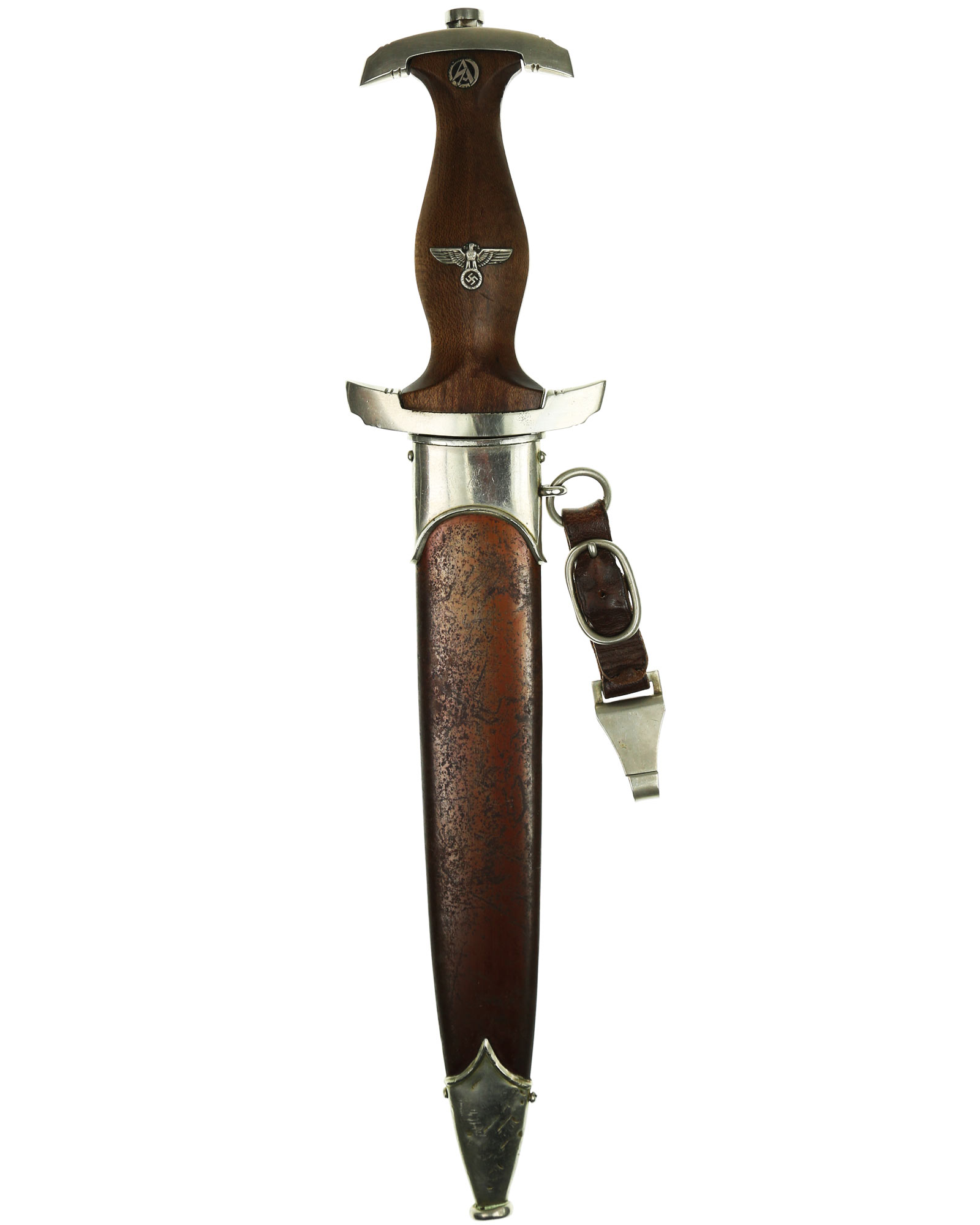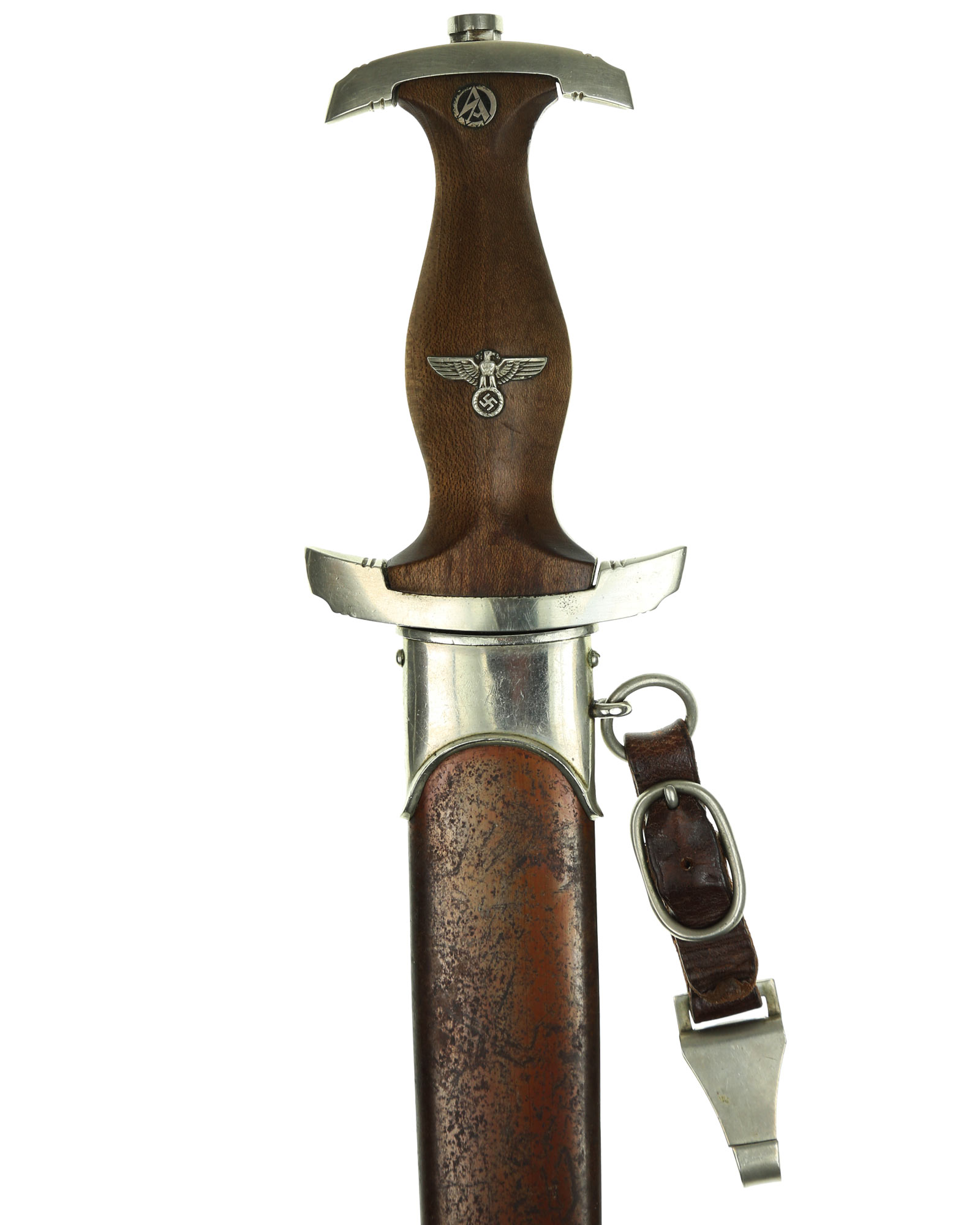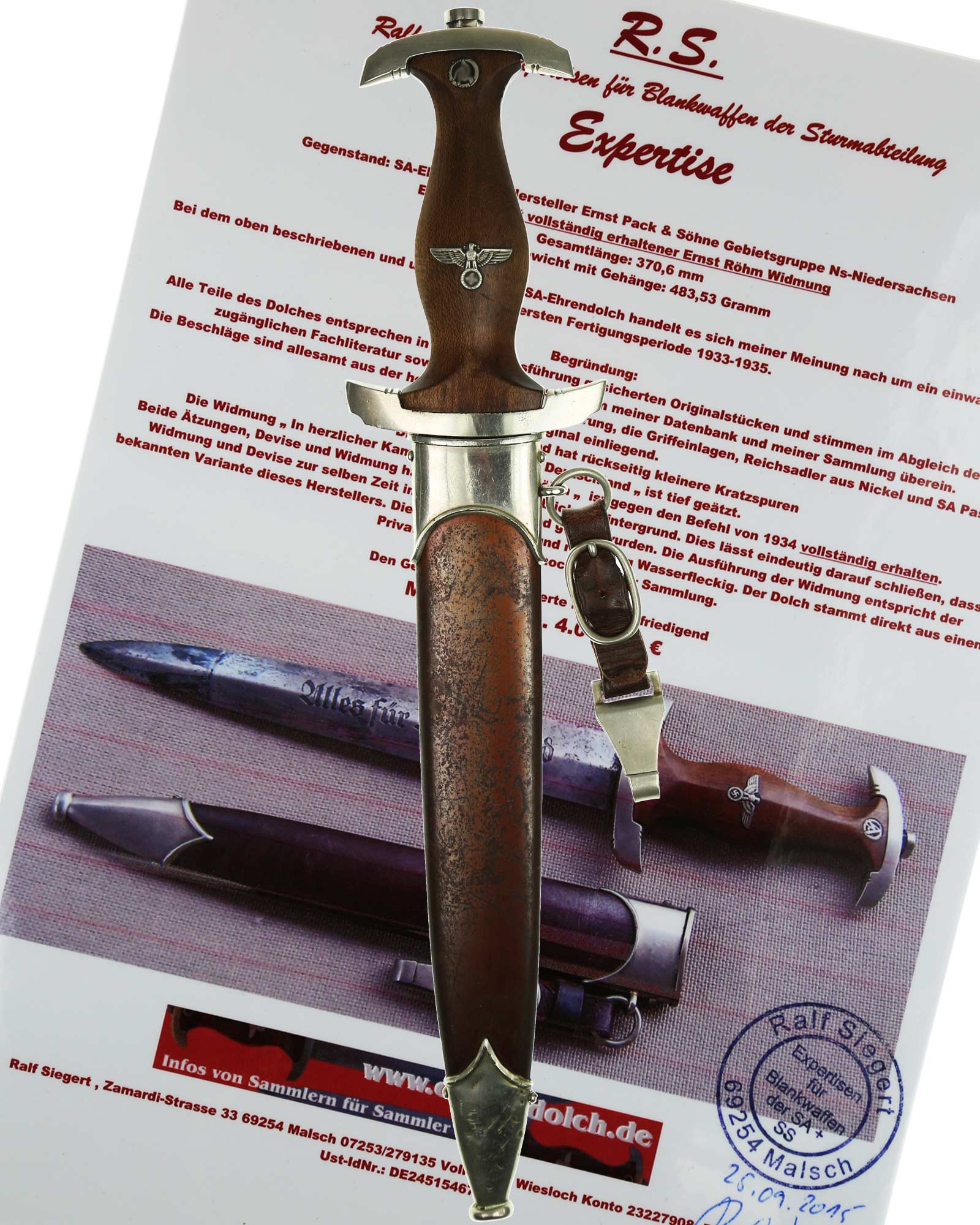 Наградной кинжал штурмовых отрядов СА образца 1933 года. Ранний период производства, 1933-1935 годы c подписью Эрнста Рема: ln herzlicher Kameradschaft Ernst Röhm. Производитель фирма Ernst Pack & Söhne (E. P. & S.), Solingen (Эрнст Пак & сыновья, Золинген). Длина в ножнах 37,1 см.