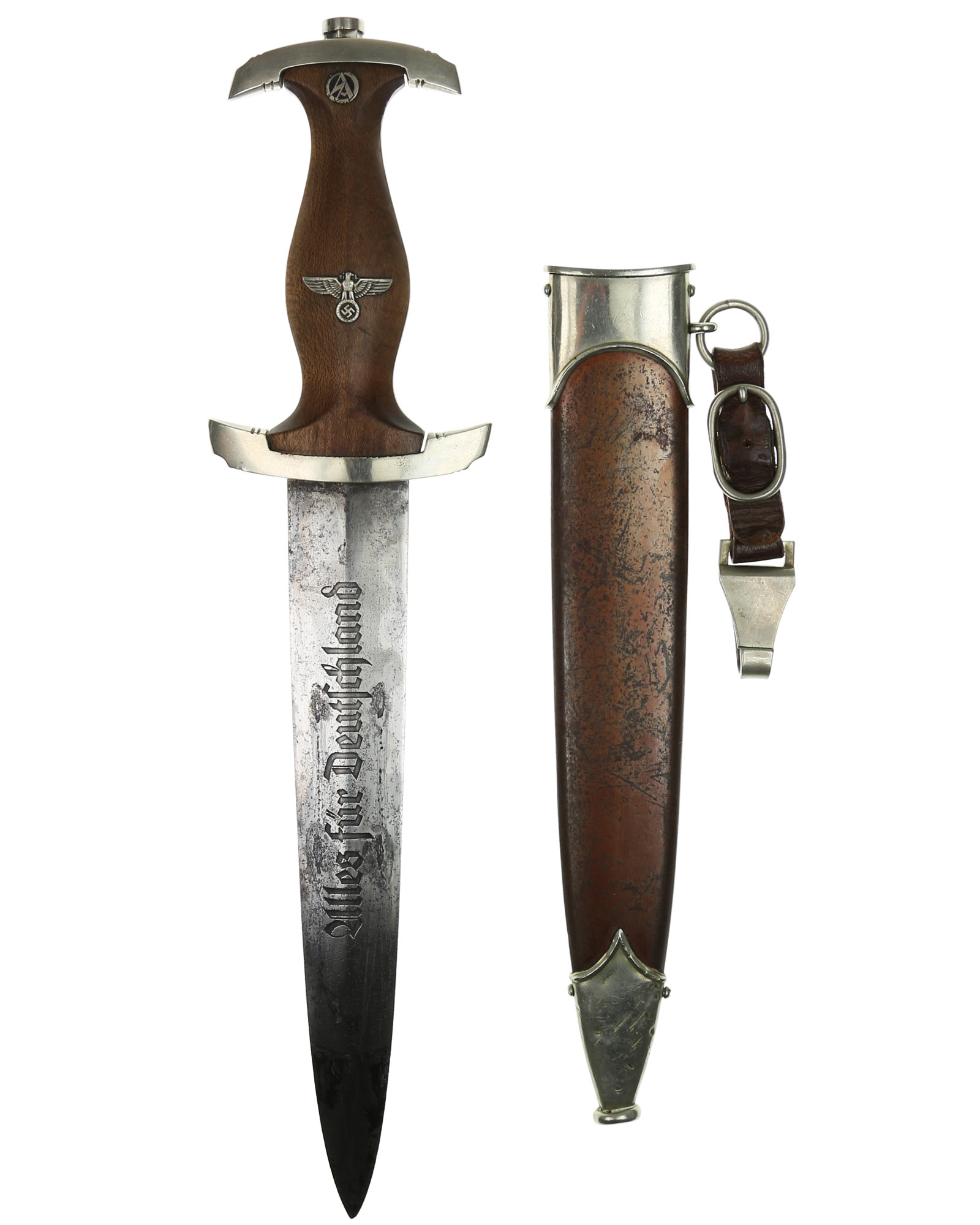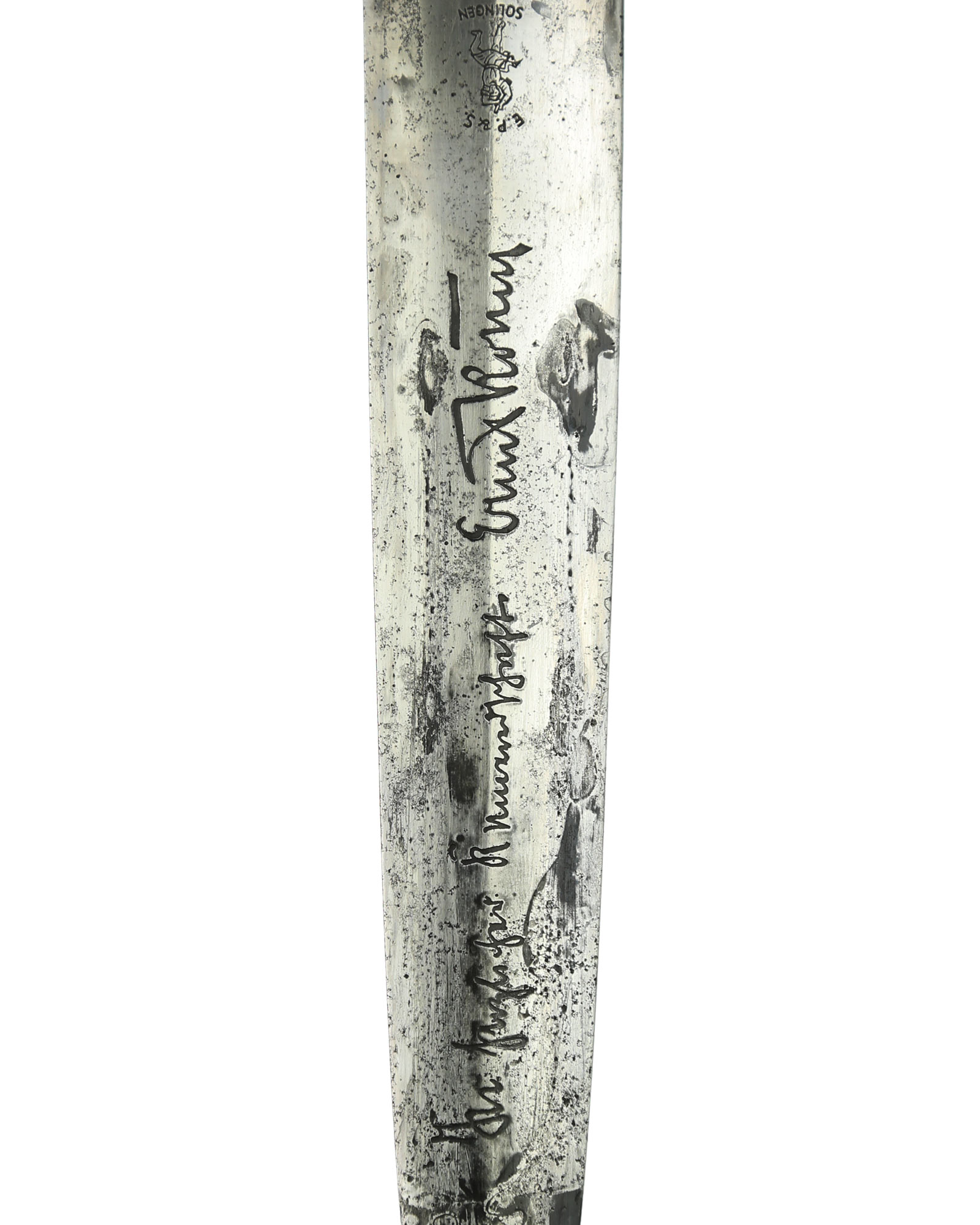 Клинок: Клинок стальной, прямой, двулезвийный, 4-гранный в сечении, без долов. На клинке готическим шрифтом нанесена надпись «Alles für Deutchland» ( «Всё для Германии»). На другой стороне нанесена надпись «ln herzlicher Kameradschaft Ernst Röhm» (В знак сердечной дружбы Эрнст Рём). Надписи и клейма: возле пяты клинка с тыльной стороны – травлёное клеймо в виде человека на замахе и надпись «E.P.&S.» — клеймо немецкой фирмы «Эрнст Пак & сыновья, Золинген».